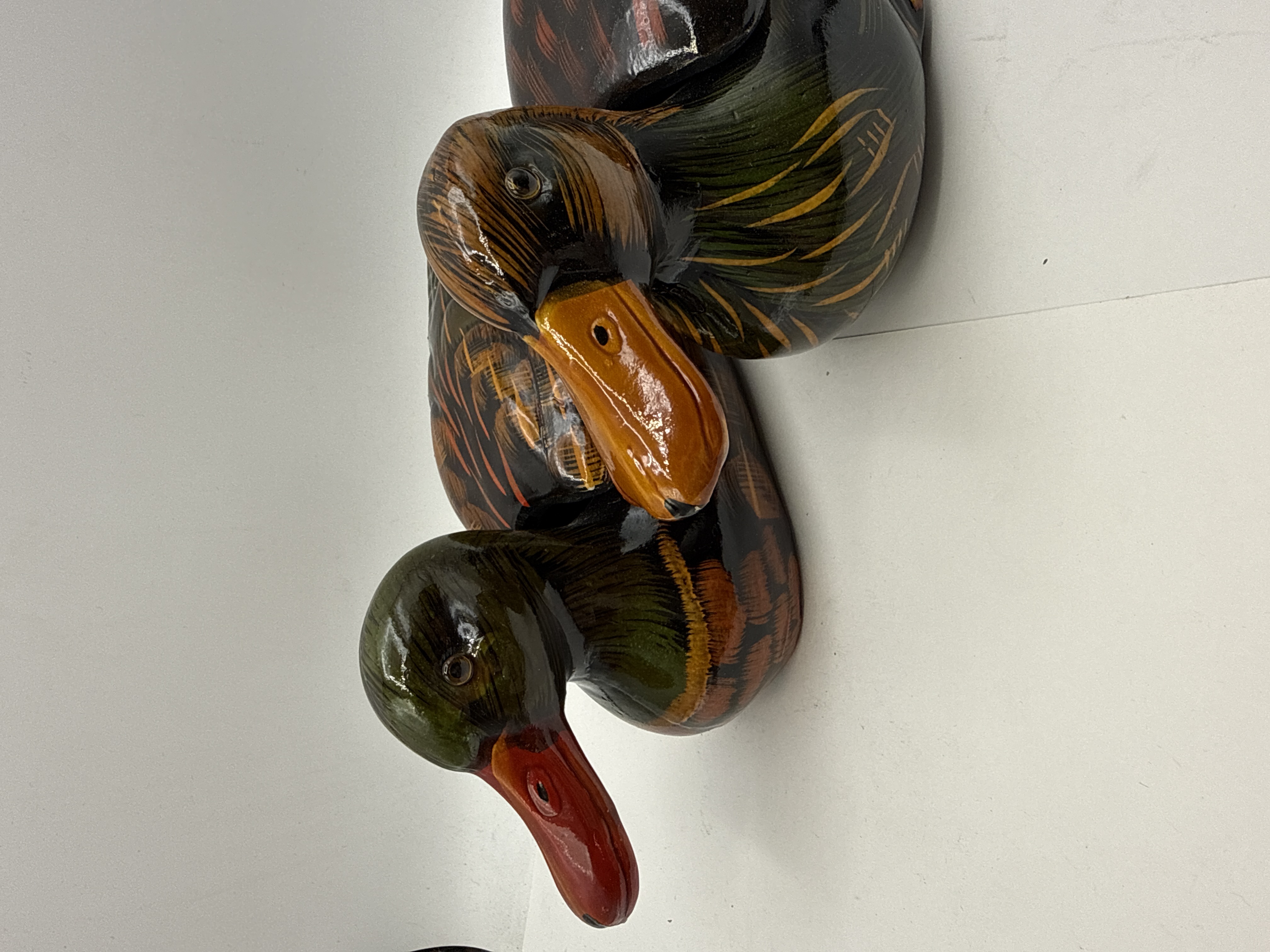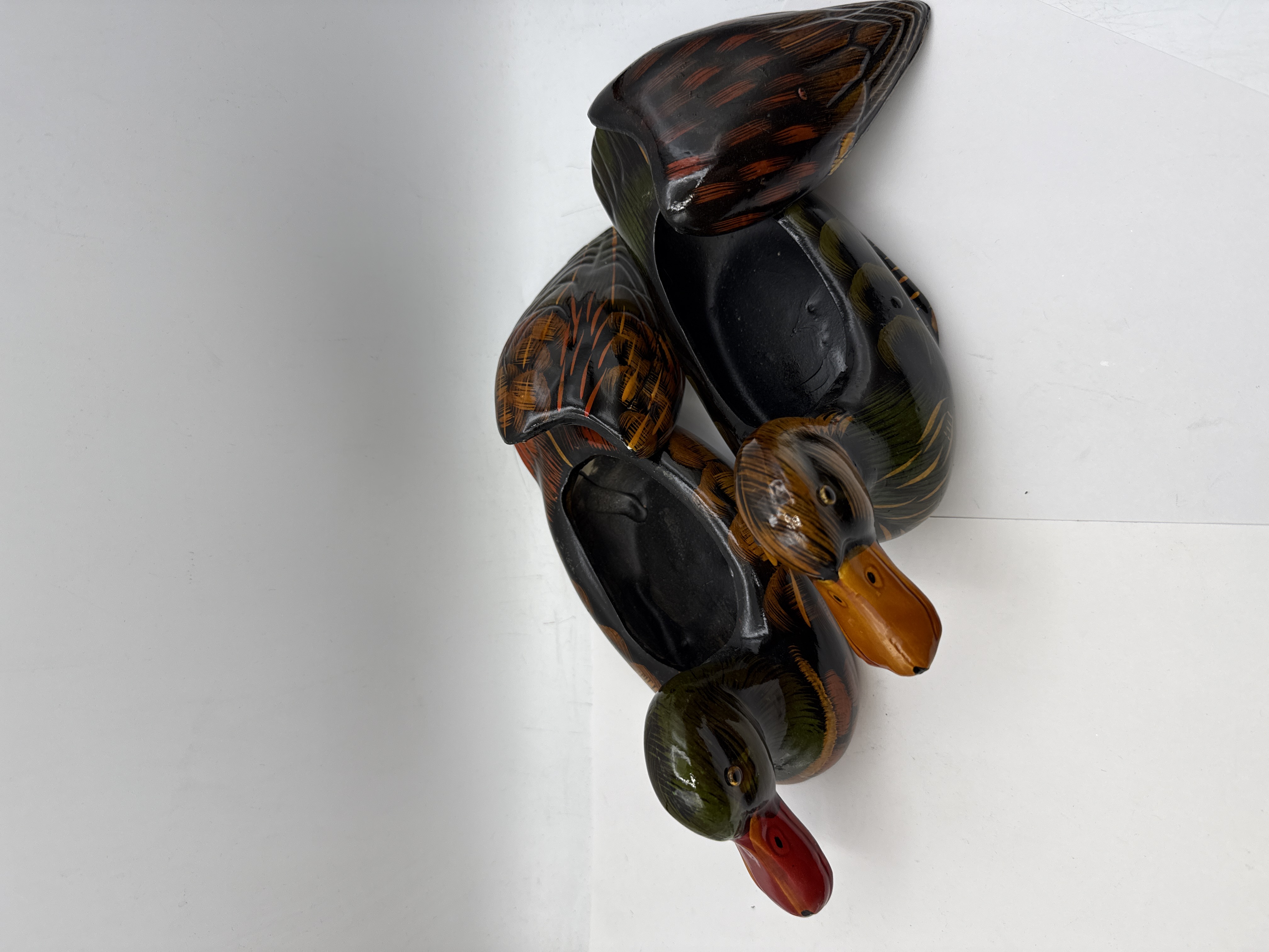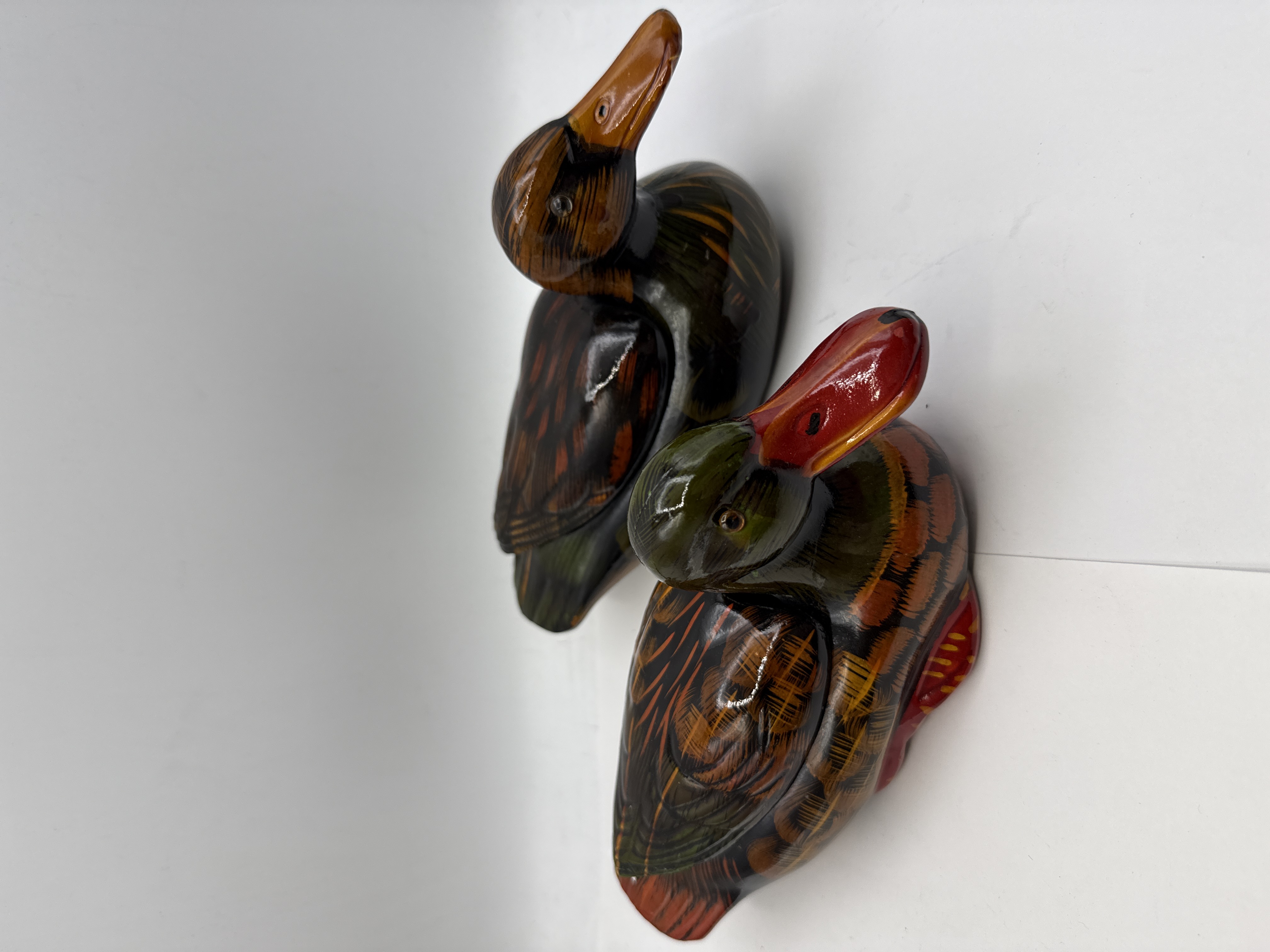 A pair of decorative lidded containers or trinket boxes designed in the form of resting Mandarin ducks. These items are constructed from a composition material or resin with a high-gloss, lacquer-style finish. The decoration is executed in a stylized folk-art manner, featuring vibrant colours over a dark base. One duck is depicted with a green-toned head and a bright red bill, while the second features a brown and orange-toned head with an orange bill. Both pieces are detailed with over-painted feather patterns in shades of orange, brown, and green. The upper half of each duck serves as a removable lid, revealing a solid dark-glazed interior. These items are traditionally used as Feng Shui symbols representing love and fidelity. No manufacturer marks or signatures are present.