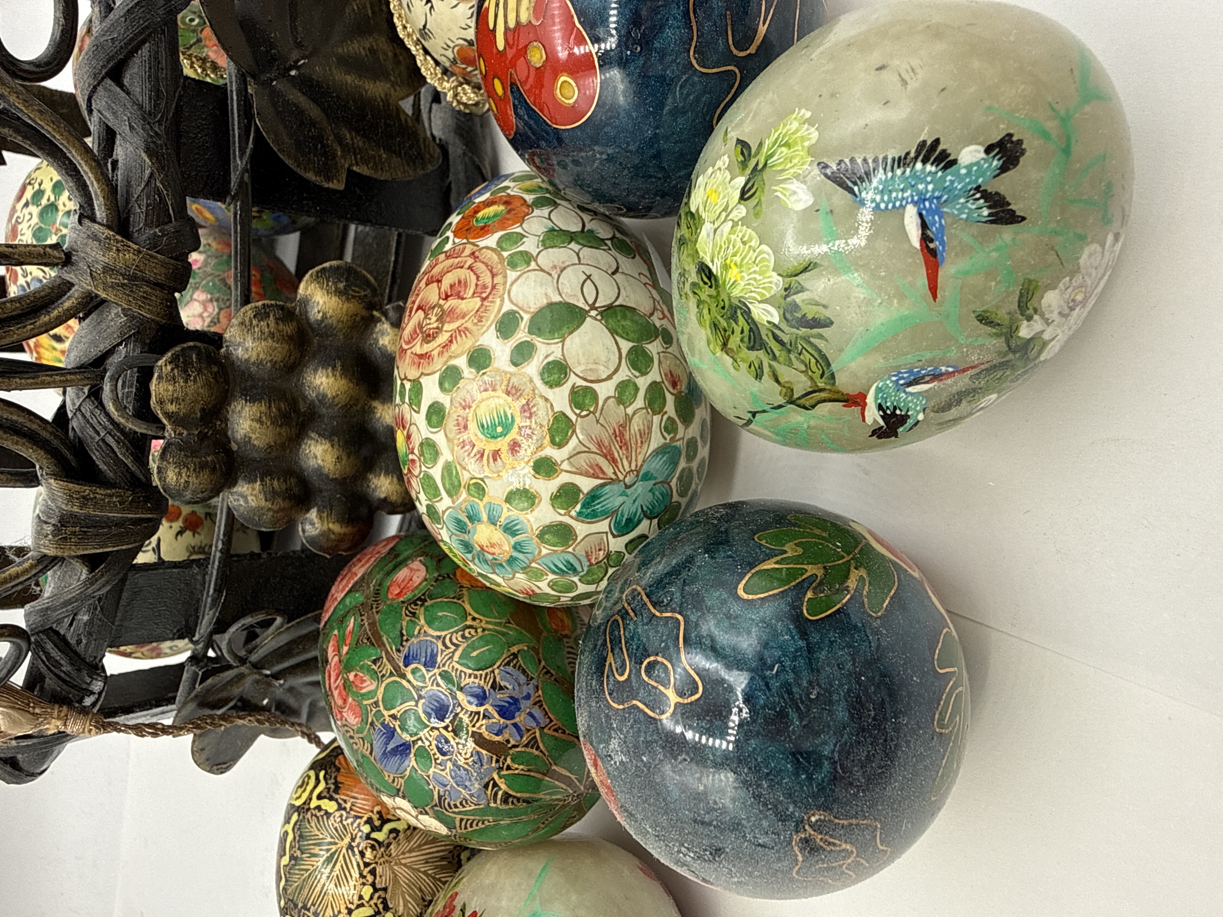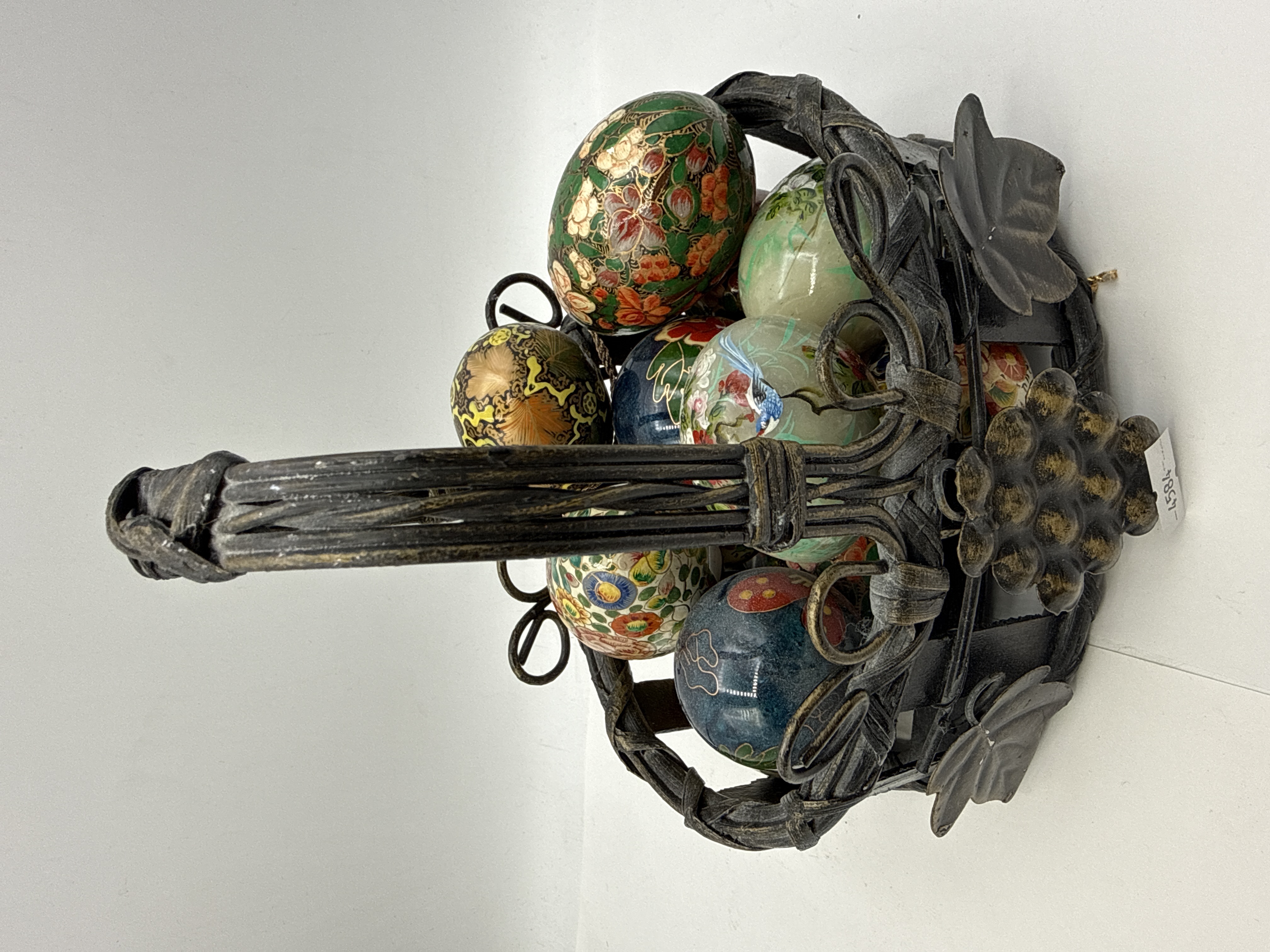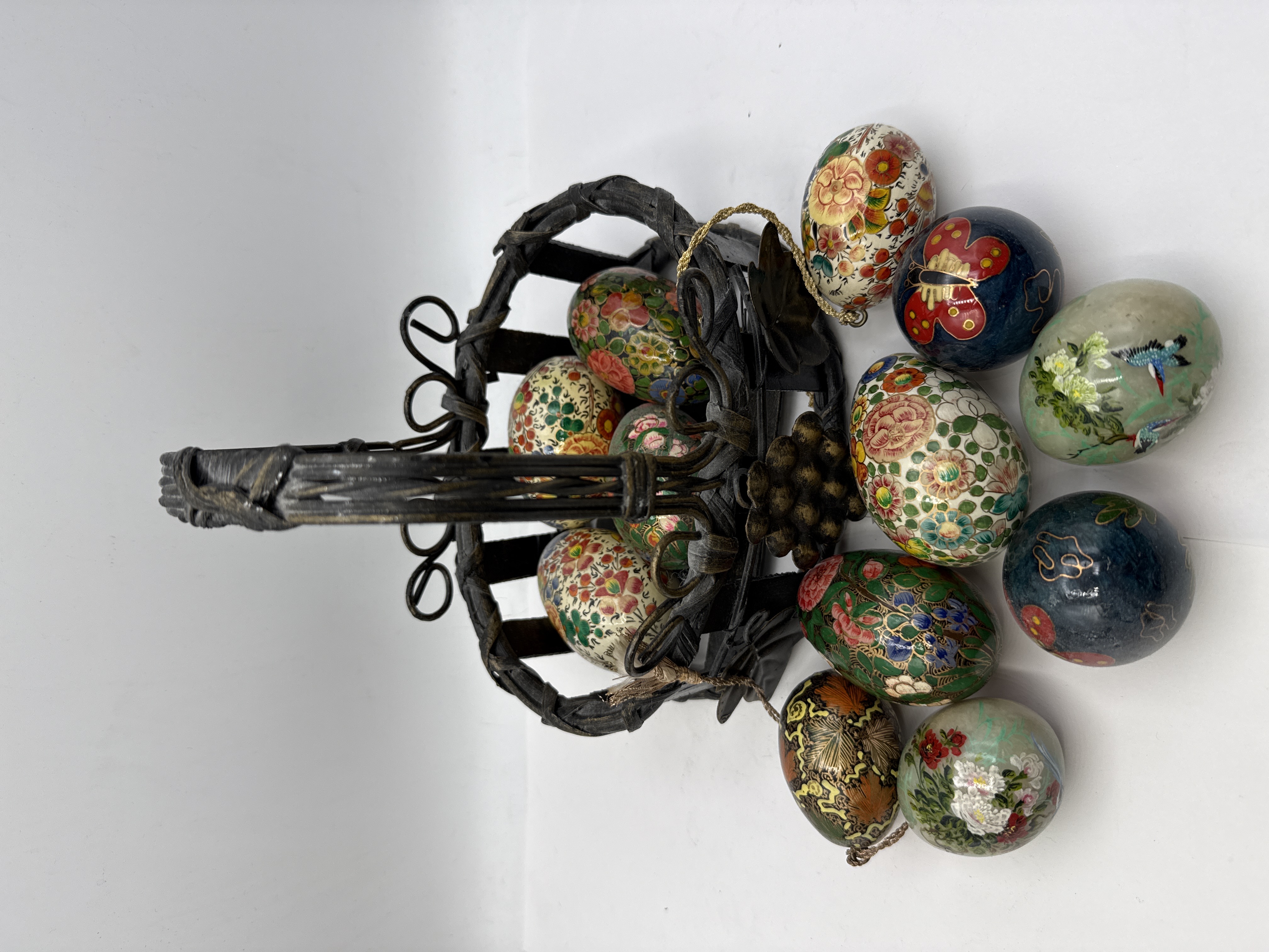 A collection of decorative eggs featuring a variety of materials and traditional motifs. The group includes several examples of hand-painted lacquer over wood or composite bases, decorated with polychrome floral sprays, butterflies, and birds, including a kingfisher. Some examples are finished with gilt-heightened detailing in a folk-art style. The collection also contains eggs carved from translucent hardstone, with one example featuring painted floral and avian decoration. The items are housed in a dark-patinated wrought-metal basket designed with a twisted faux-wicker handle and a scrollwork frame adorned with applied grape clusters and vine leaves. No maker’s marks, hallmarks, or signatures are visible on any of the pieces. The collection is of 20th-century manufacture.