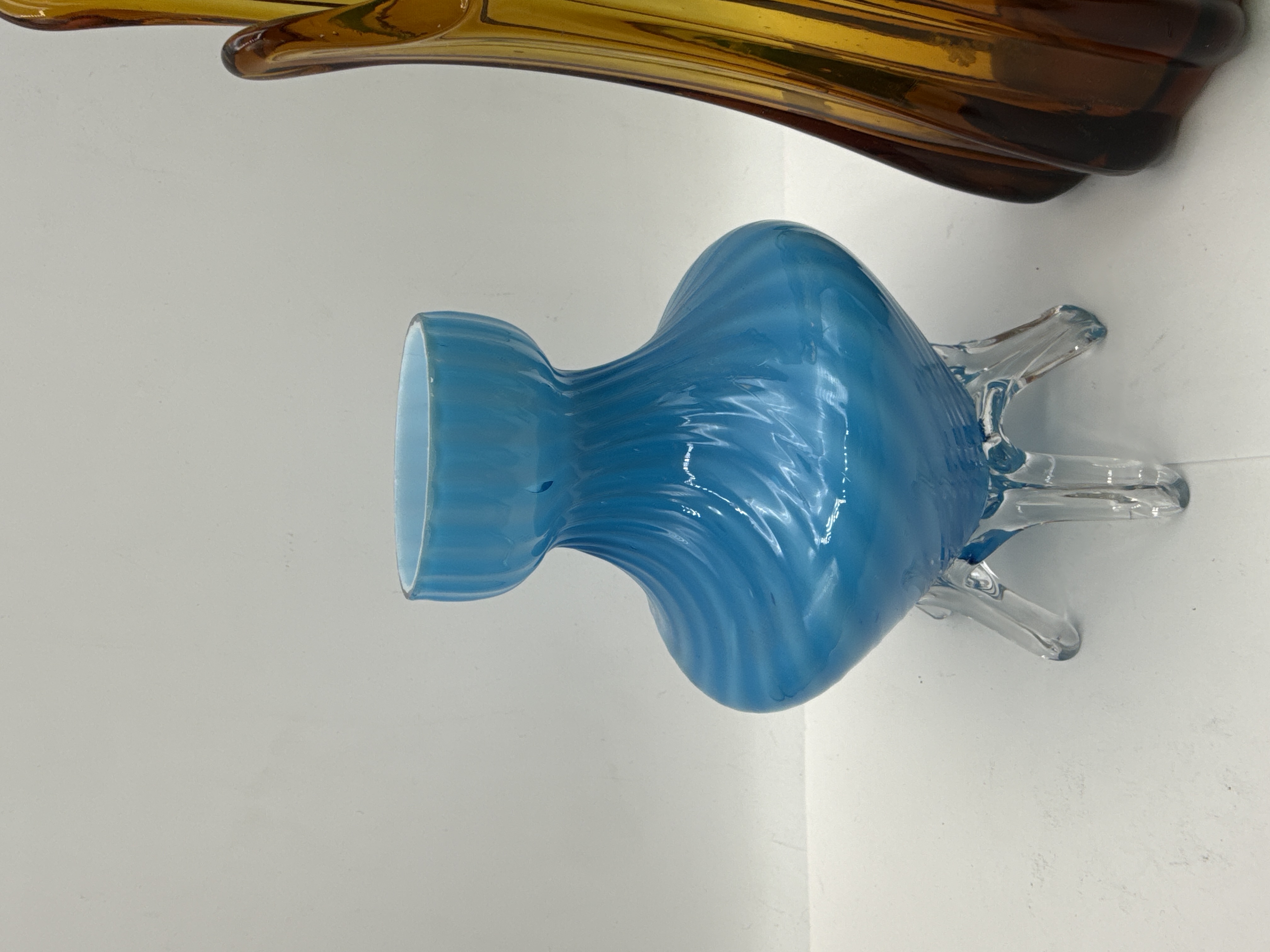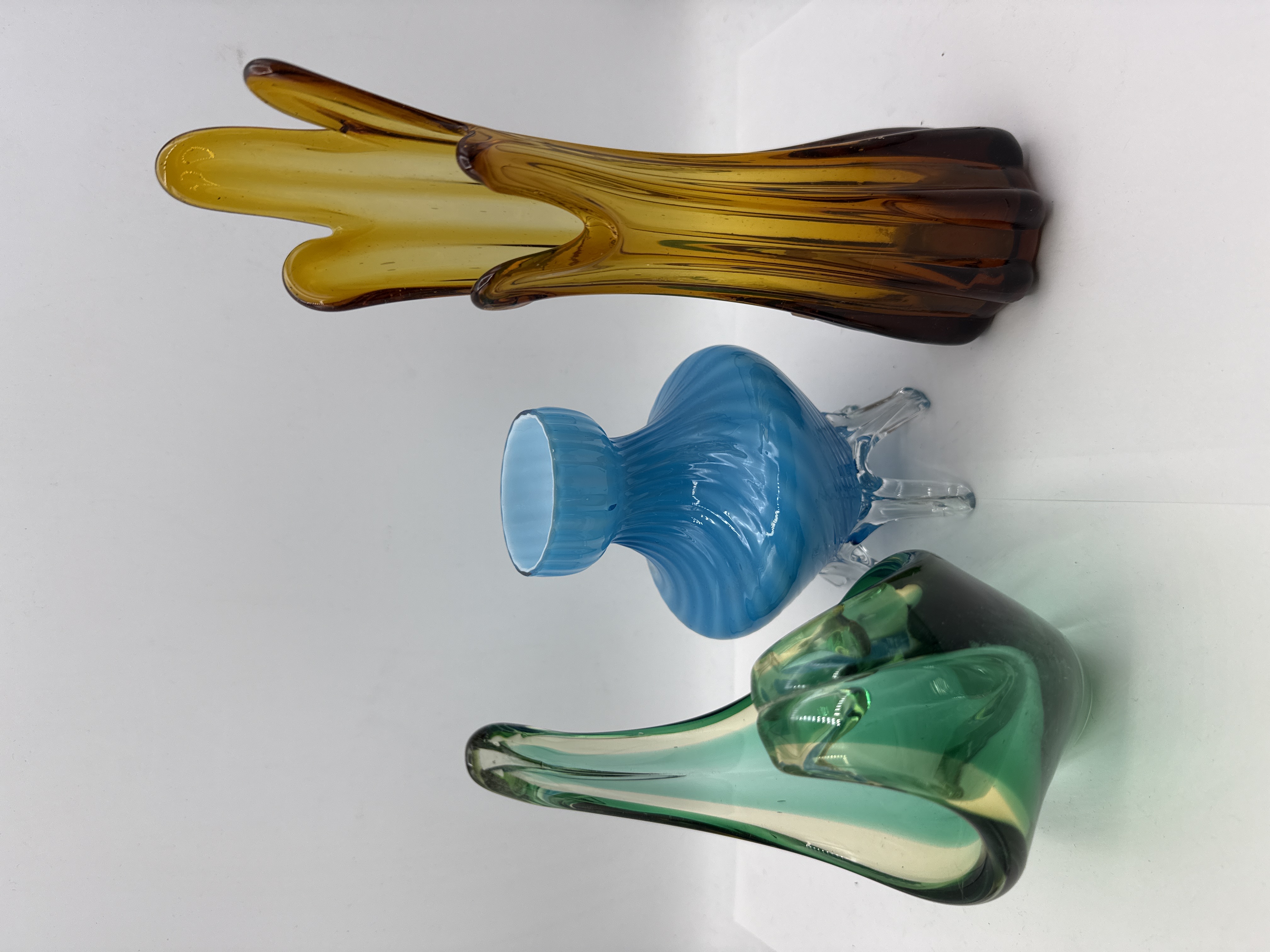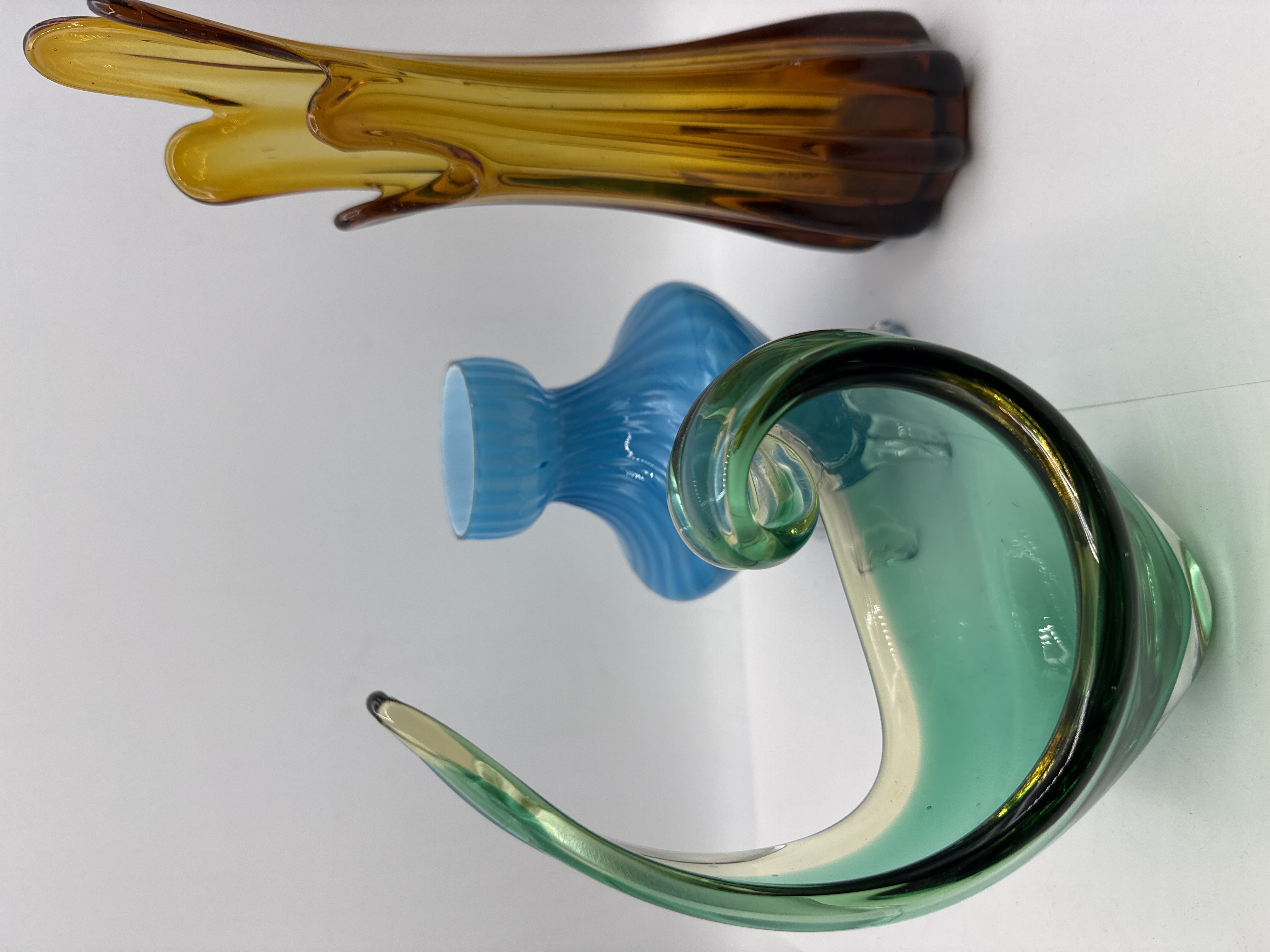 A collection of three mid-century modern style art glass pieces, comprising two vases and a decorative dish. The first item is a tall amber-coloured hand-blown glass swing vase, featuring a pulled three-lobed rim and vertical ribbing extending towards a heavy, solid base. The second item is an aqua blue cased glass vase in the style of Murano art glass, featuring an opaque white interior and a flared ribbed rim, supported by a clear glass base with four pulled feet. The third item is a green art glass dish with a clear glass base, featuring a pulled scroll rim and graduated green tones. No maker marks or signatures are visible on any of the pieces.
