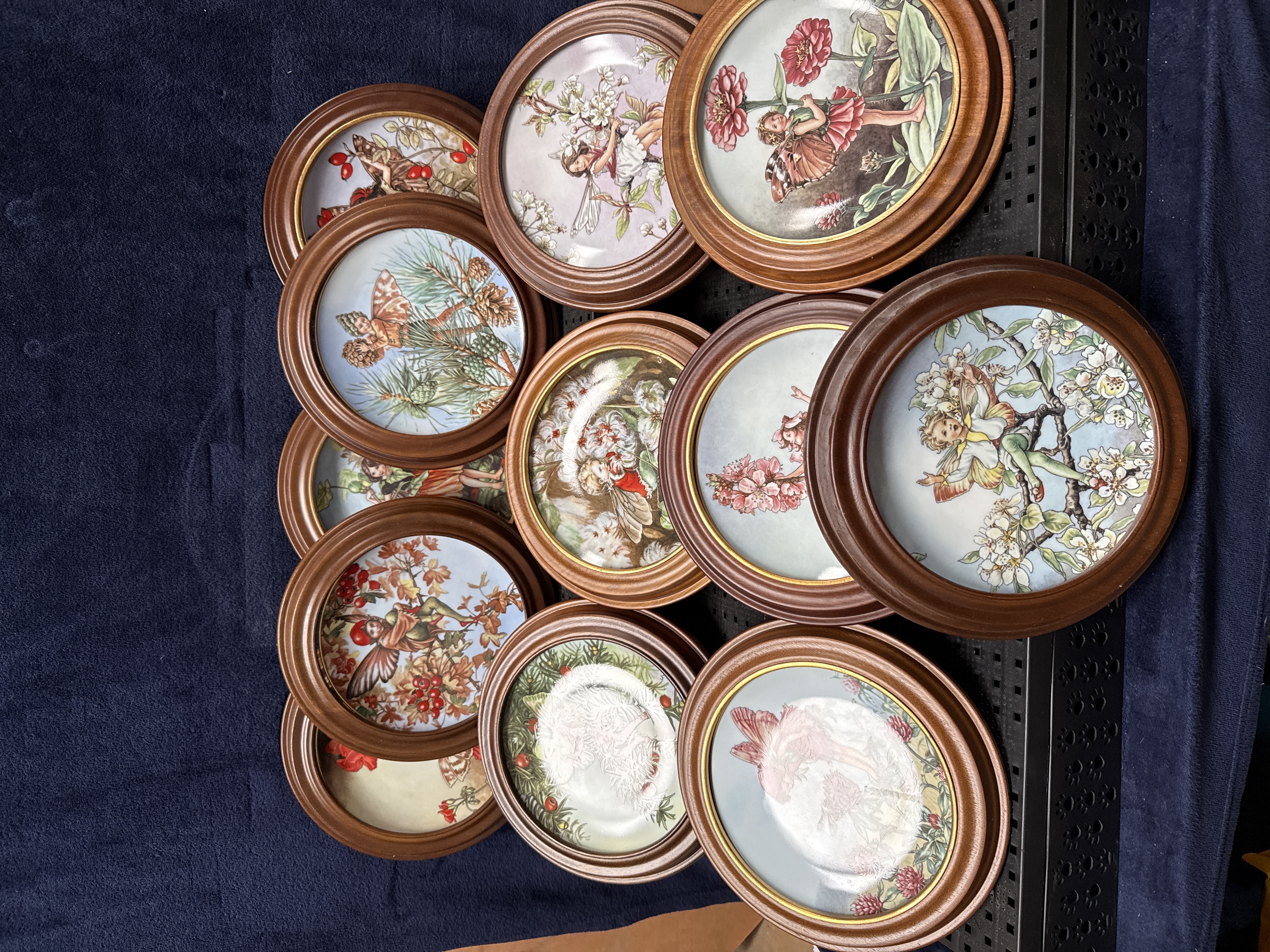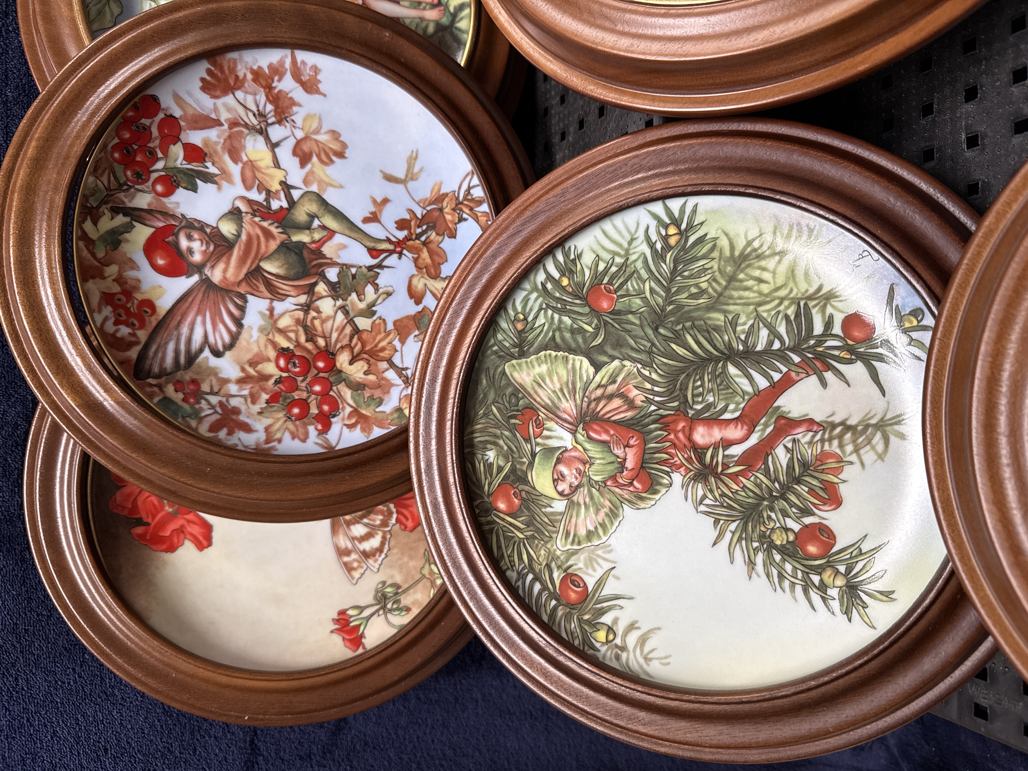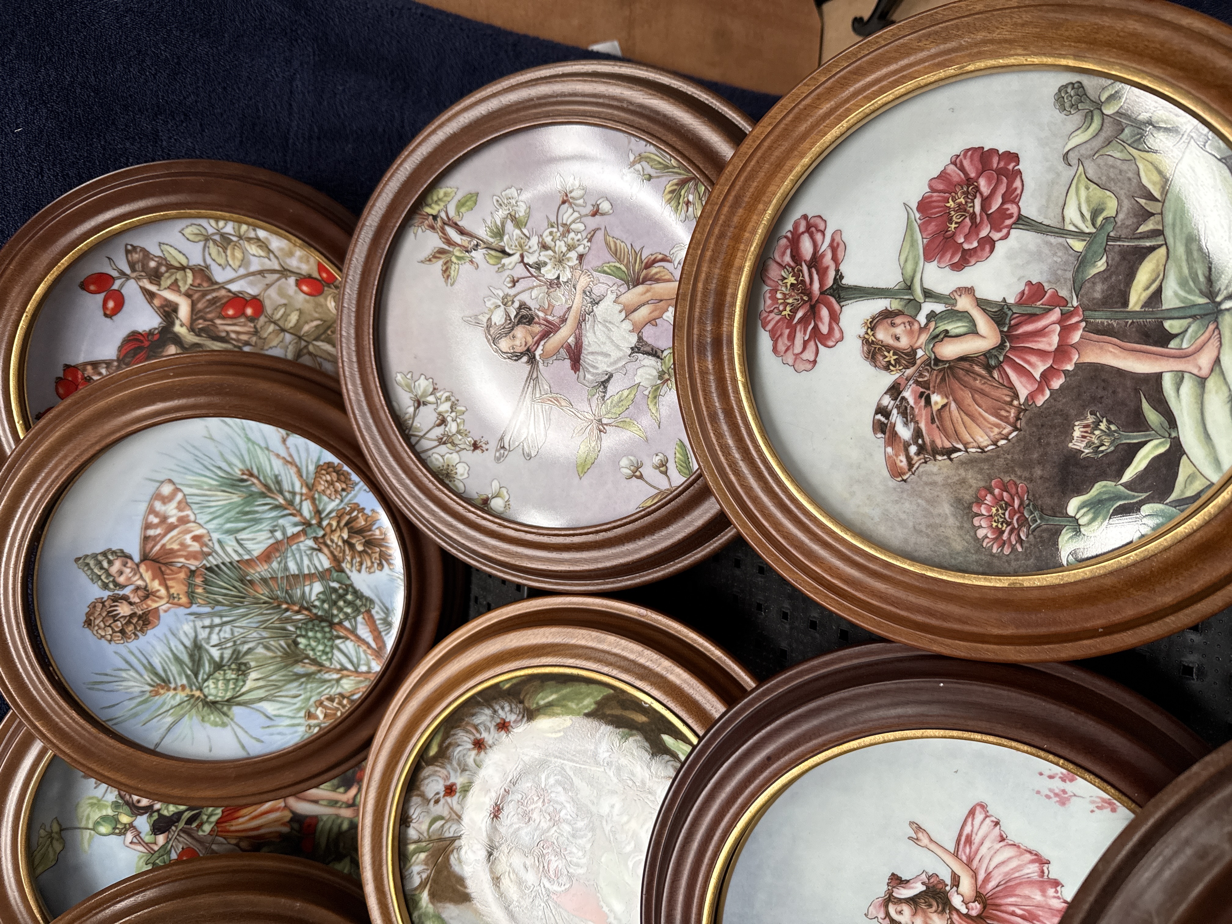 A set of 12 porcelain decorative plates from The Flower Fairies Year collection, featuring illustrations by Cicely Mary Barker and produced by Gresham. Each plate is decorated with a transfer-printed design depicting various Flower Fairies associated with specific plants and seasons, including the Black Bryony Fairy, Zinnia Fairy, Pine Fairy, and Cherry Blossom Fairy. The plates are mounted within circular, stepped wooden frames. The reverse of the plates includes the title of the specific fairy, a corresponding verse, the plate number, and the Gresham logo depicting a winged insect over a globe. Markings also state © 1989 Estate C.M. Barker and indicate the items are for decorative use only.