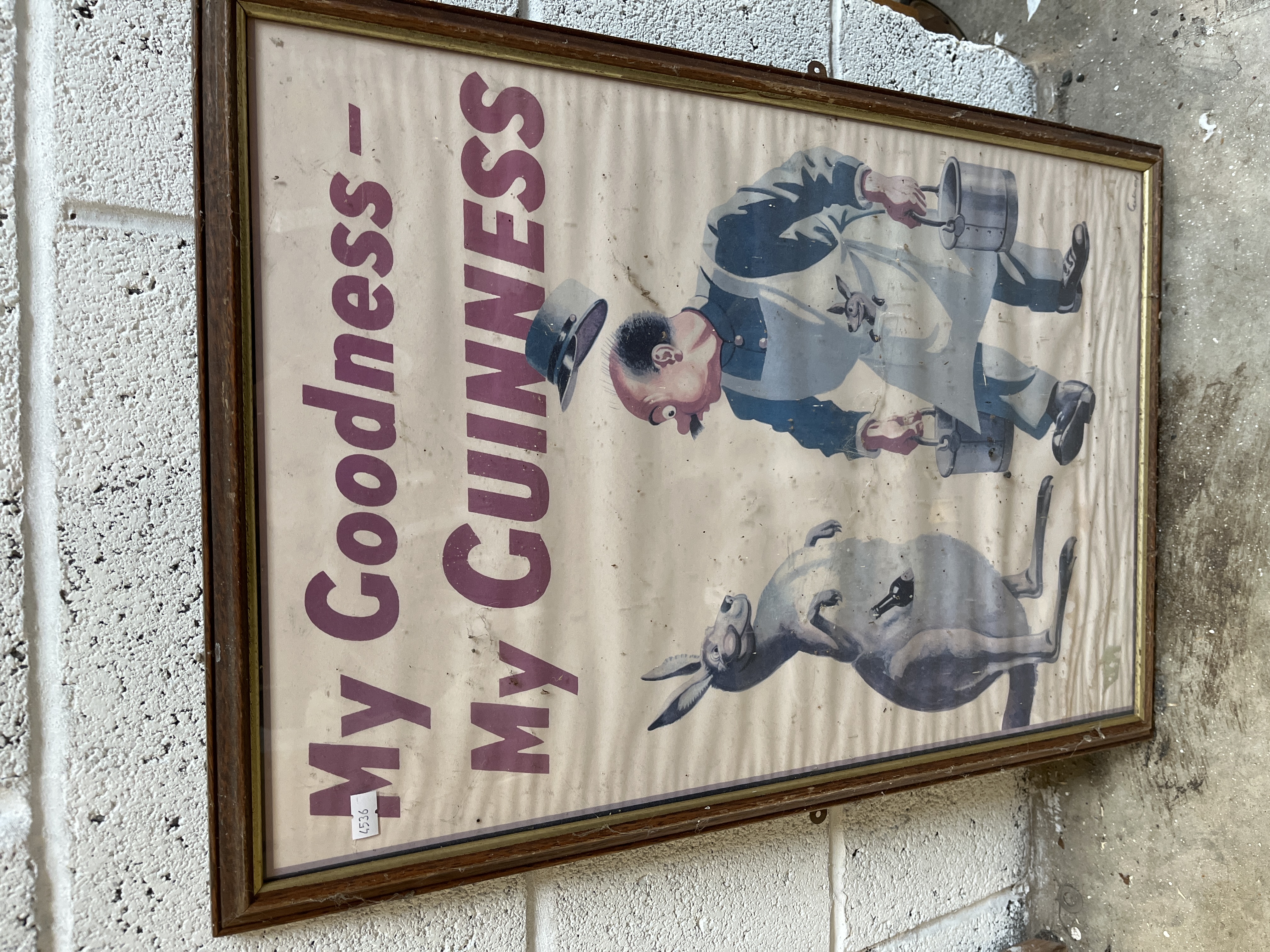 A framed Guinness advertising poster featuring the Kangaroo illustration by artist John Gilroy. The image depicts a zookeeper in a blue uniform carrying two pails of stout, reacting with surprise as his hat flies off while looking at a kangaroo. The kangaroo is illustrated with a bottle of Guinness stout tucked into its pouch. The poster features the slogan My Goodness – My GUINNESS in large purple block lettering. The printed signature Gilroy is visible in the upper right corner of the illustration. The poster is presented in a dark wood frame with a gilt inner slip and is glazed.