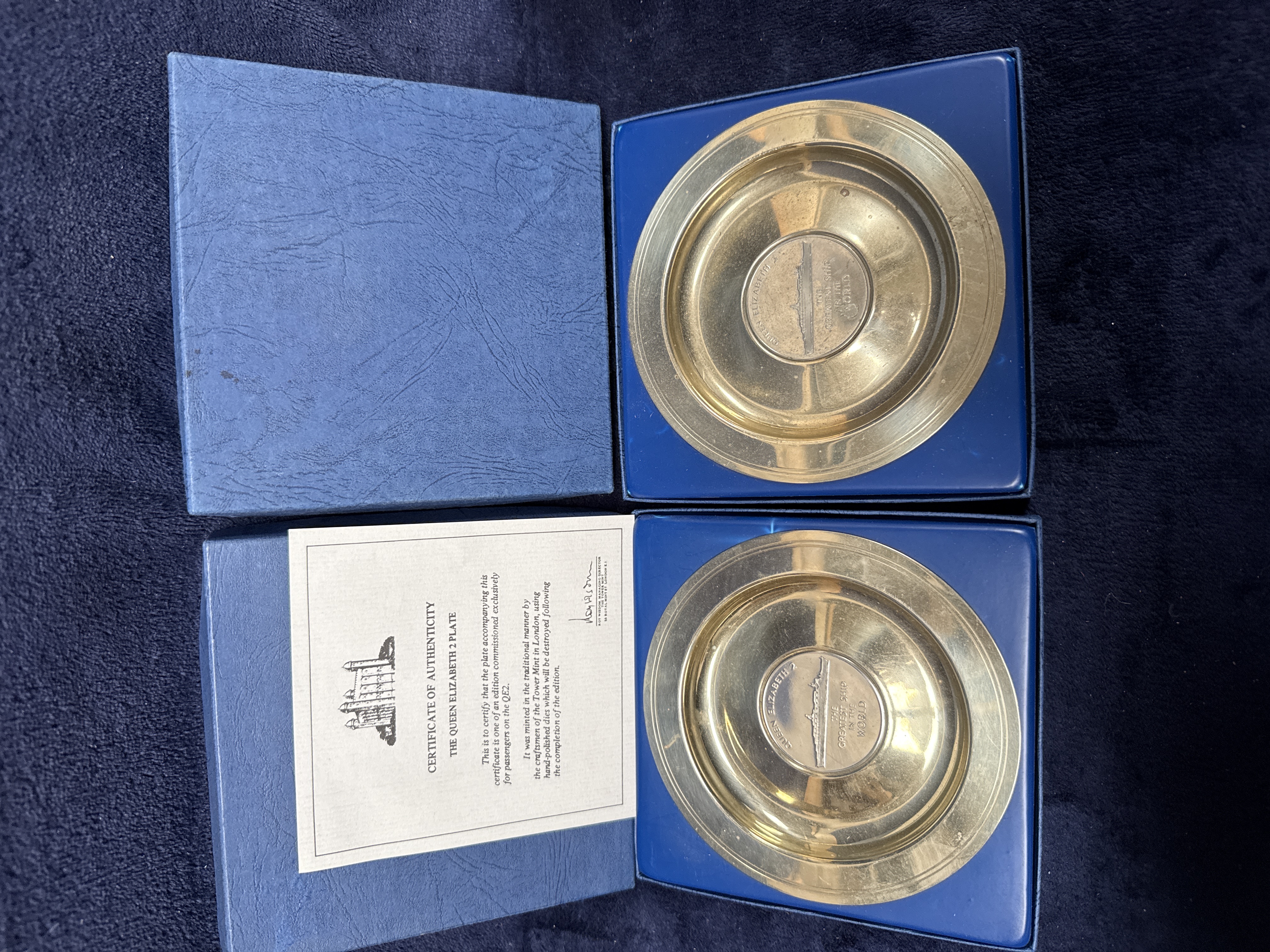 A pair of commemorative plates produced by the Tower Mint, London, commissioned exclusively for passengers of the ocean liner Queen Elizabeth 2. The plates are struck in a yellow-toned metal, likely bronze or a brass alloy, using hand-polished dies. Each plate features a central medallion depicting the profile of the ship, inscribed with the text QUEEN ELIZABETH 2 and THE GREATEST SHIP IN THE WORLD. The metal surfaces retain an original finish with visible areas of oxidation and tarnish. The items are housed in their original blue textured presentation boxes, and one is accompanied by its original Certificate of Authenticity confirming production by the Tower Mint.