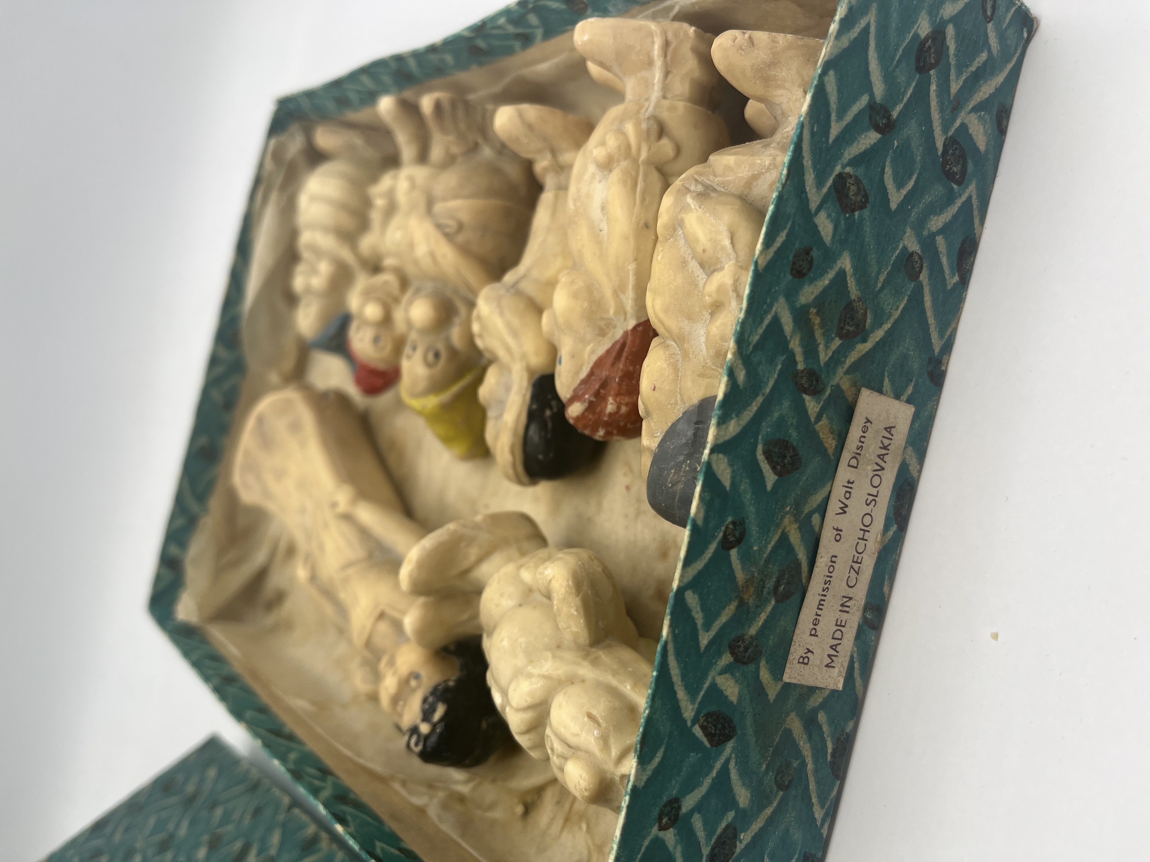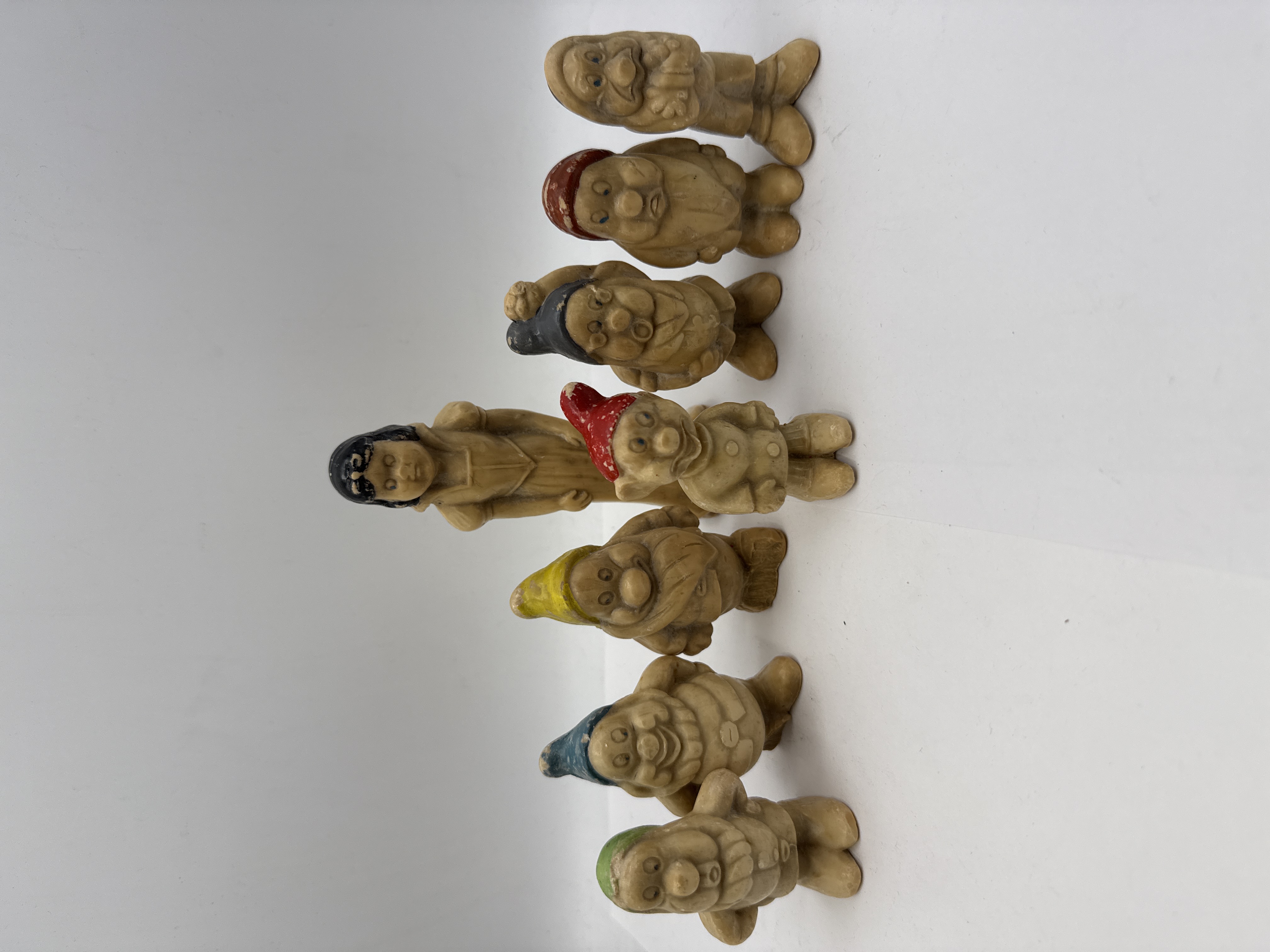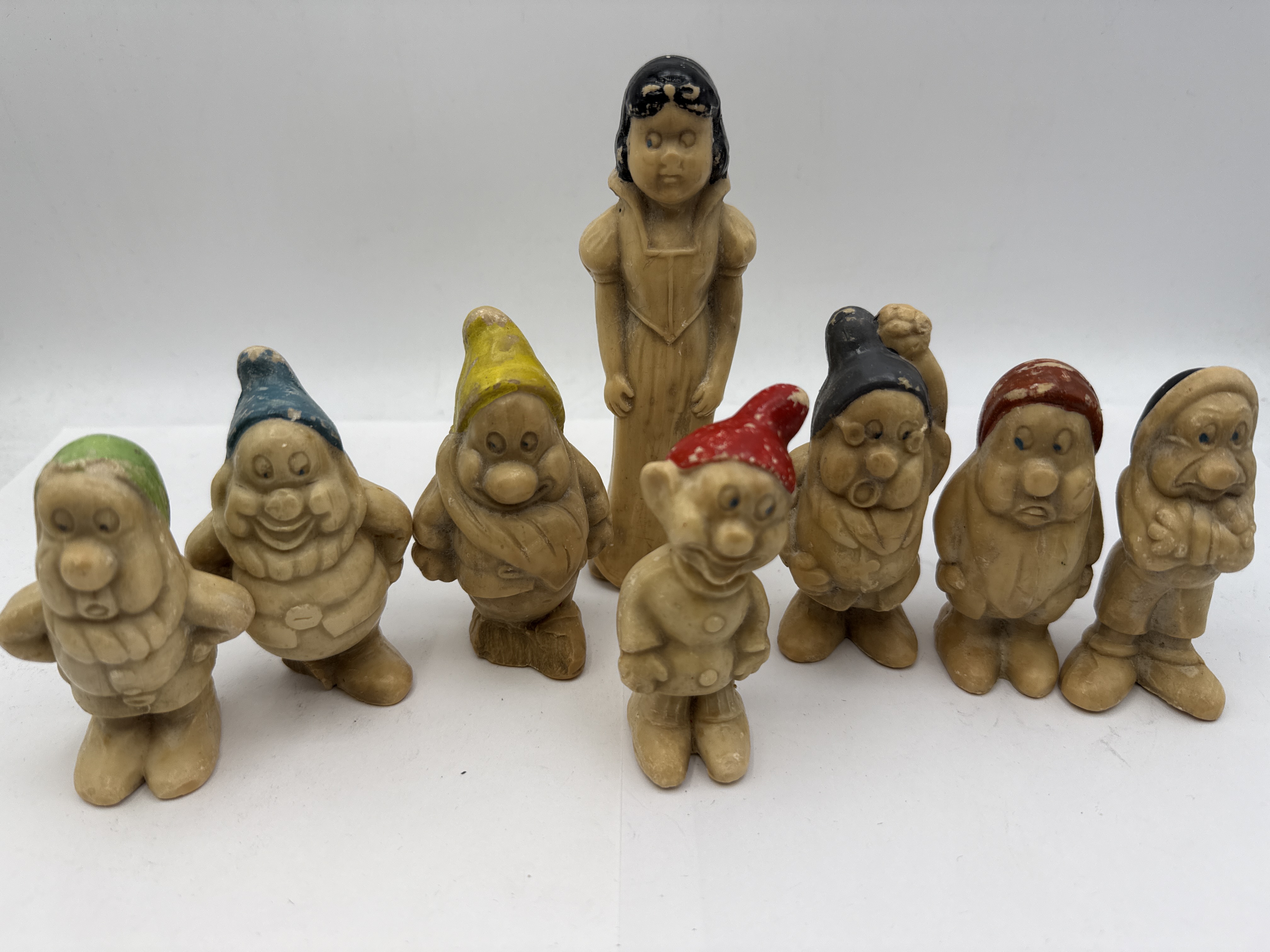 A set of figurines depicting the characters from the 1937 Disney animated film, Snow White and the Seven Dwarfs. The collection includes Snow White and each of the seven dwarfs, Doc, Grumpy, Happy, Sleepy, Bashful, Sneezy, and Dopey, identifiable by their distinct facial expressions and poses. These items are produced from a moulded soap mid-20th-century composition material. The figures are designed in the style of licensed Disney character merchandise from the mid-20th century and are likely of British or American manufacture. No manufacturer marks or factory attributions are visible on the bodies of the items.