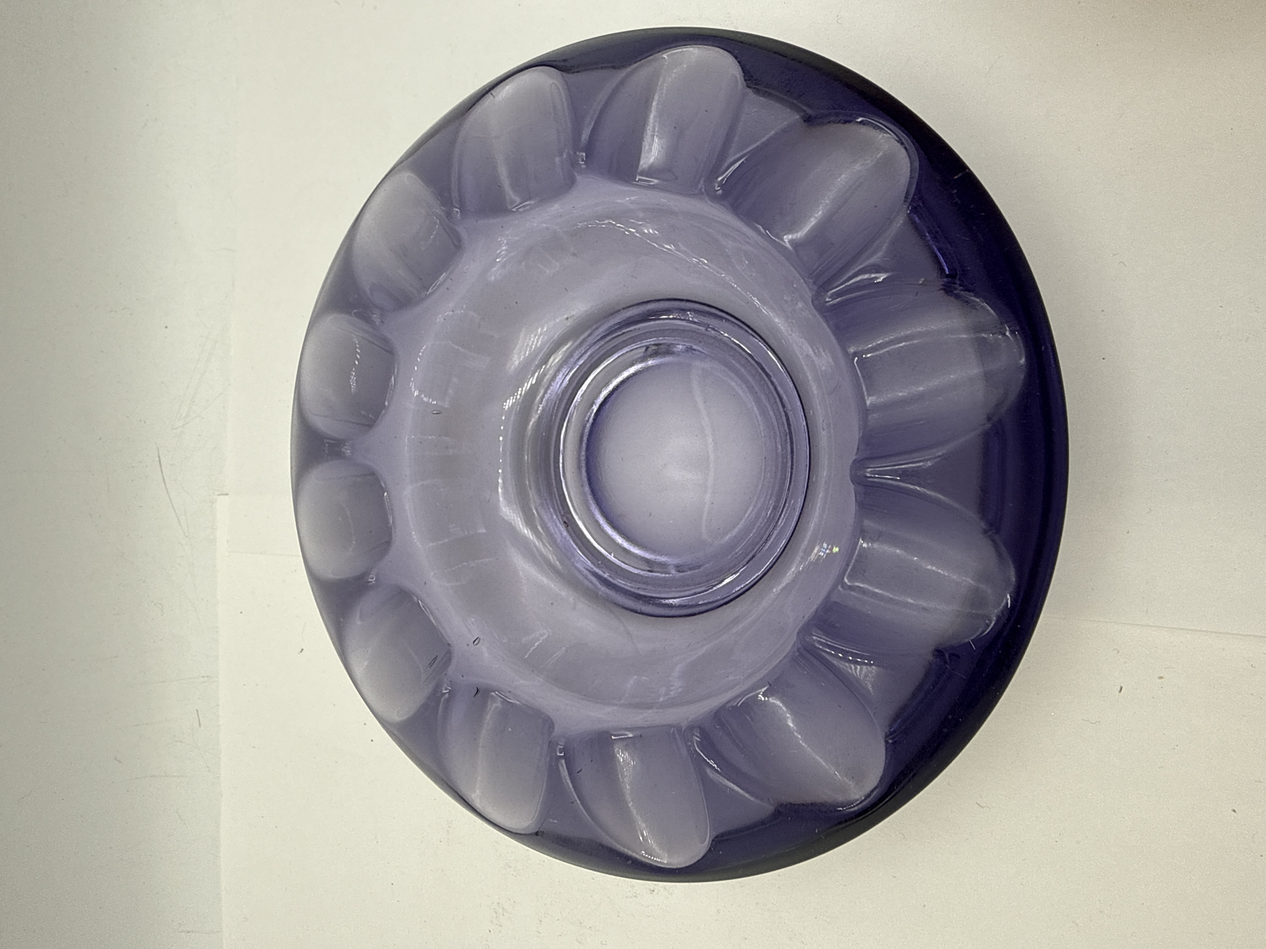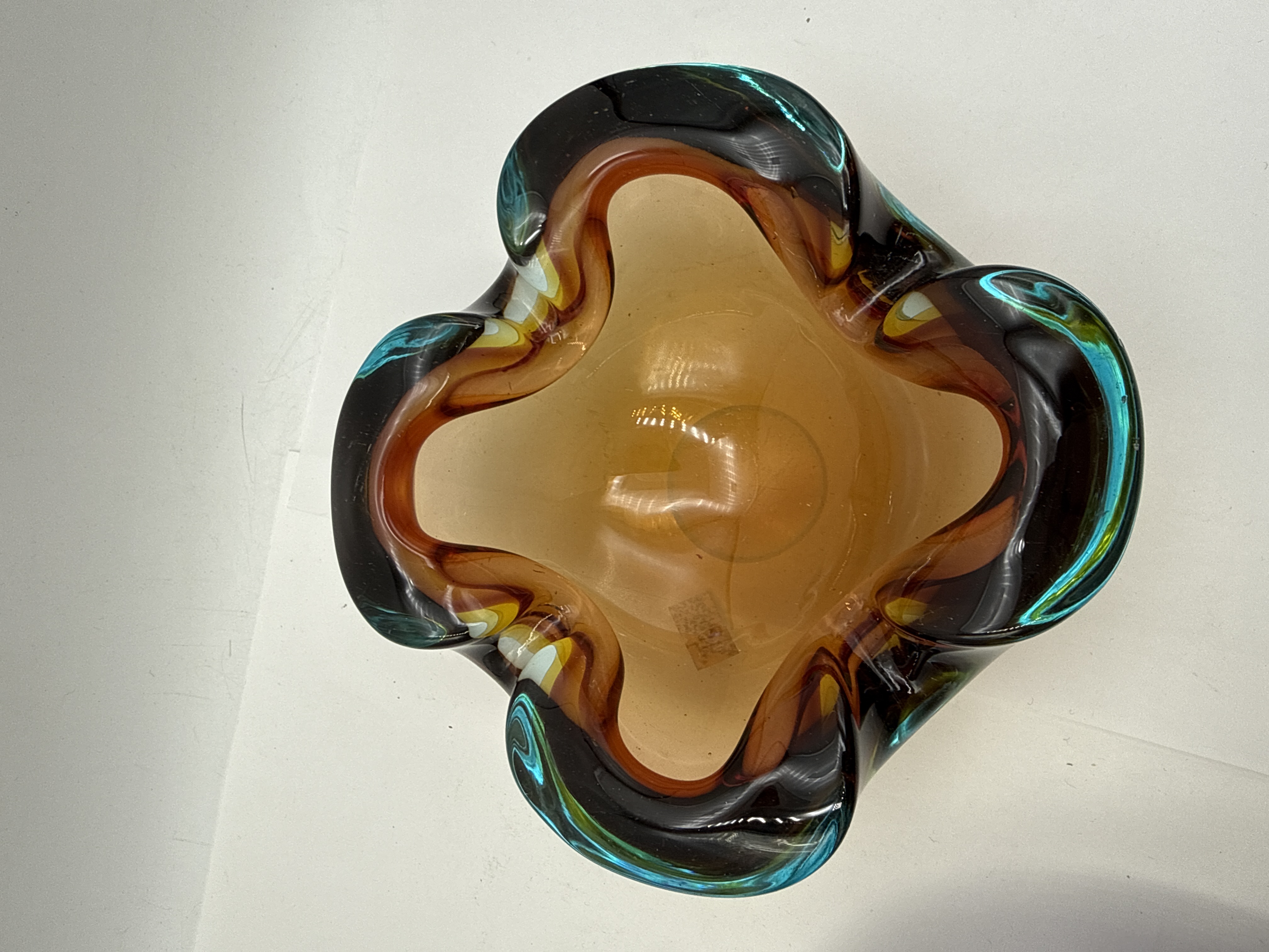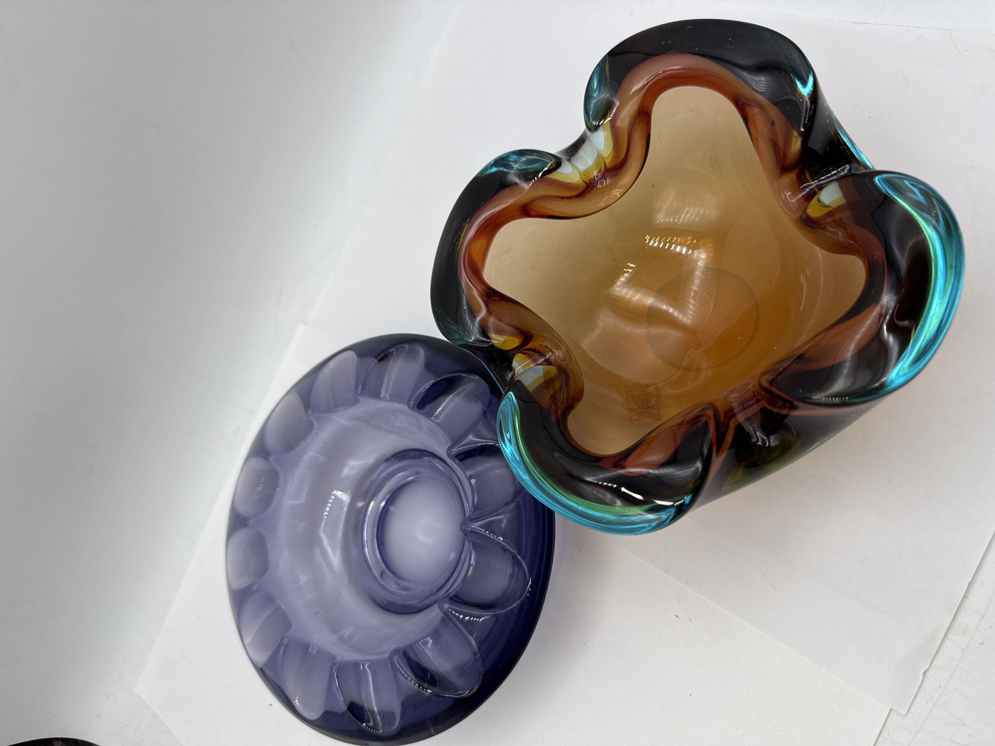 This lot consists of two pieces of mid-20th-century decorative art glass. The first is a heavy-walled bowl created using the sommerso technique, where layers of contrasting colour are encased within clear glass. The vessel features a central amber-coloured well, followed by layers of translucent white, dark smoke-grey, and a vibrant teal-blue outer rim. The glass is hand-formed into a four-lobed handkerchief or petal shape with a thick, undulating rim. A small gold-toned foil label is attached to the interior base. The second item is a translucent purple glass bowl or ashtray of circular form. The body is designed with sixteen deeply molded, rounded lobes radiating from a central circular well. Both pieces are consistent with mid-century European glass production.