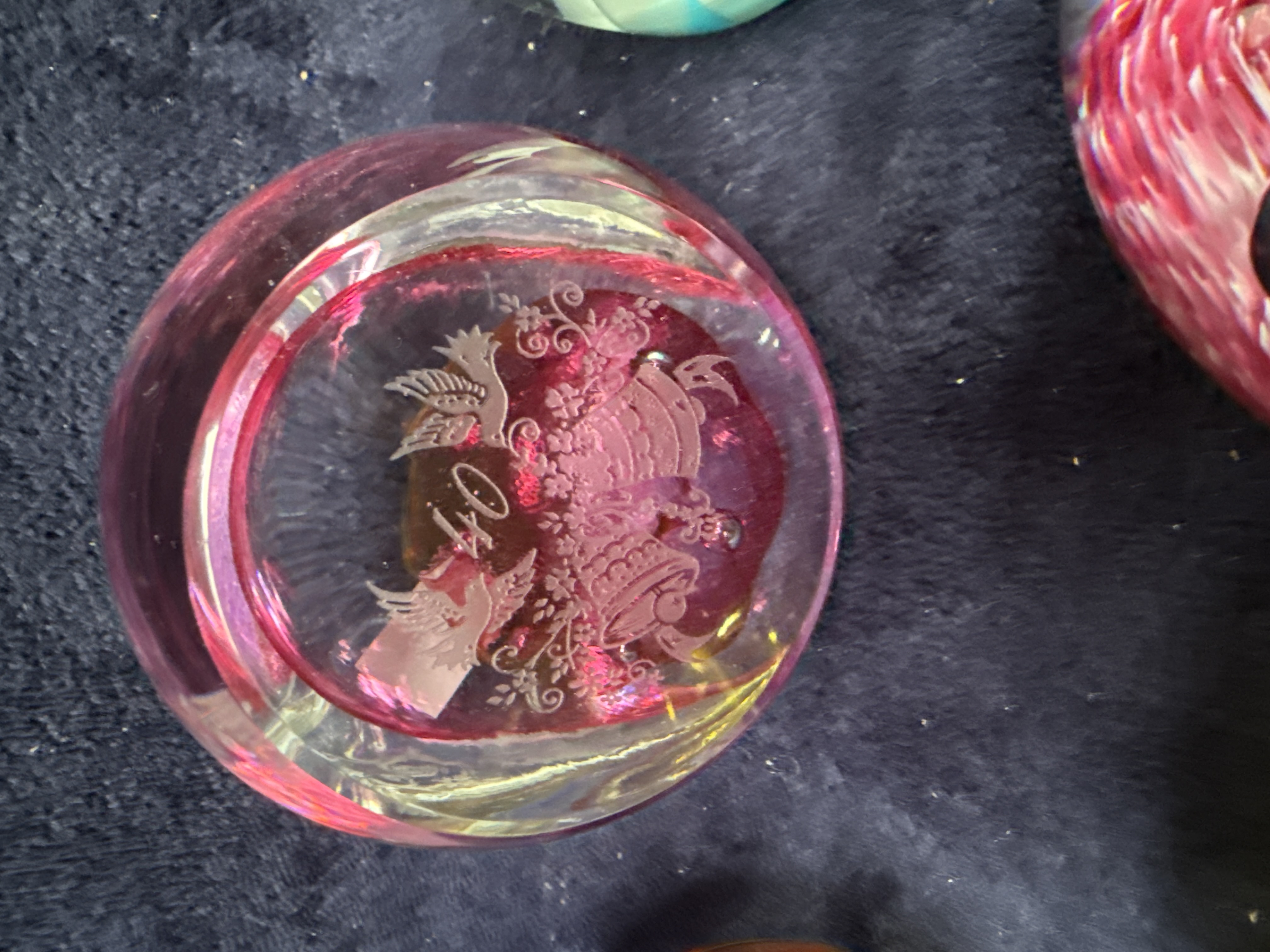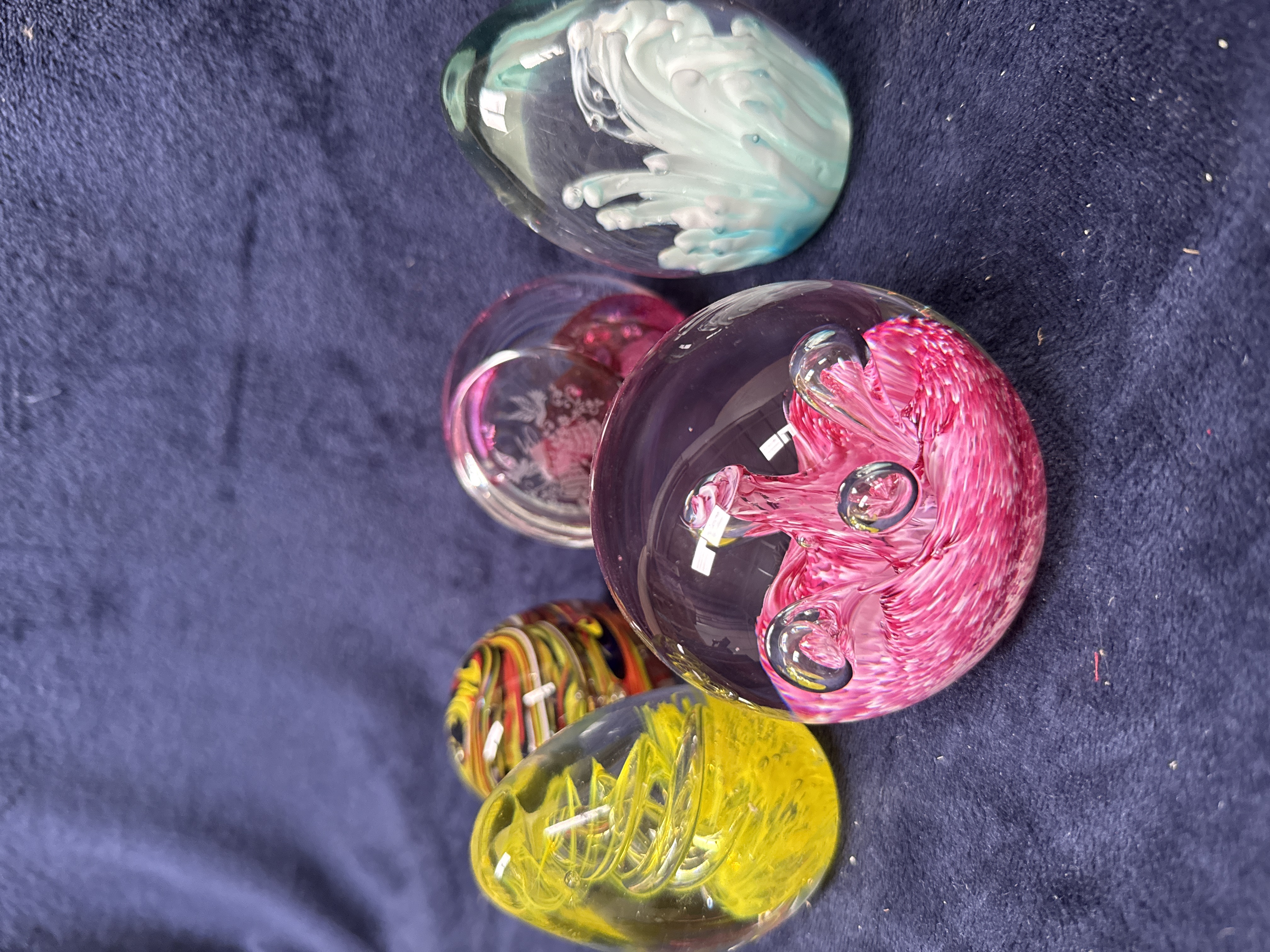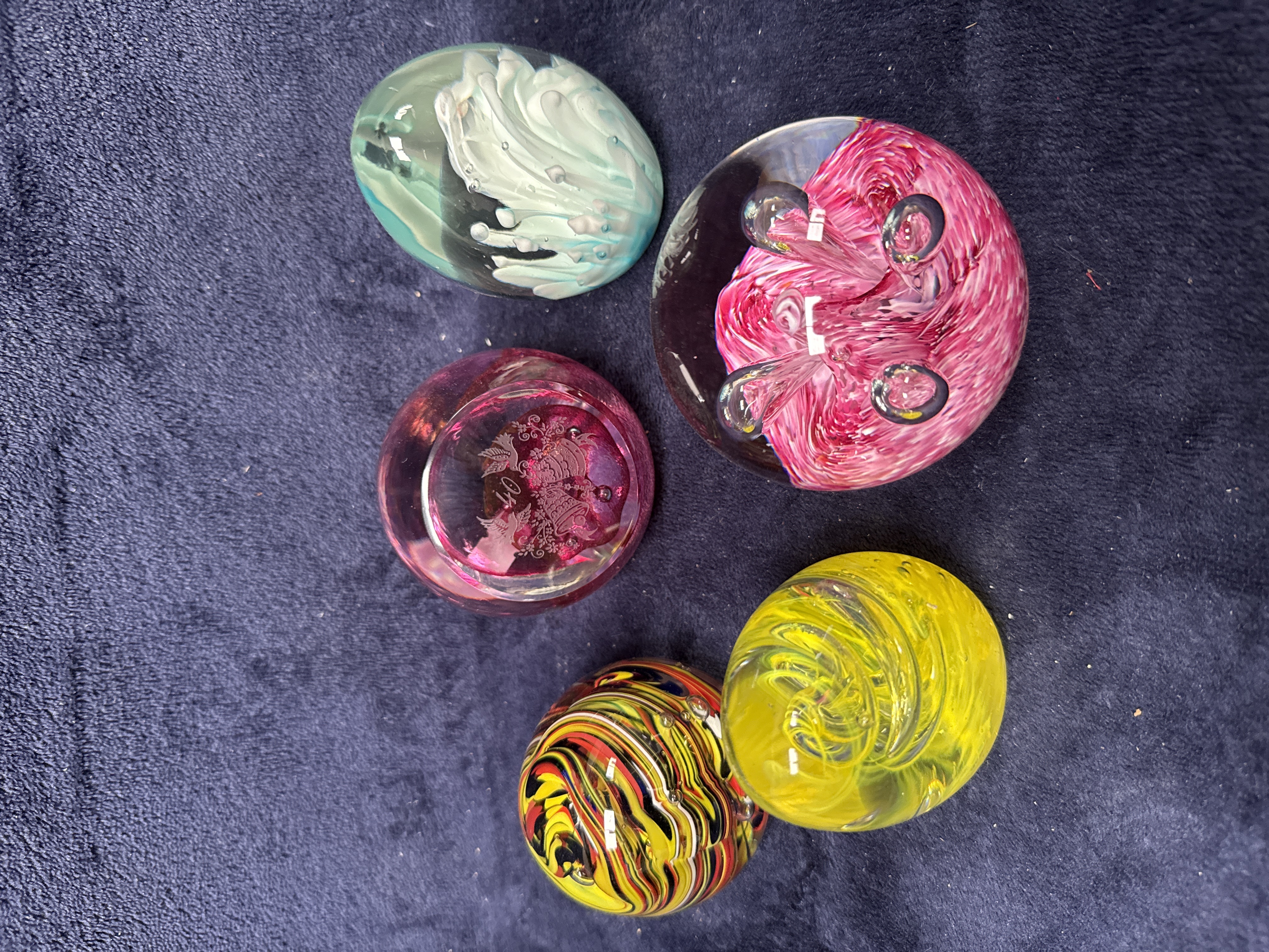 A collection of 5 art glass paperweights of various forms and techniques, consistent with 20th-century studio production. The group includes a large spherical paperweight featuring a central pink and white swirled inclusion topped with four controlled bubbles; a translucent pink circular paperweight etched with a 40th anniversary commemorative design featuring doves, bells, and foliage; an egg-shaped clear glass paperweight containing a yellow internal spiral; an egg-shaped pale blue-green paperweight with a white wispy seafoam-style inclusion; and a spherical paperweight with a multicoloured marbled swirl design in red, yellow, black, and white. Techniques demonstrated include hand-blowing, internal spiralling, controlled bubble inclusion, and etching. No maker’s marks or signatures are present. One item features a flattened, polished pontil mark to the base.