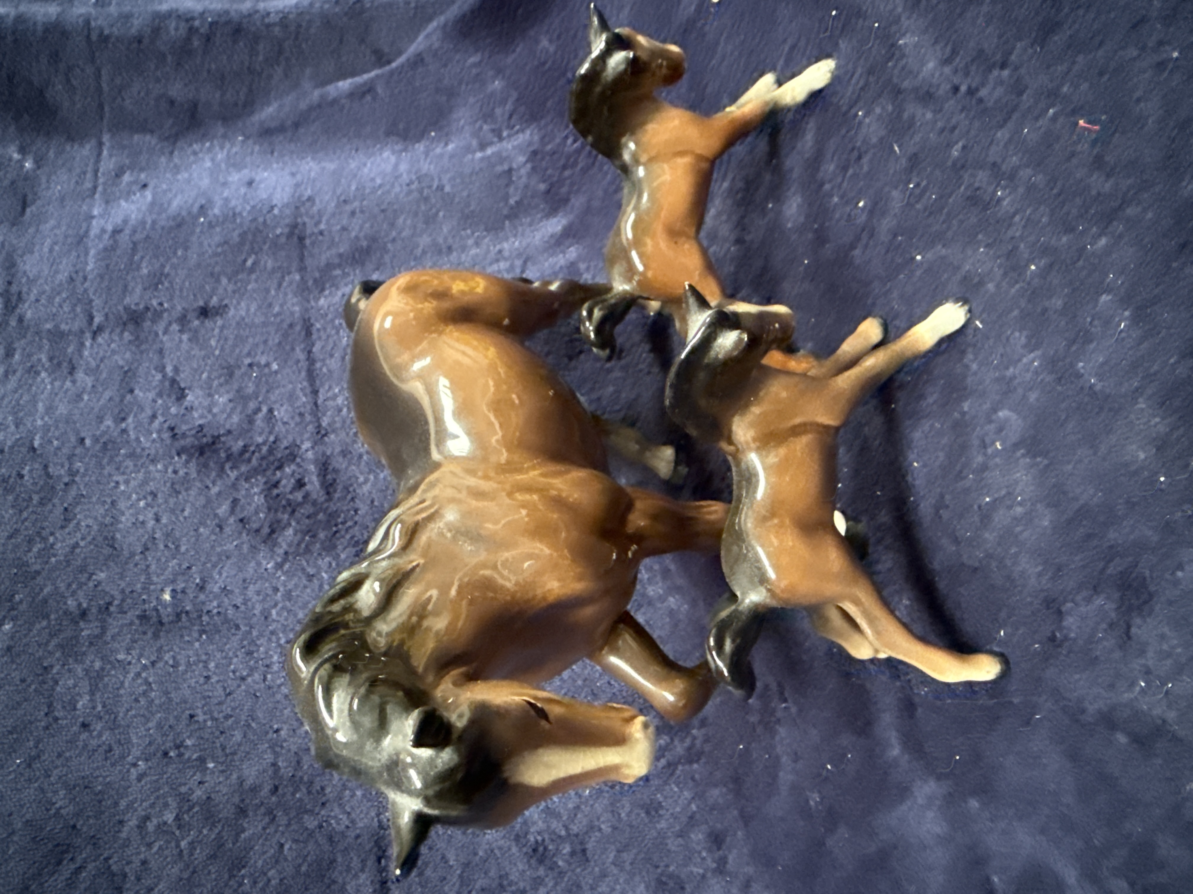 A trio of Beswick glazed ceramic horse figurines comprising one larger adult mare and two smaller foals. The adult horse is modelled in a standing position with its head turned, while the two foals are depicted in a prancing gait. Each piece features a rich chestnut brown high-gloss glaze with contrasting black manes, tails, and hooves. Both foals are finished with white sock markings to the front legs. These items are characteristic of mid-20th-century British animal models produced by the Beswick pottery.