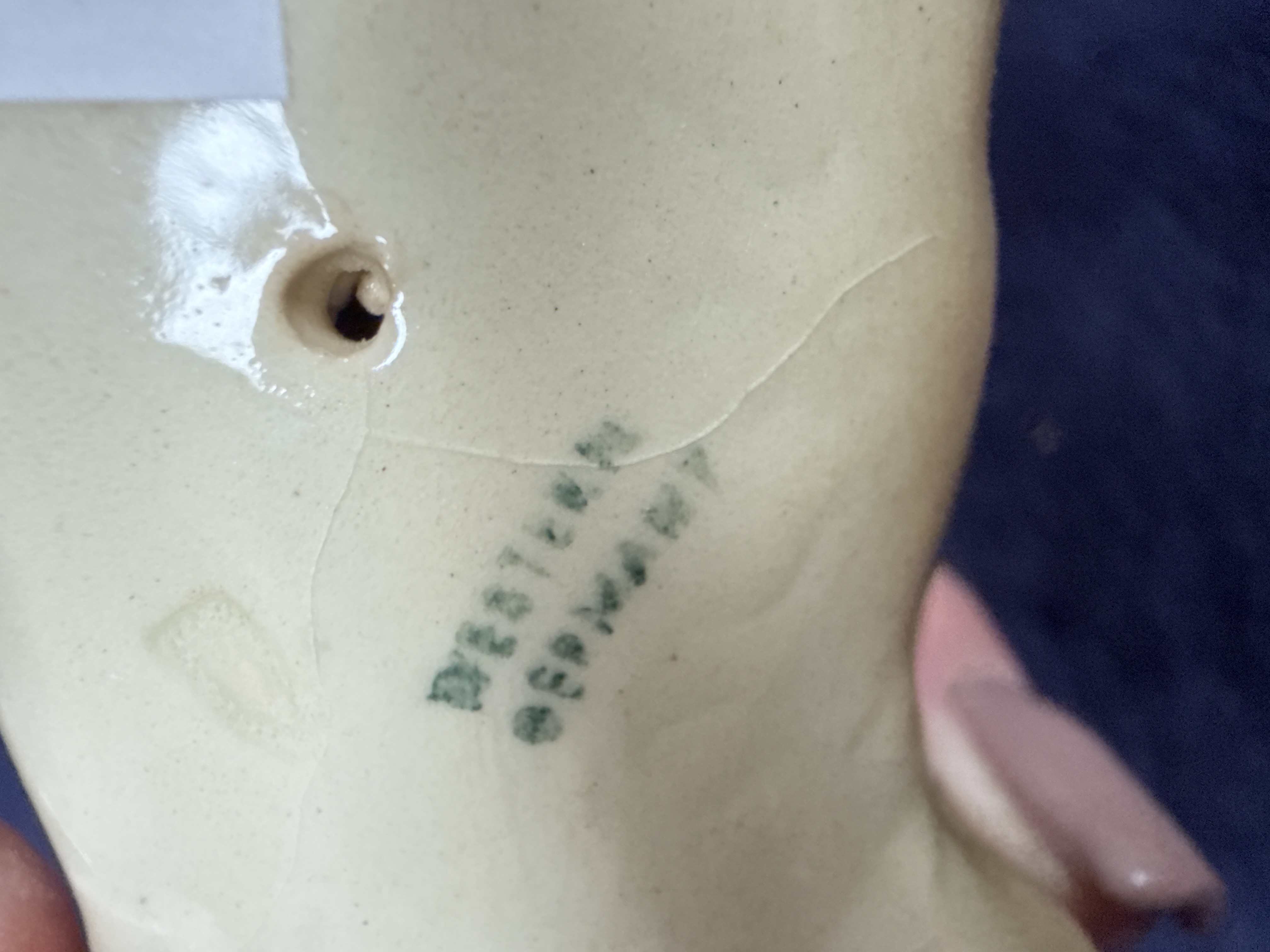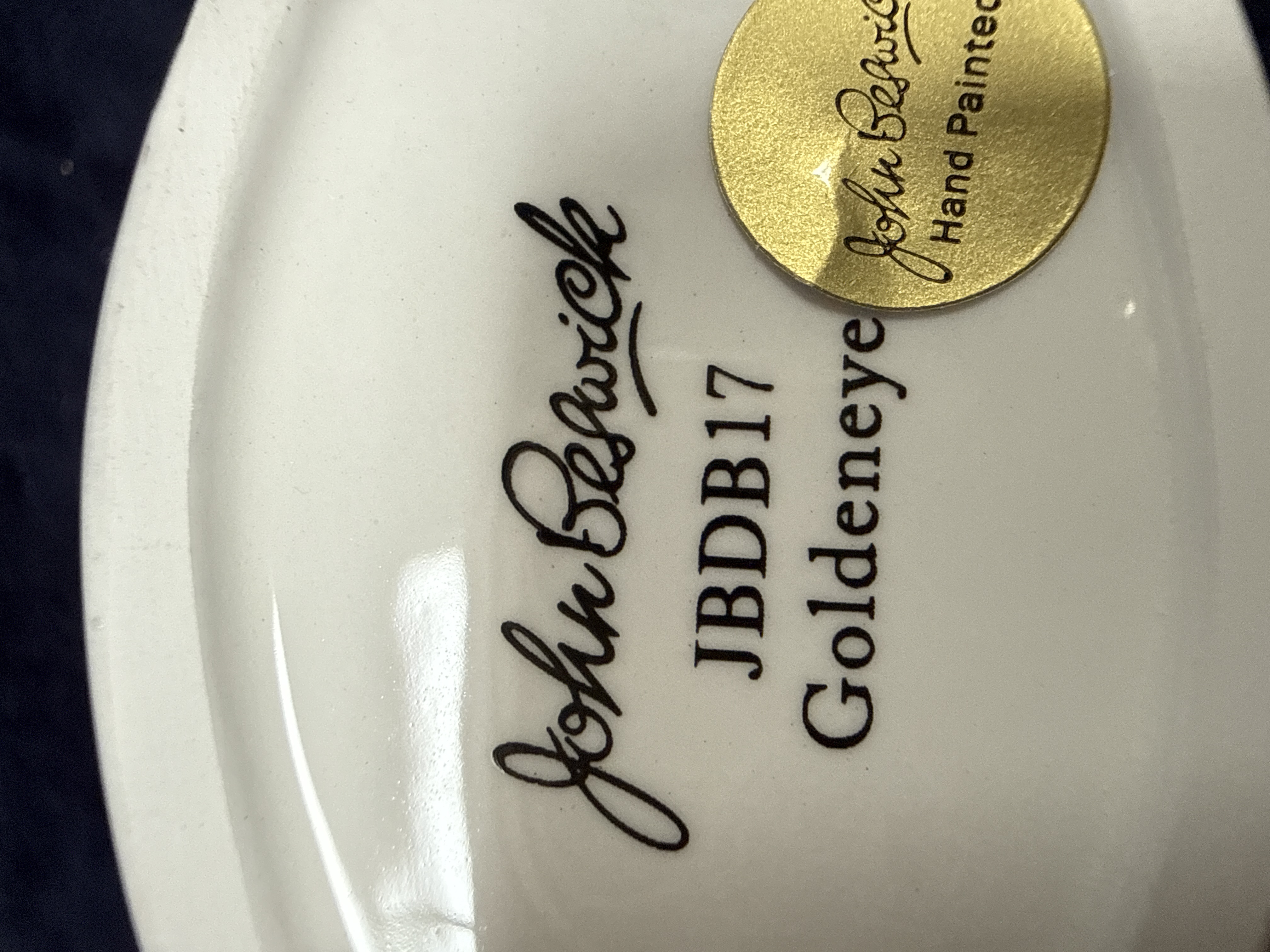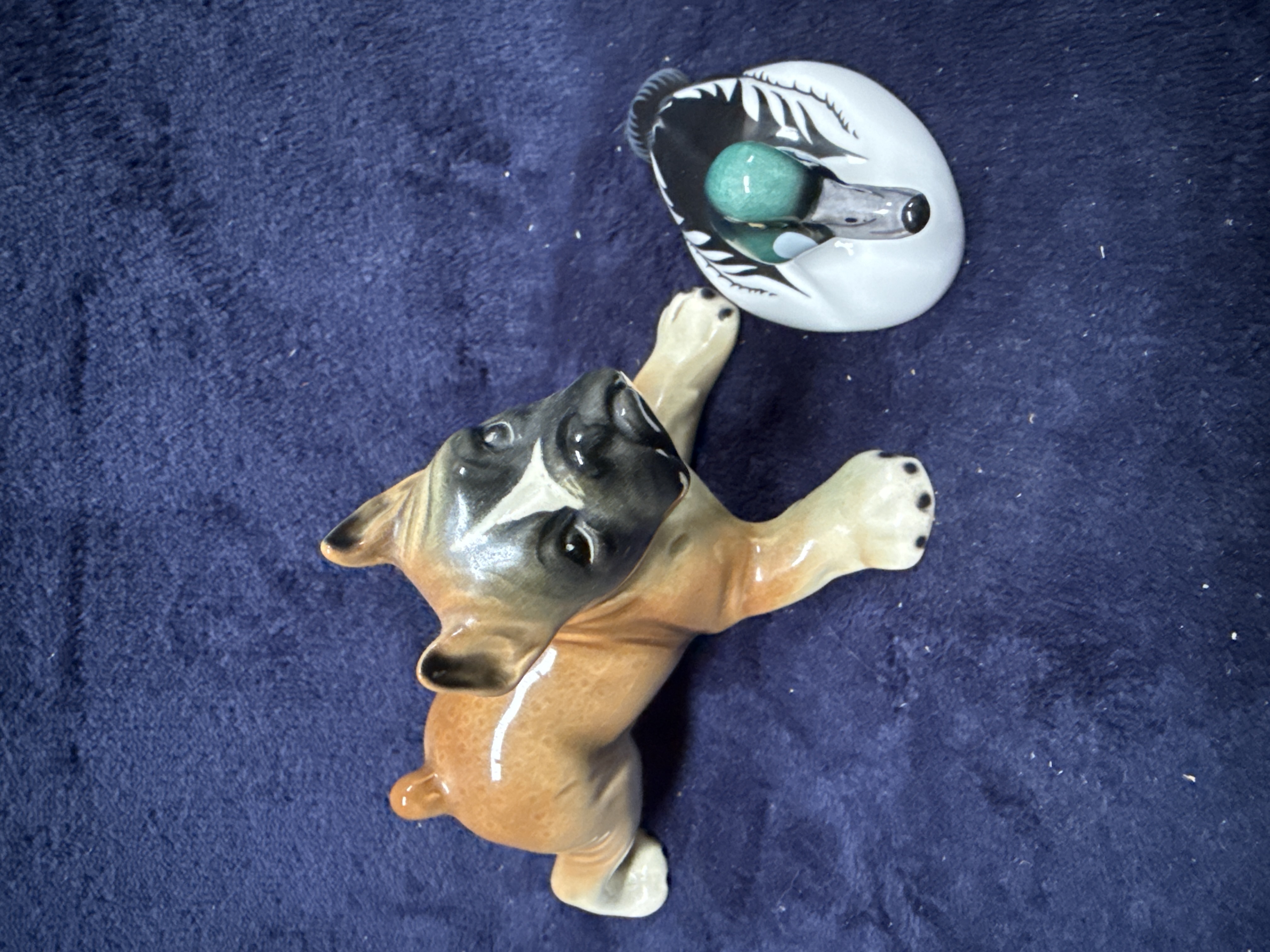 This lot consists of two ceramic animal figurines. The first is a naturalistic porcelain study of a Goldeneye duck in a swimming pose by the British manufacturer John Beswick. The figure features a green iridescent-style head with a white spot near the bill and black and white patterned plumage. The underside is marked with the John Beswick cursive script, the model number JBDB17, and the name Goldeneye. It retains an original circular gold foil label which reads John Beswick Hand Painted. The second item is a glazed ceramic figurine depicting a Boxer dog in a recumbent position. The dog is decorated with a fawn-coloured coat, a black facial mask, and white flash markings on the muzzle and paws. The underside of the dog figurine bears a green ink stamp for Western Germany.