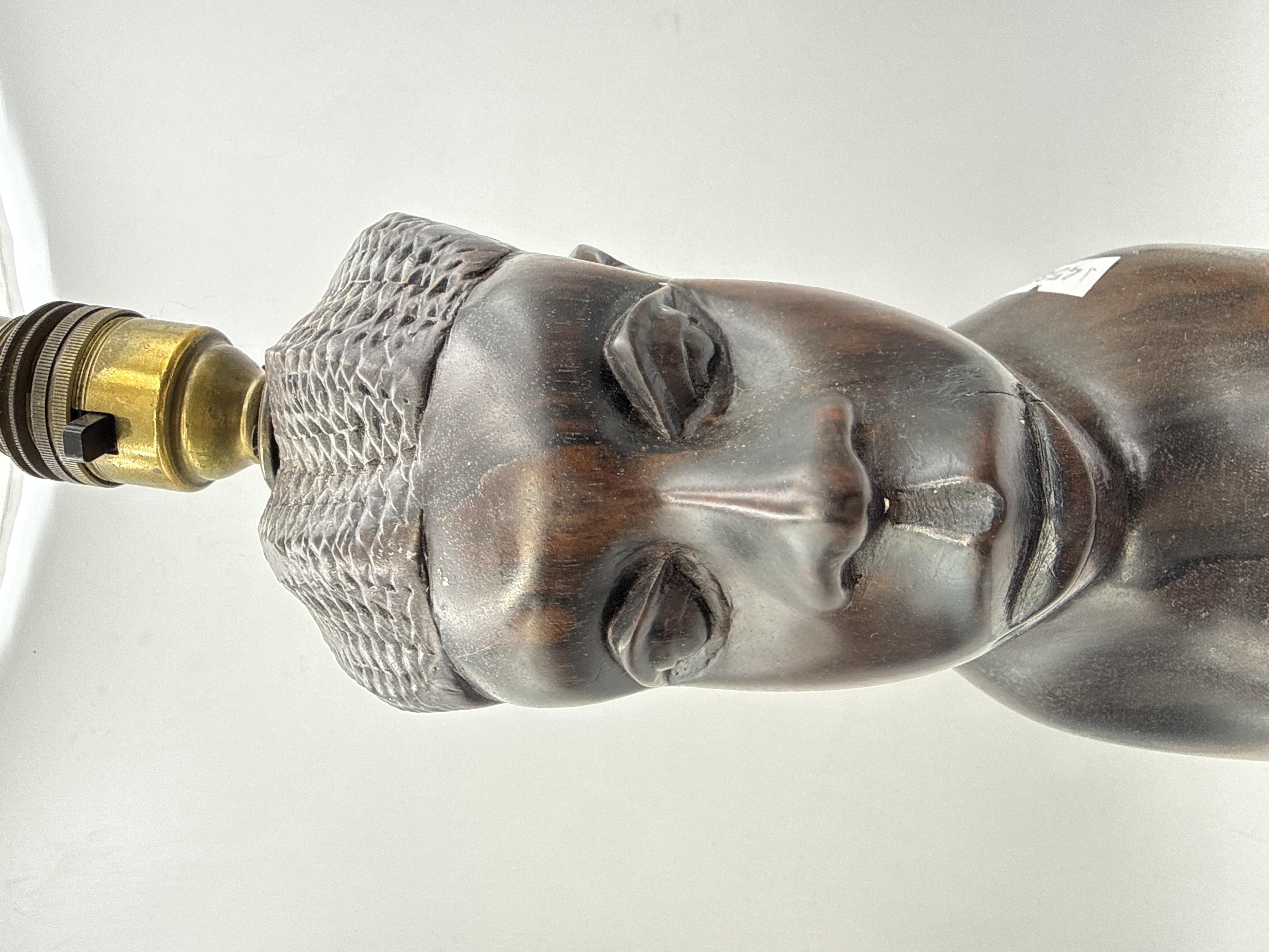 A mid-20th-century African-style figural table lamp. The base is hand-carved from a single block of dark hardwood, possibly ebony, featuring a polished finish that highlights the natural grain and deep tones. The carving depicts the bust of a woman with textured hair, with a smaller figure representing a child carried on her back. The lamp is fitted with a brass-toned metal B22 bayonet bulb holder with an integrated push-bar on/off switch and gold-toned plastic-coated flex. No maker or factory marks are present, though a small adhesive label with the digits 5851 is located on the reverse.