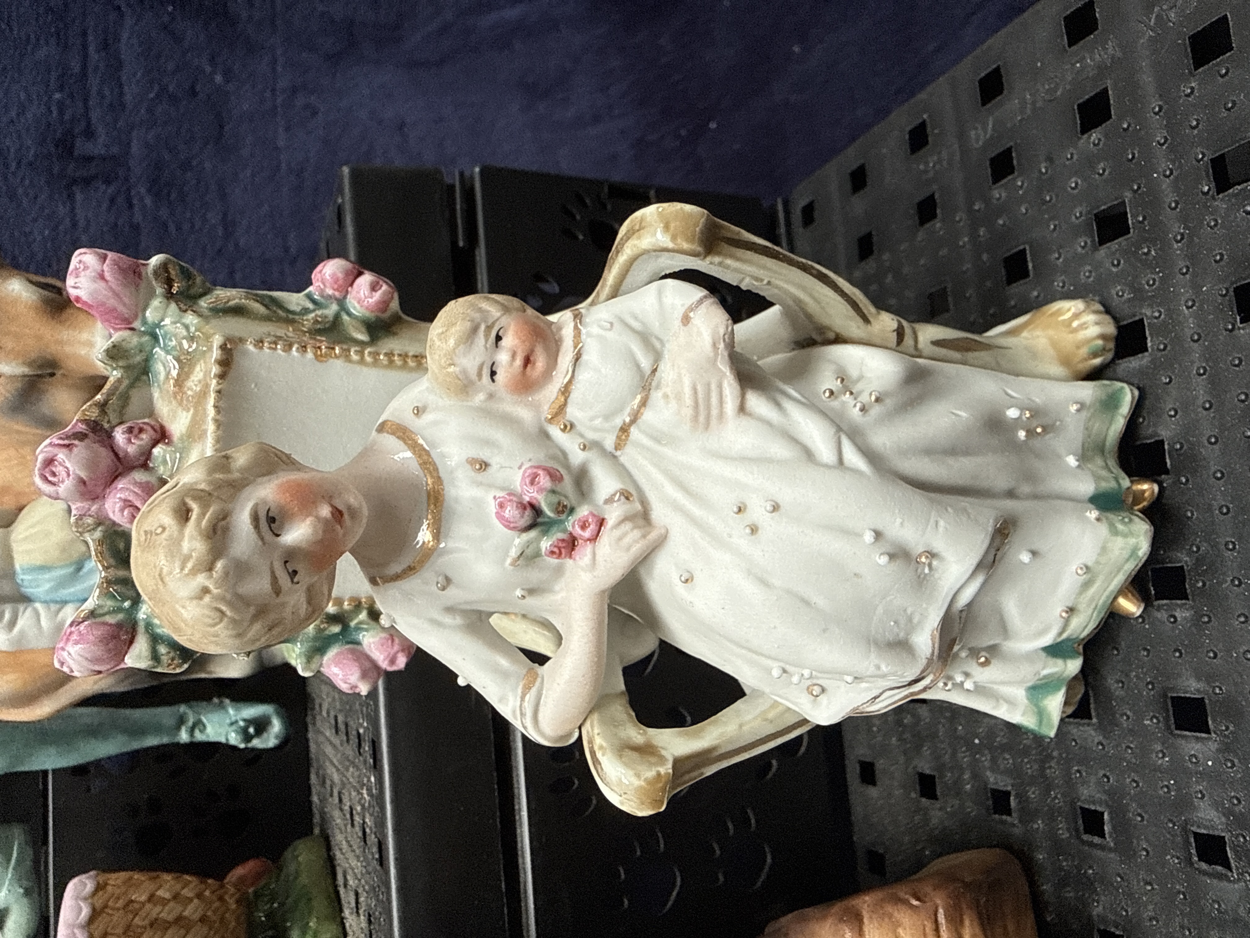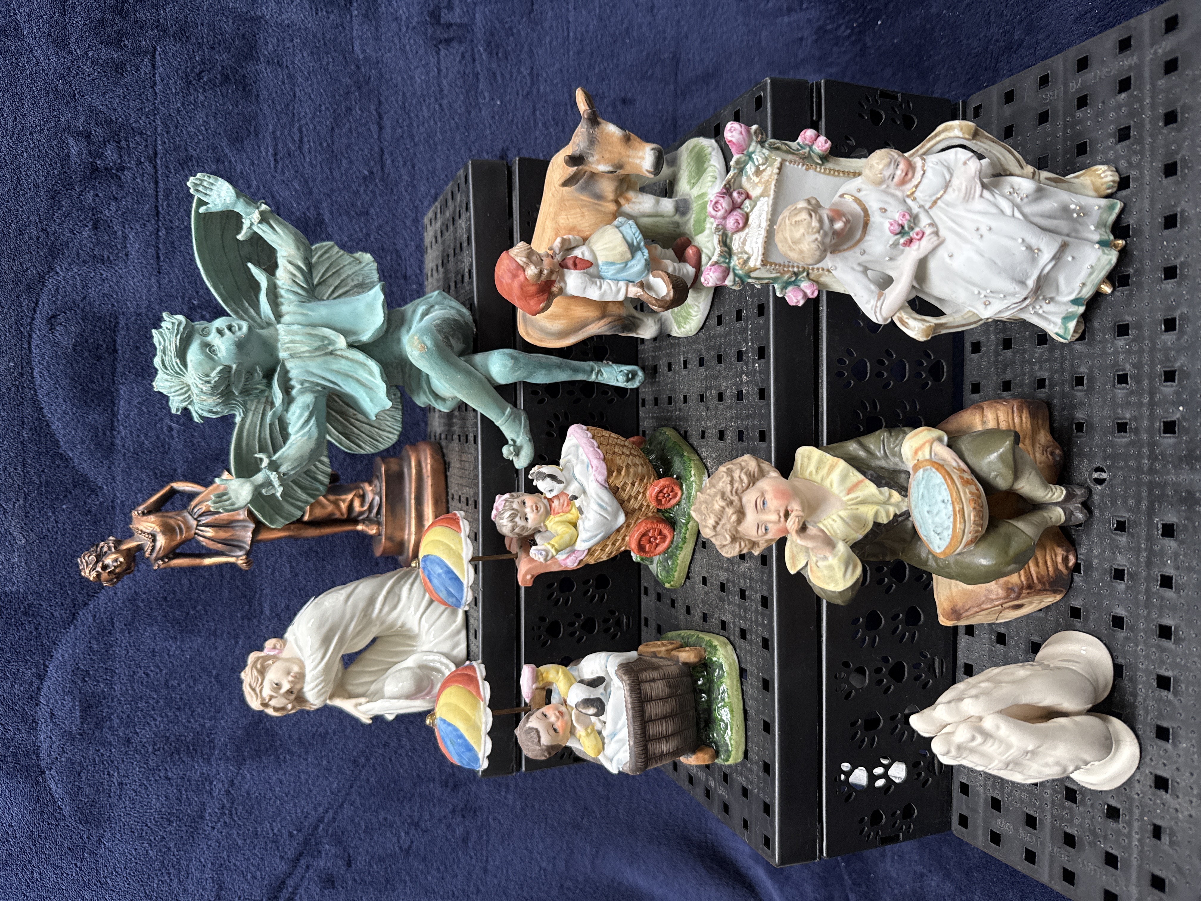 This collection of nine decorative figures includes a variety of materials and subjects. The lot features several hand-painted bisque porcelain figurines depicting genre scenes, including a mother and child seated in an ornate floral chair with raised white beadwork decoration in the moriage style, a girl with a cow, and a seated boy in historical dress resembling the Blue Boy. Also included are two figurines of children in carts, a figure of a child under colourful umbrellas, and a white glazed porcelain or parian model of two birds. The collection is further composed of two larger figures: a dynamic fairy with outstretched wings featuring a verdigris-effect finish and a classical draped female figure with a bronze-toned finish. A gold-toned script inscription is present on the base of the seated boy figurine, though it is not clearly legible.