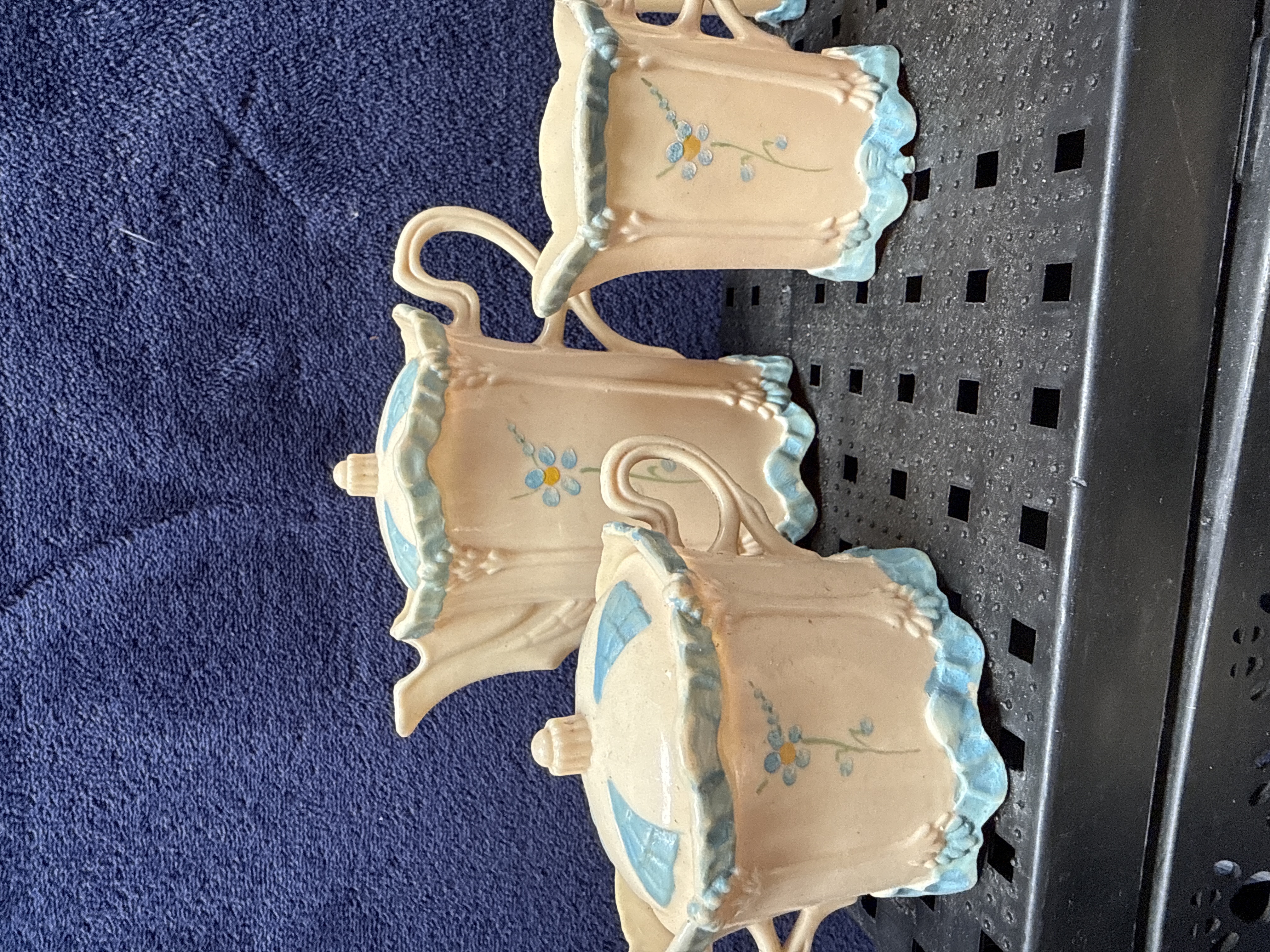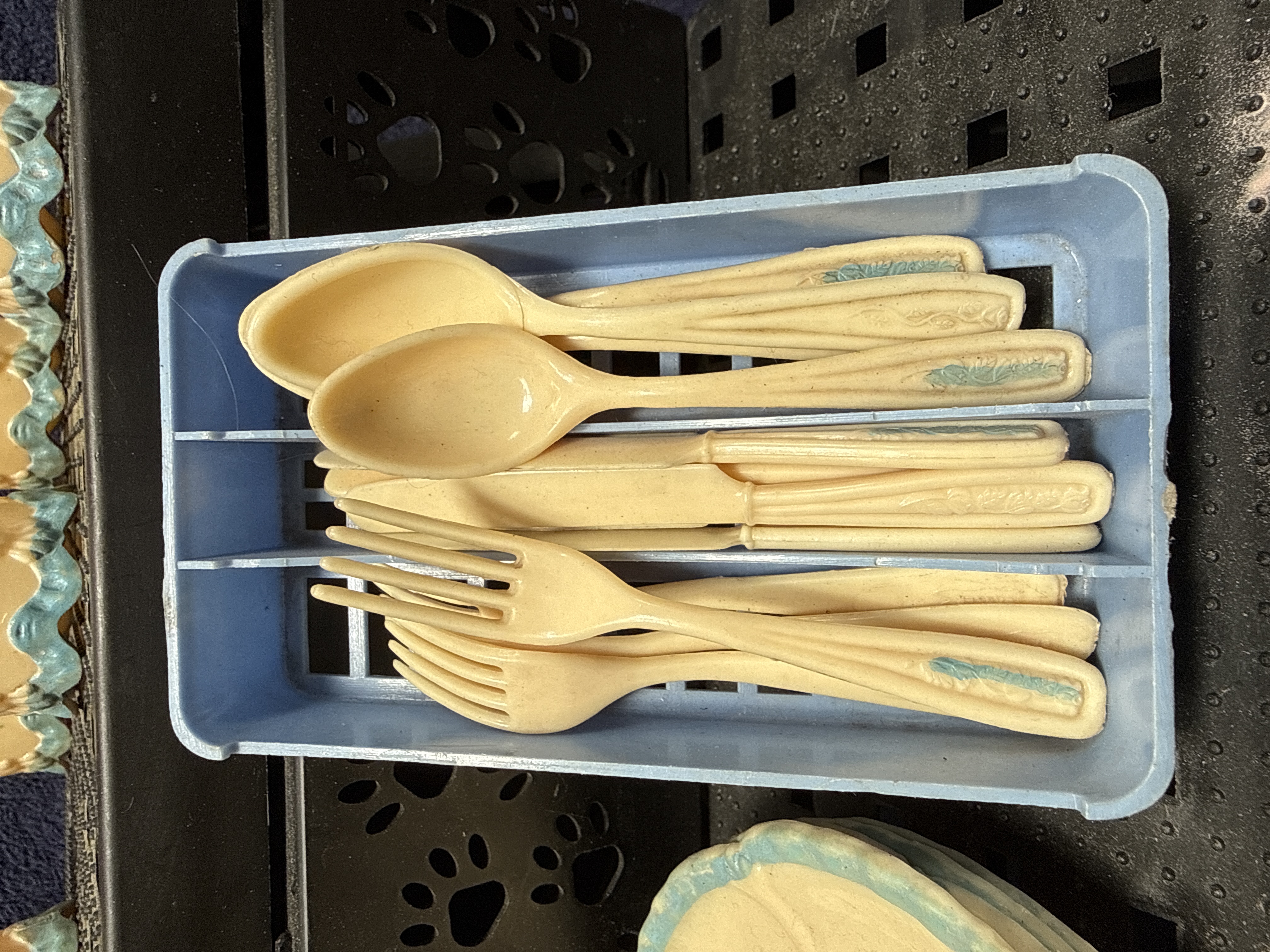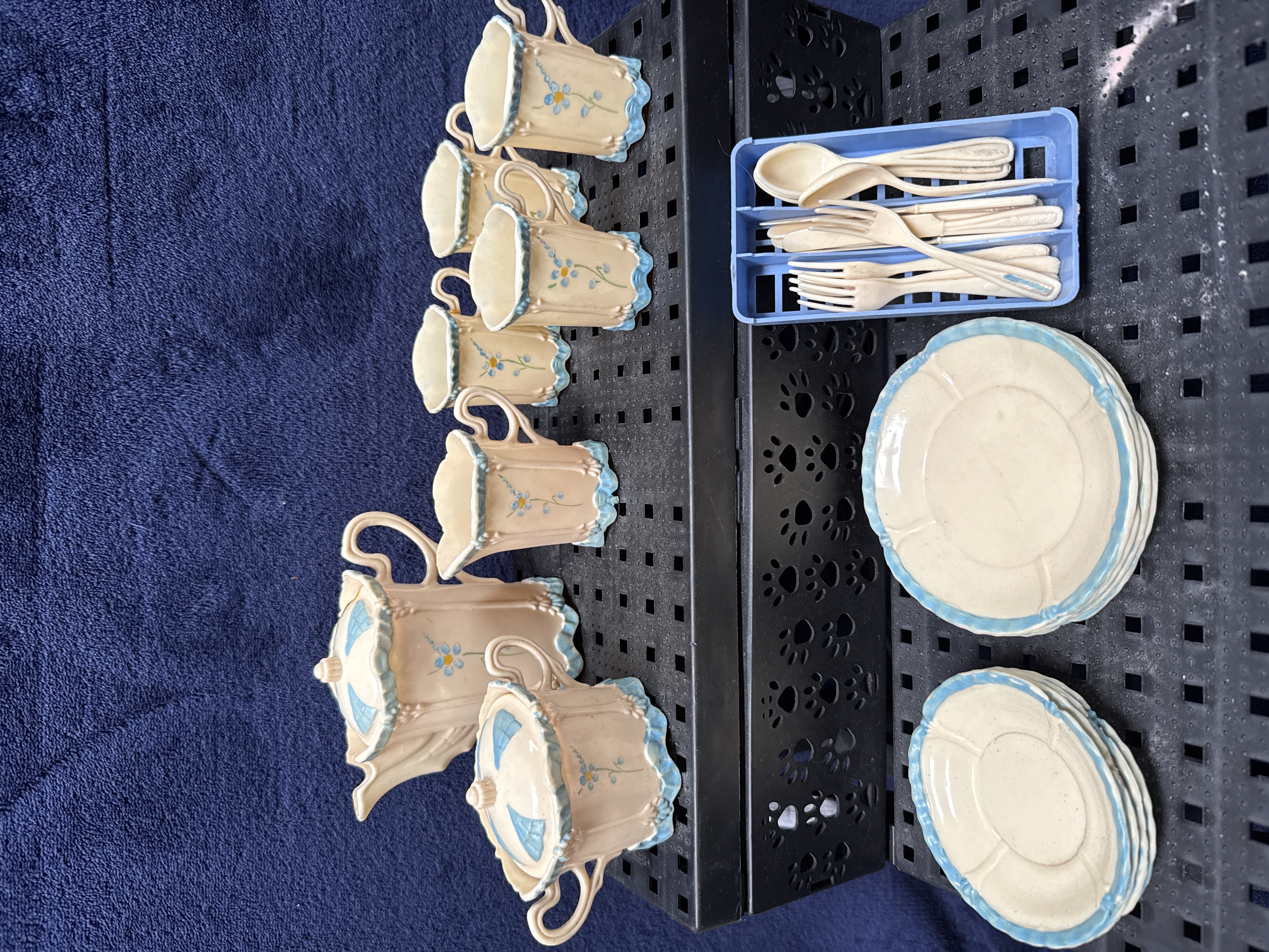 A set of glazed earthenware miniature tea service items and associated plastic cutlery. The ceramic service comprises a lidded teapot, a lidded sugar bowl, a cream jug, five teacups, and ten assorted saucers and plates. The set features hand-painted decoration consisting of blue floral sprigs with yellow centres on a cream-coloured ground. The rims are finished with a scalloped, light blue painted border. Accompanying the ceramic items is a set of cream-coloured plastic toy cutlery, including knives, forks, and spoons, contained within a blue plastic organiser tray. No maker’s marks or factory stamps are visible on the pieces. The style and construction are consistent with mid-20th century British or European toy manufacture.