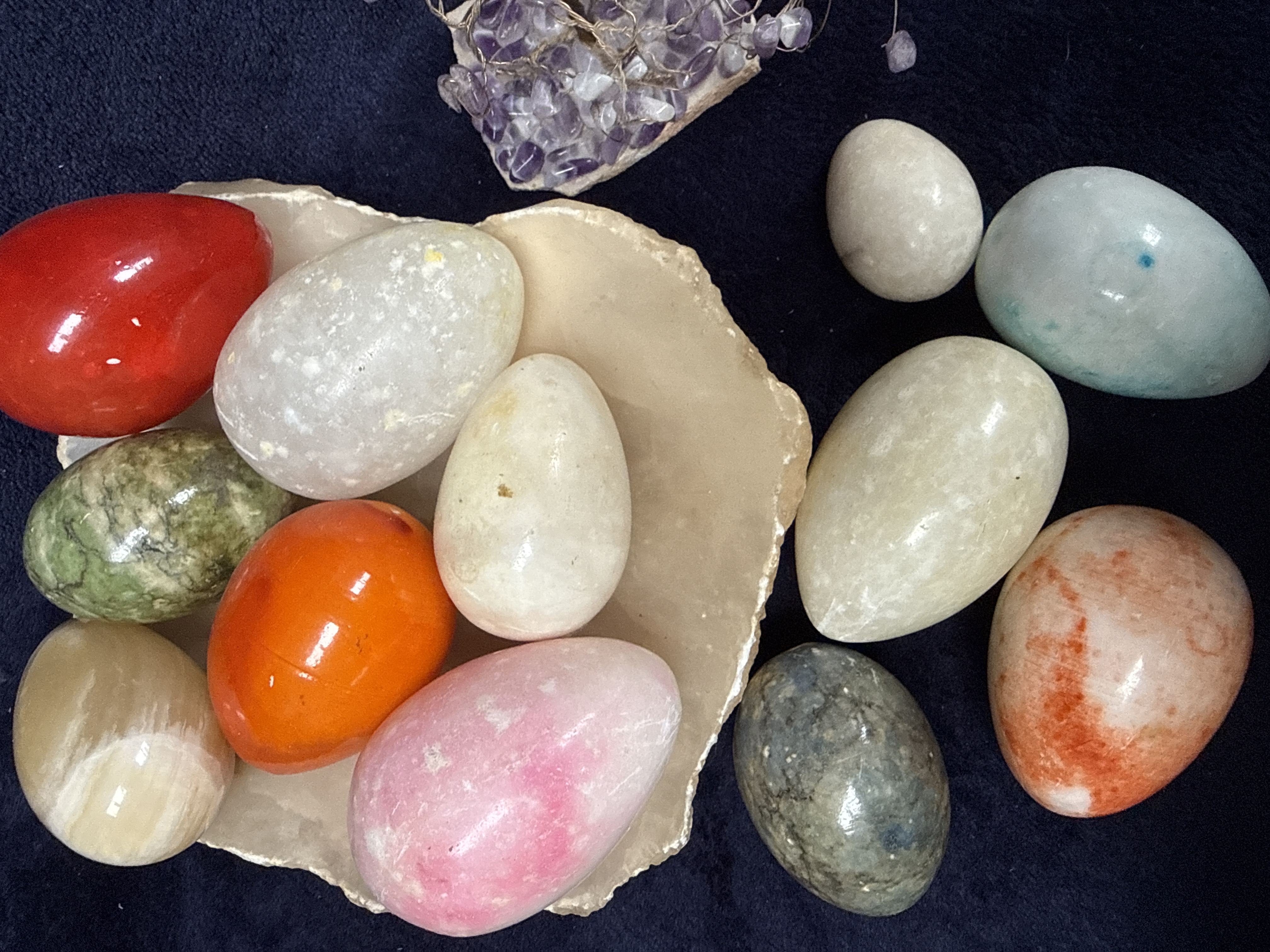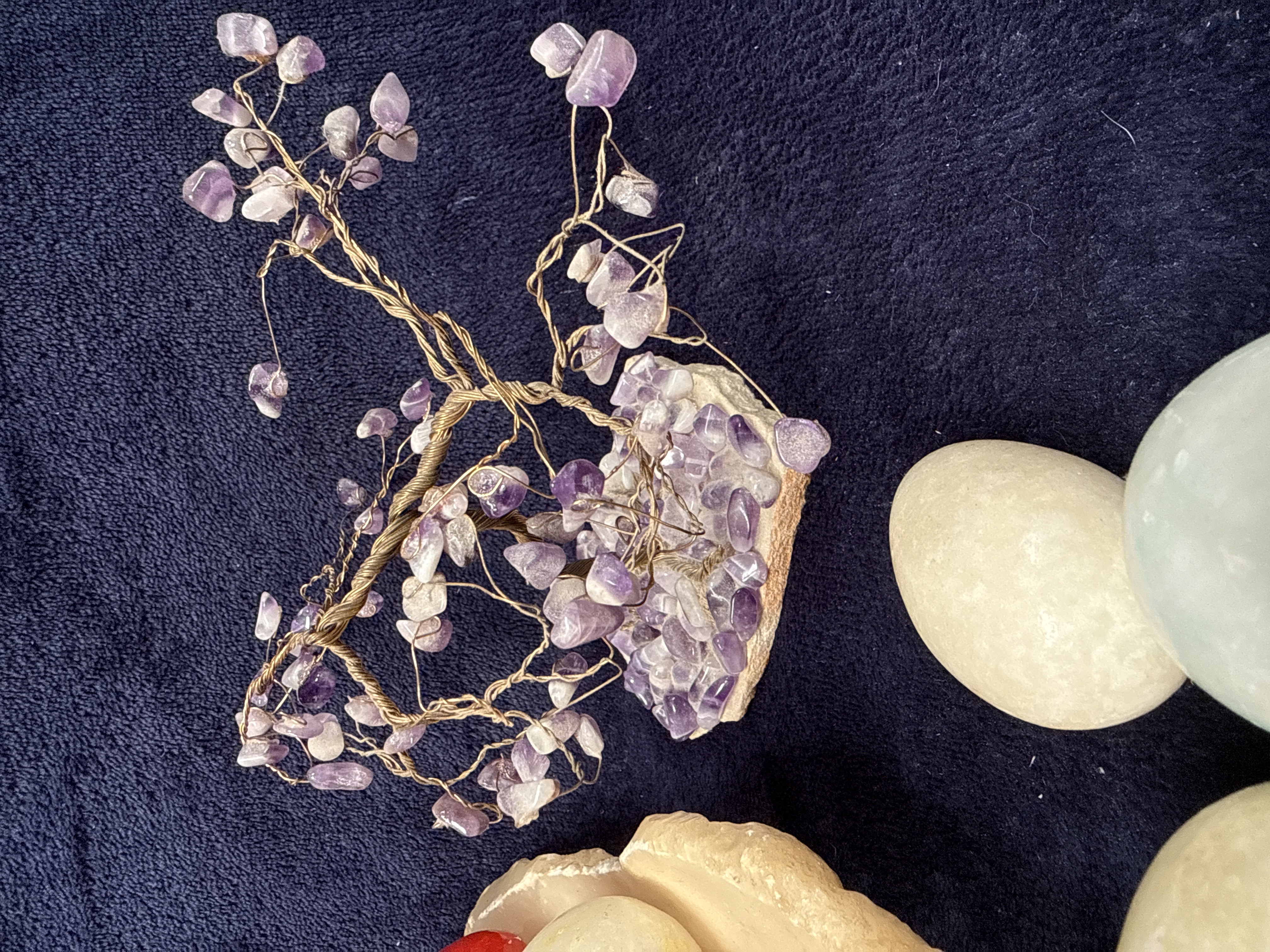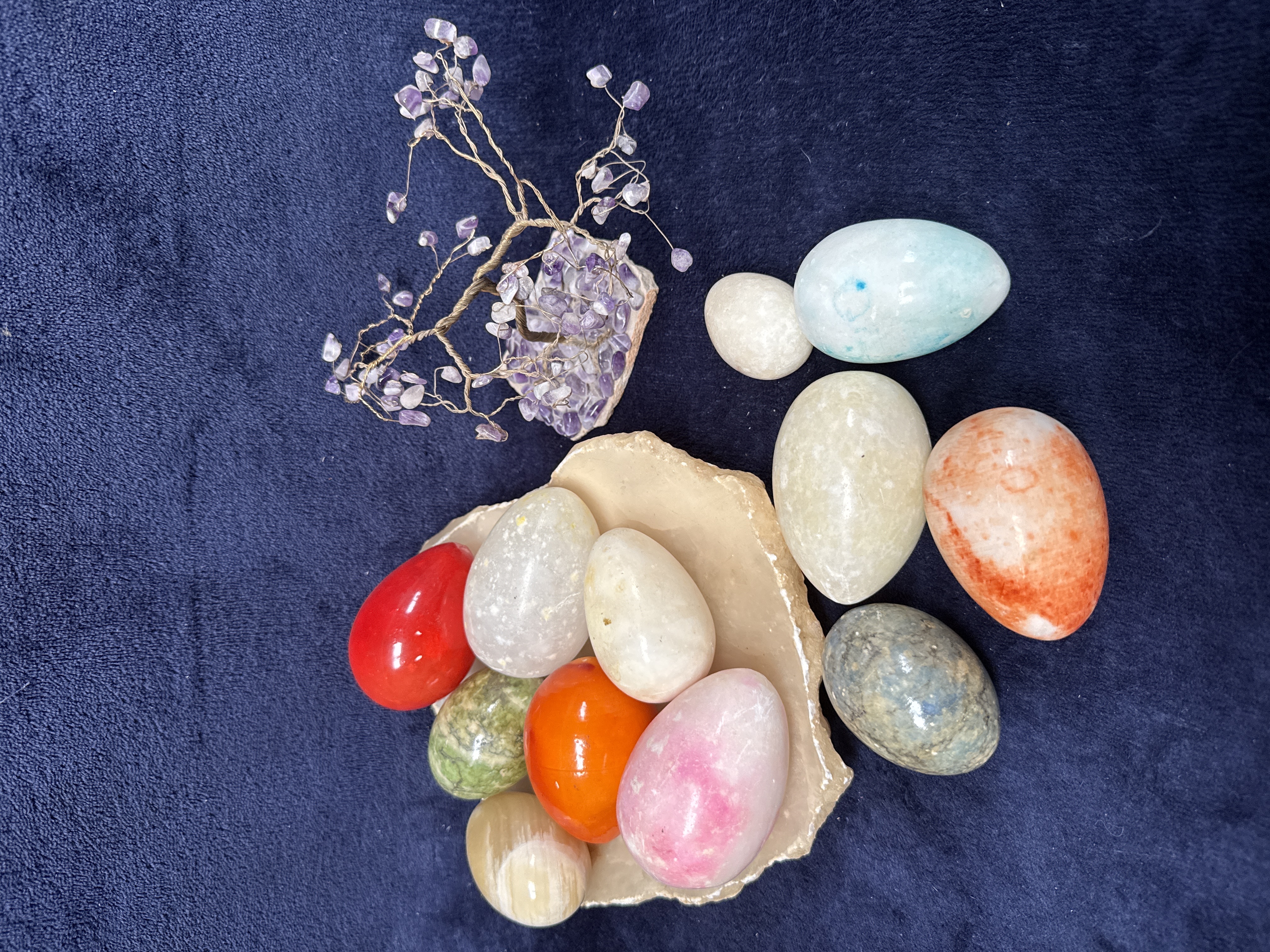 A collection of decorative mineral items comprising several polished stone eggs in varying sizes and colours, including solid red, orange, and pink, as well as mottled green, blue, and cream tones. The eggs are carved and polished from various minerals, including marble, alabaster, and onyx. The lot includes a cream-coloured stone platter with a polished top surface and rough-hewn edges. Also present is a wire-work gemstone tree featuring twisted brass-tone wire branches set with purple amethyst-style stone chips, mounted on a rough-hewn stone base. No maker’s marks, signatures, or hallmarks are visible on any of the items.