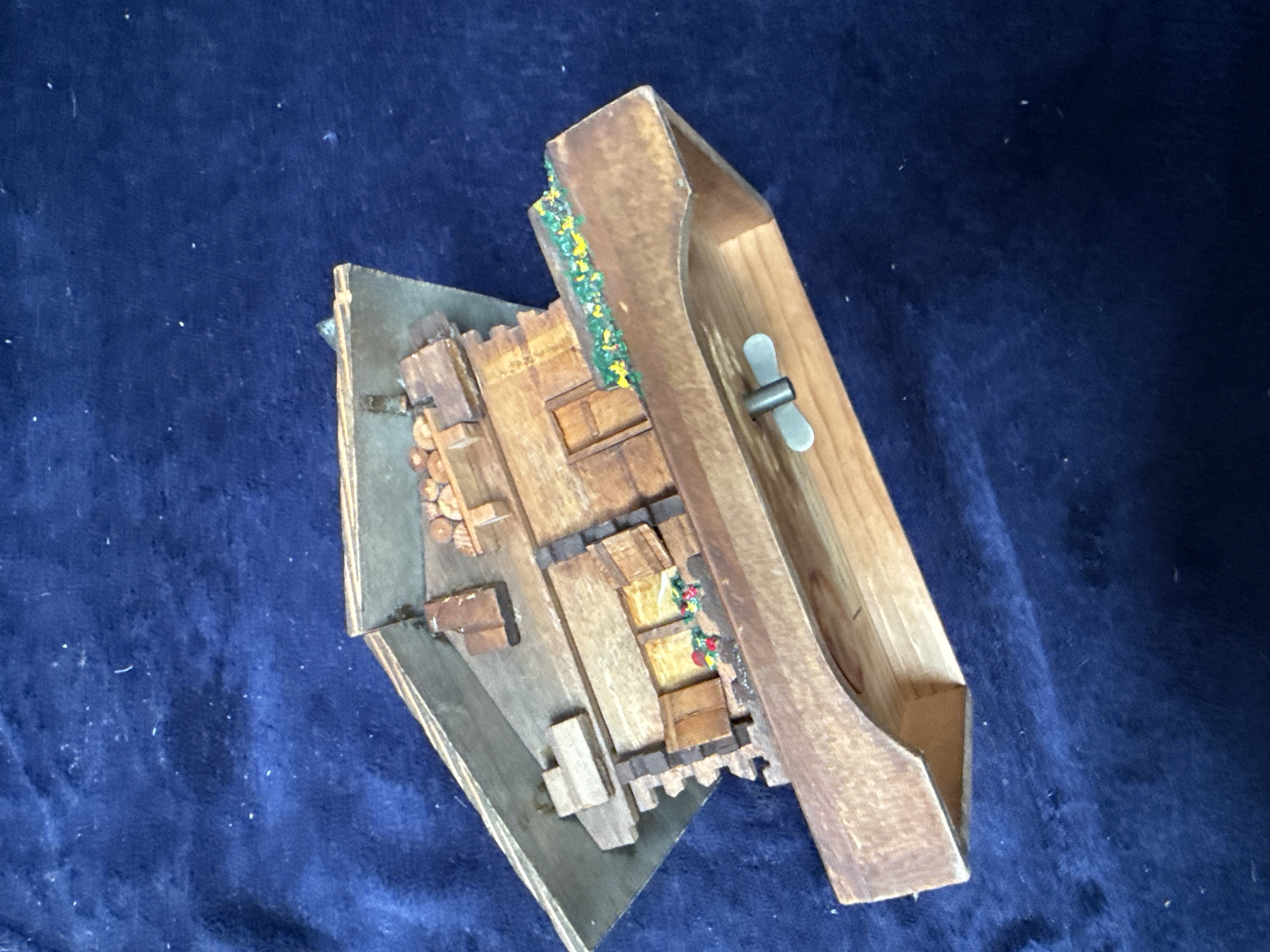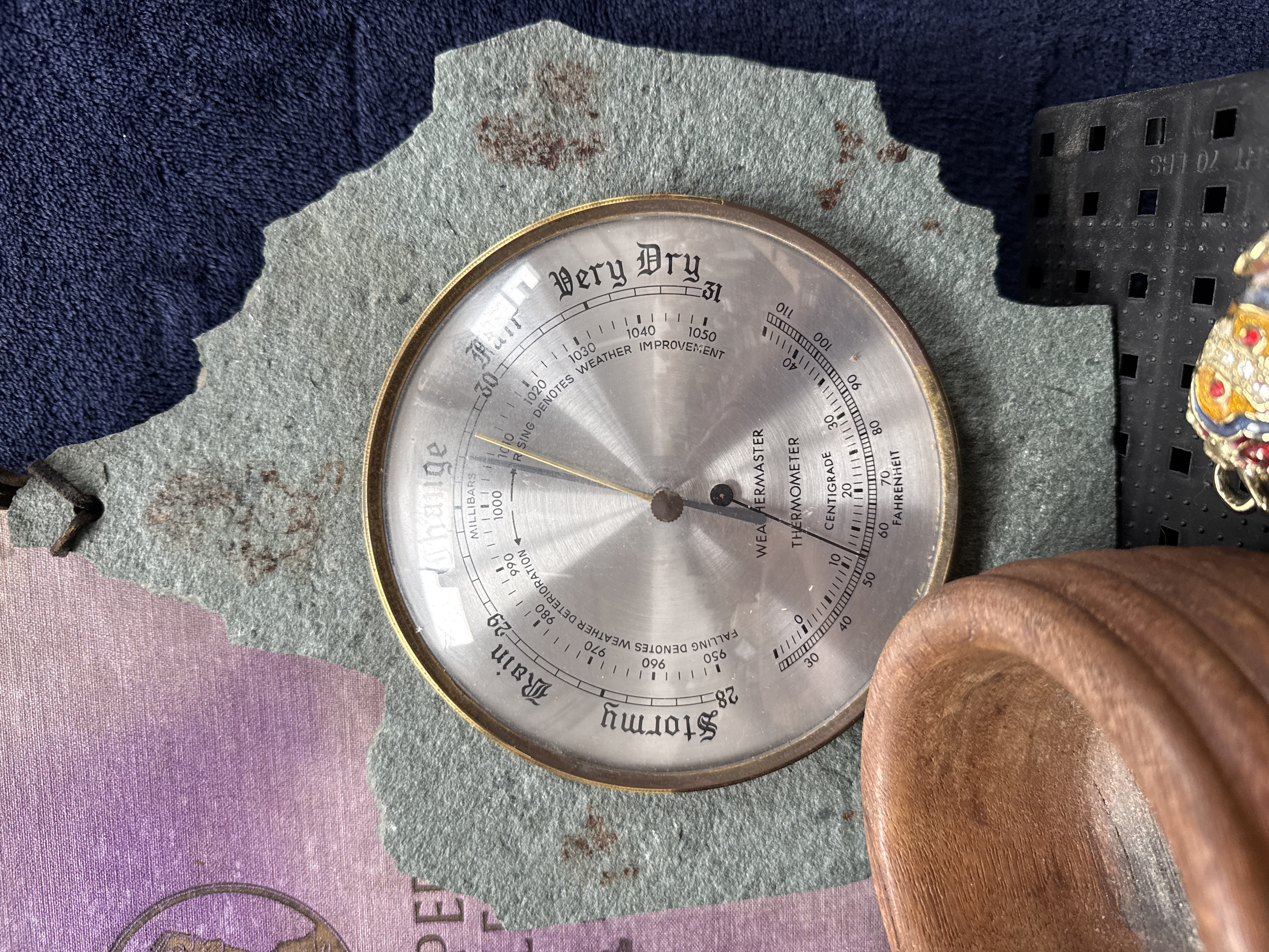 An assortment of decorative items and collectables. The group includes a Weathermaster barometer and thermometer mounted on a rough-hewn green slate base, featuring a silvered dial with black lettering. Also present is a commemorative book titled King Emperor Jubilee 1910-1935, a vintage brown leather camera case with strap, and an embroidered black velvet box decorated with floral beadwork. The ceramic selection comprises two plates with vibrant polychrome concentric patterns, a small porcelain dish depicting ducks in flight, and a larger plate featuring black and white geometric designs with a Greek key border. Completing the lot is a small wooden music box modelled as a Swiss chalet, a turned wooden container, and a small metal elephant figurine.