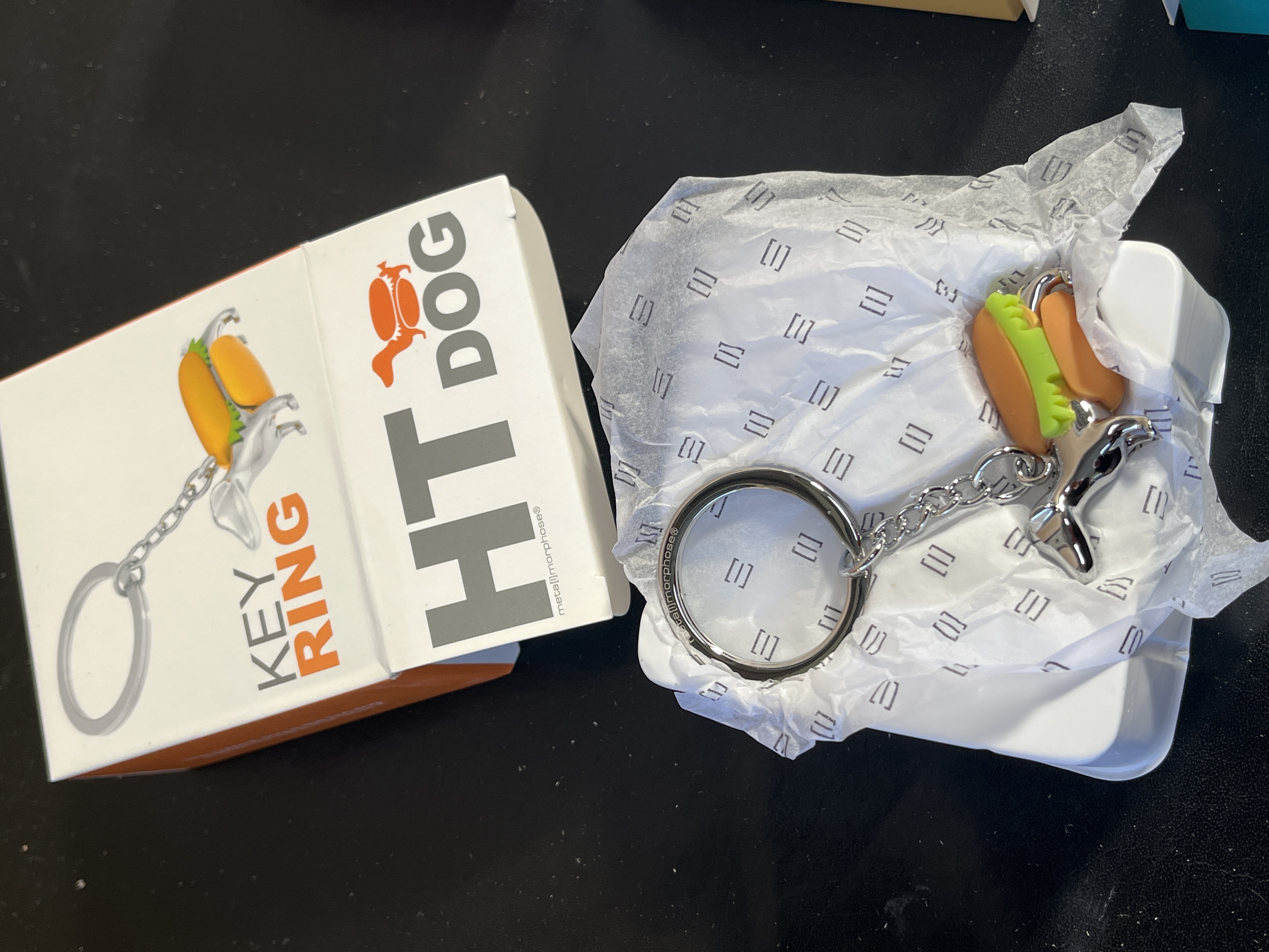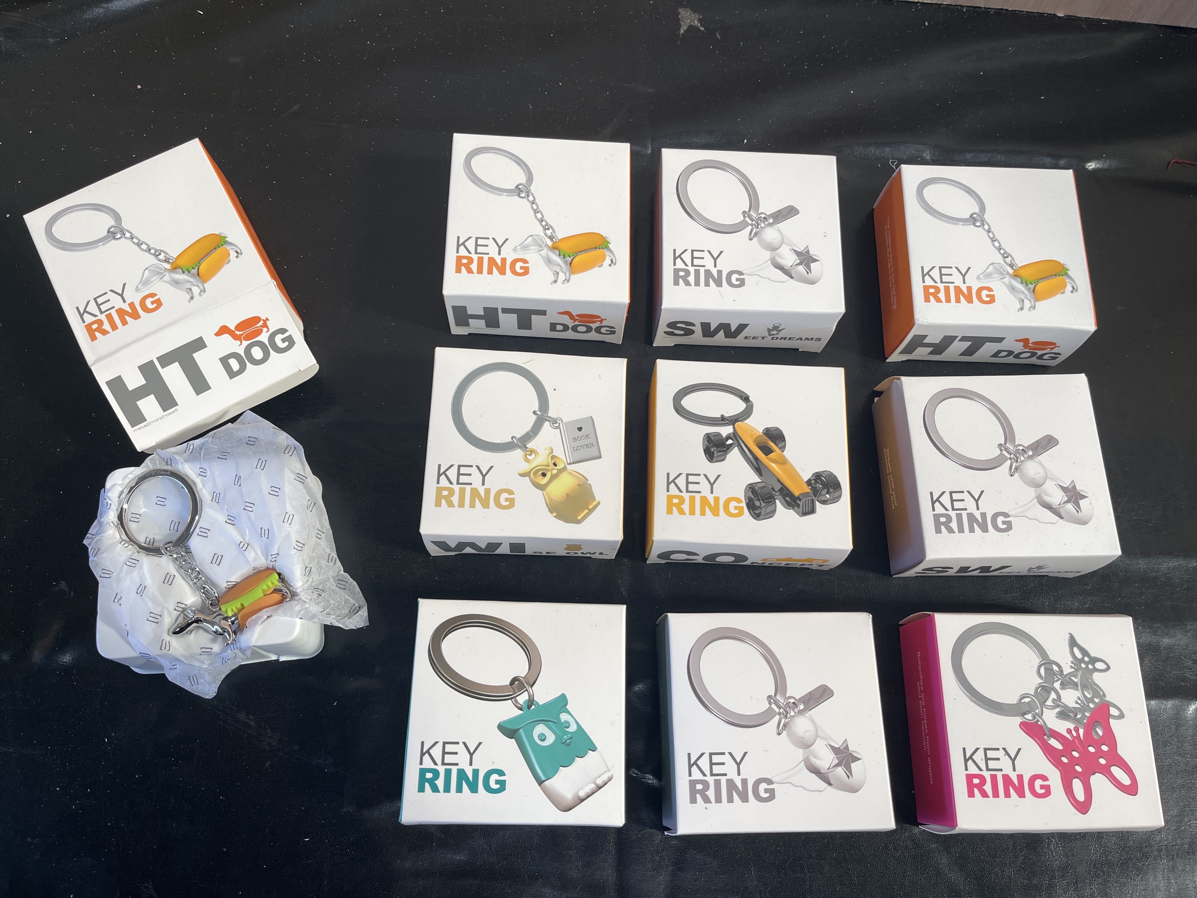 A collection of novelty keyrings manufactured by Metalmorphose. Each item features a polished silver-tone metal split ring and chain attached to a multi-coloured charm. The collection includes various thematic designs such as the HT DOG (a dachshund in a hot dog bun), SW EET DREAMS, WI SE OWL, CO NCEPT (a racing car), a butterfly, and a teal owl. The metal split rings are incised with the Metalmorphose brand name and registered trademark symbol. Each keyring is housed in its original branded white cardboard retail box with a slide-out tray and branded tissue paper.