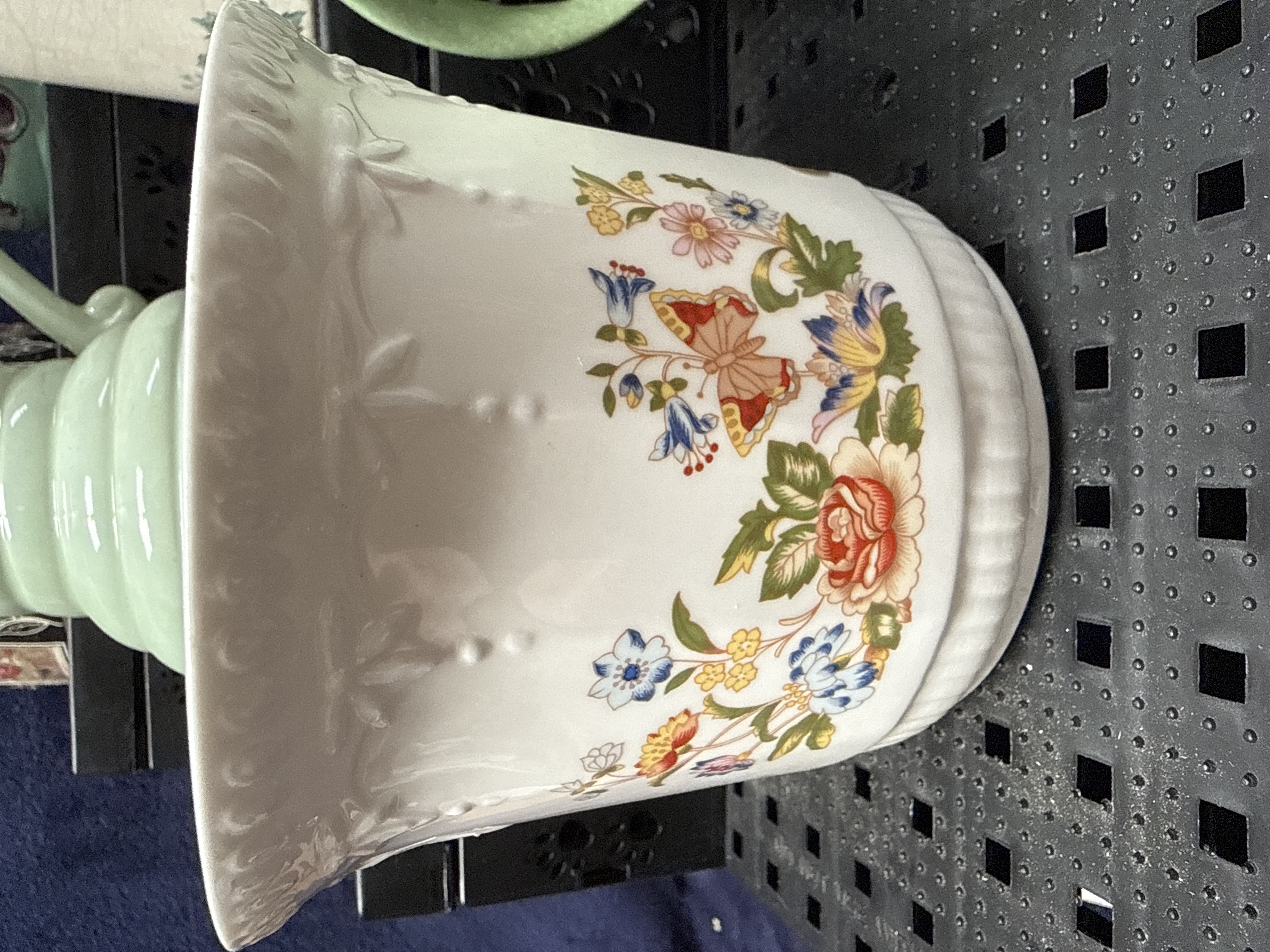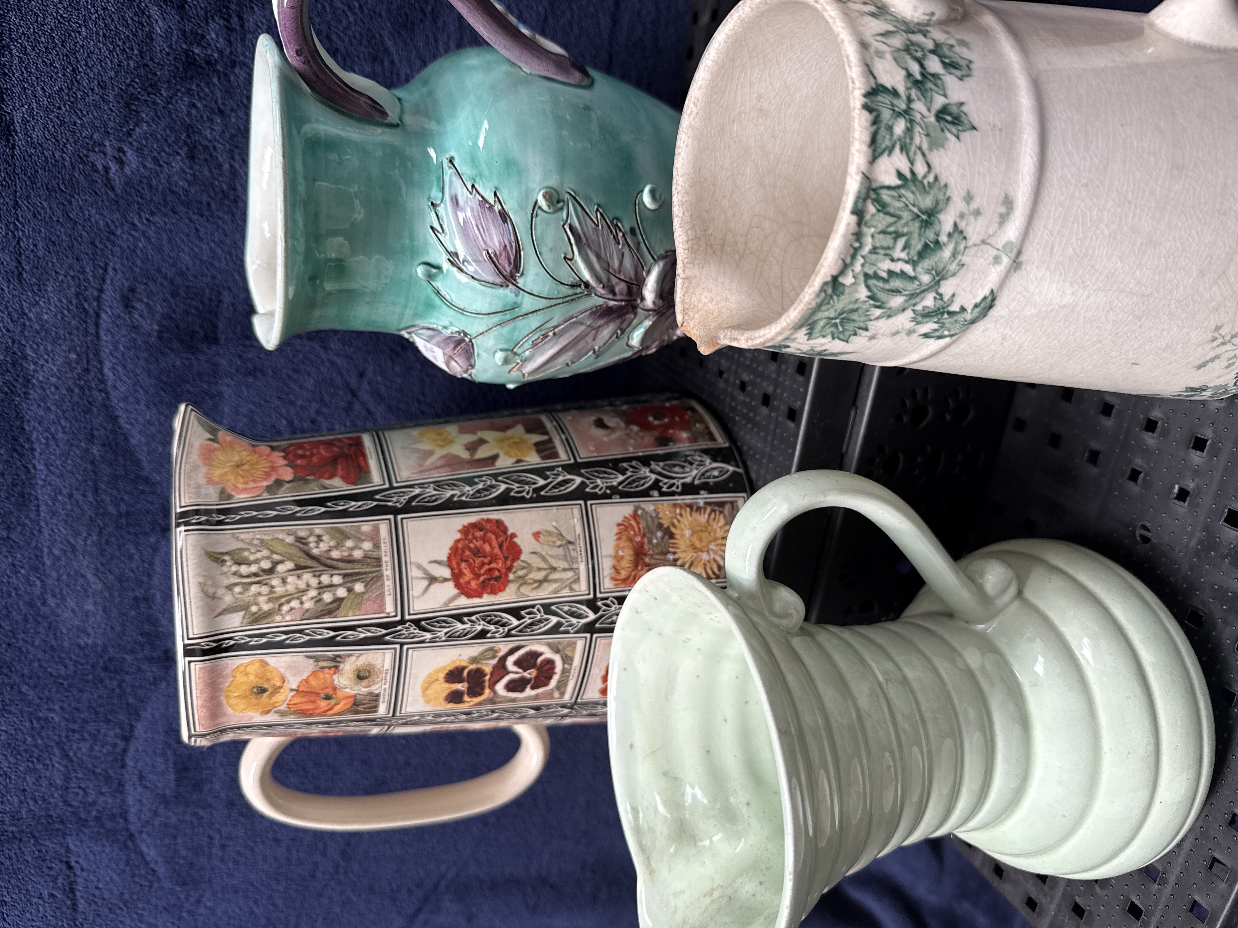 A collection of six assorted ceramic items comprising five decorative jugs and one planter. The group features a variety of styles, including an Art Deco style pale green glazed jug resembling Staffordshire Roddy Ware, characterised by horizontal concentric ribbing and a flared rim. Also included is a large earthenware jug of tapering rectangular section with rounded corners, decorated with transfer-printed botanical panels featuring Lily of the Valley, Pansy, and Carnation. The collection contains a majolica-style earthenware jug with a turquoise glaze and relief-moulded floral decoration, finished with a contrasting purple glazed handle. A nineteenth-century style creamware or ironstone jug of cylindrical form is decorated with a green transfer-printed scrolling vine leaf pattern. Additionally, there is a rounded earthenware jug with a pinched pouring spout finished in a matte speckled green glaze, and a white glazed earthenware planter with relief-moulded foliate and beaded borders featuring a transfer-printed butterfly and floral motif. No maker marks are visible on the bases of the items.