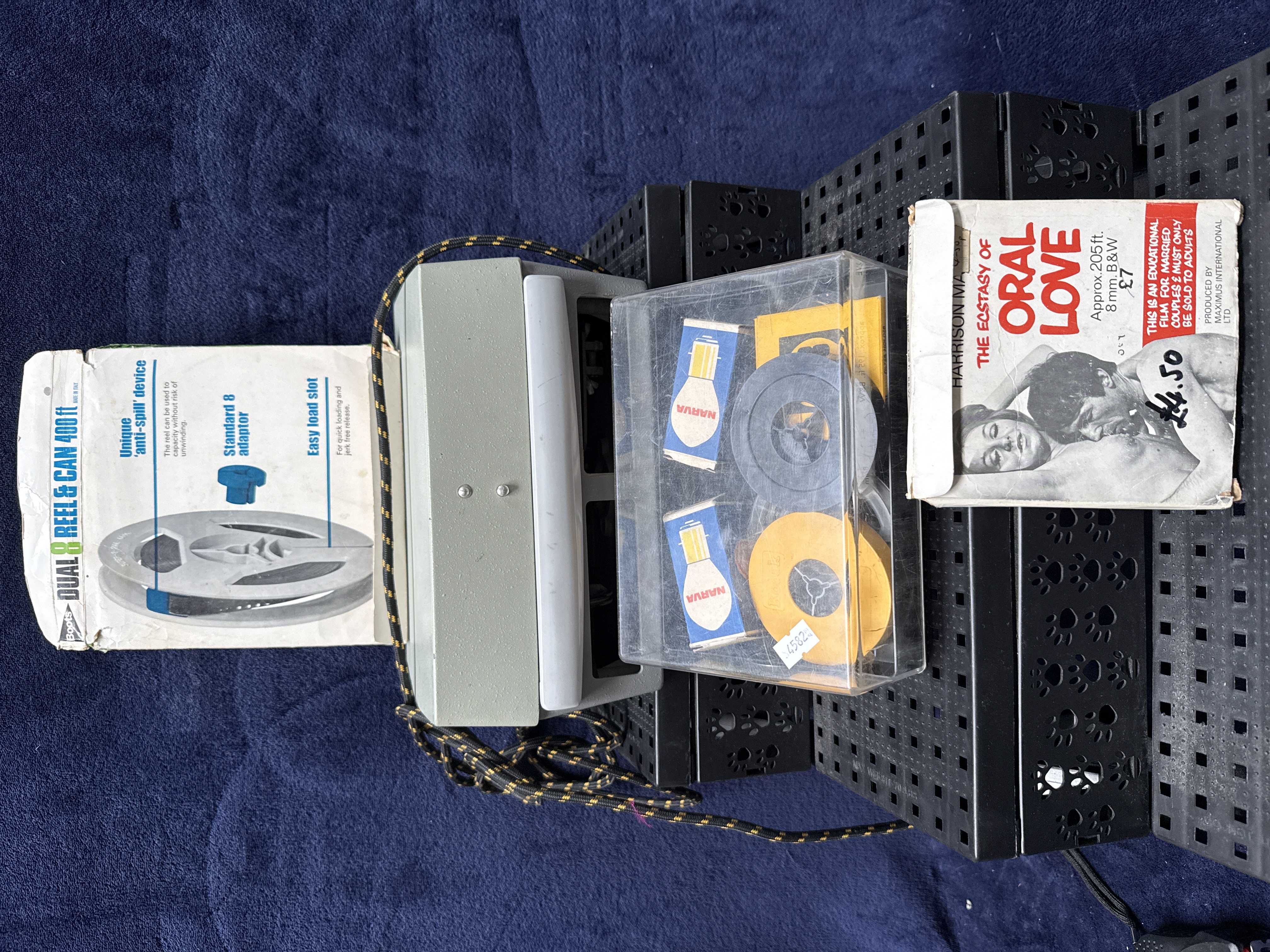 This collection consists of various mid-20th-century 8mm film accessories and ephemera originating from the United Kingdom. The lot includes an original cardboard retail box for a Boots Dual 8 Reel and Can, specified for 400 feet and featuring an anti-spill device and standard 8 adaptor, marked as made in Italy. Also present is a vintage desktop film viewer or editor constructed with a grey-painted metal body, white plastic components, and an attached braided power cable. A clear plastic storage case contains two Narva brand bulb boxes, one grey plastic film reel, one yellow plastic film reel, and associated yellow printed paperwork. The collection further includes an original cardboard sleeve for a Harrison Marks 8mm black and white film titled The Ecstasy of Oral Love, produced by Maximus International Ltd. The sleeve features a black and white offset lithograph photograph of a man and woman in an embrace and carries text stating it is an educational film for married couples. George Harrison Marks (1926–1997) was a notable British photographer and filmmaker influential in the glamour and adult film industries from the 1950s to the 1970s.