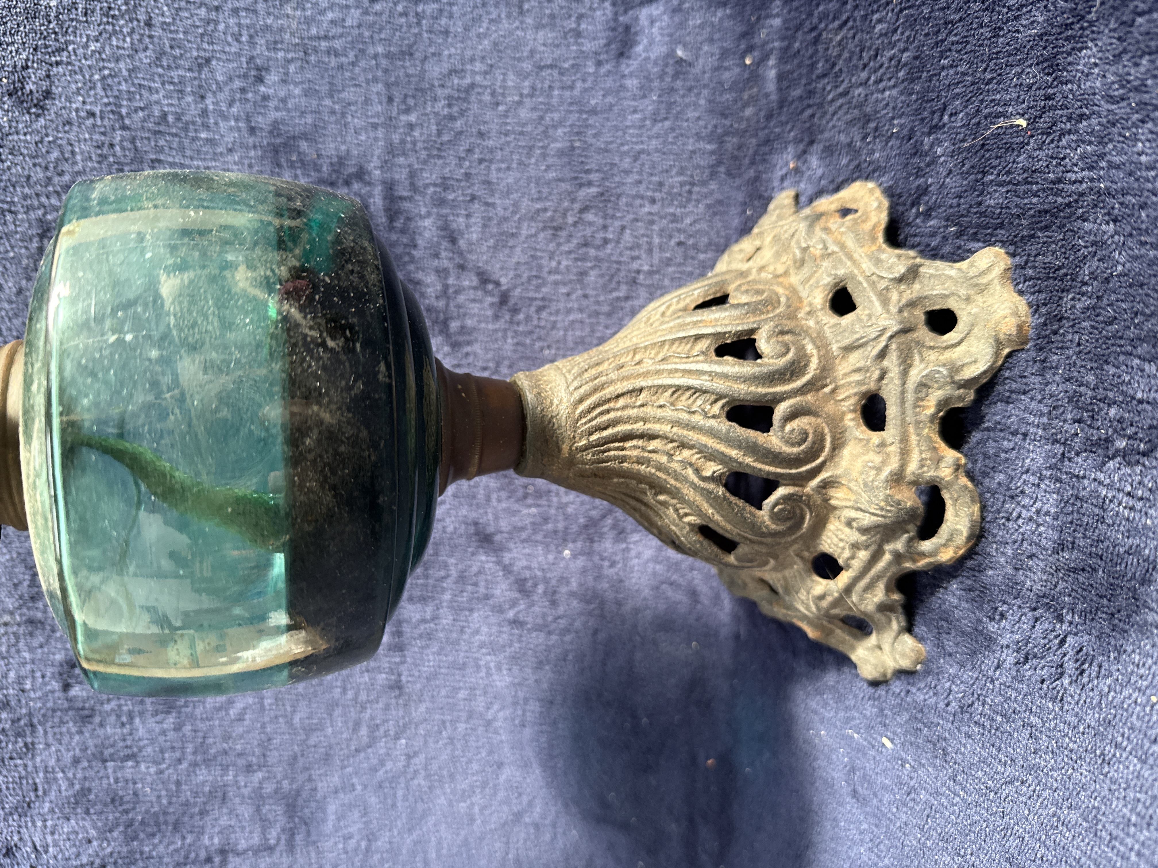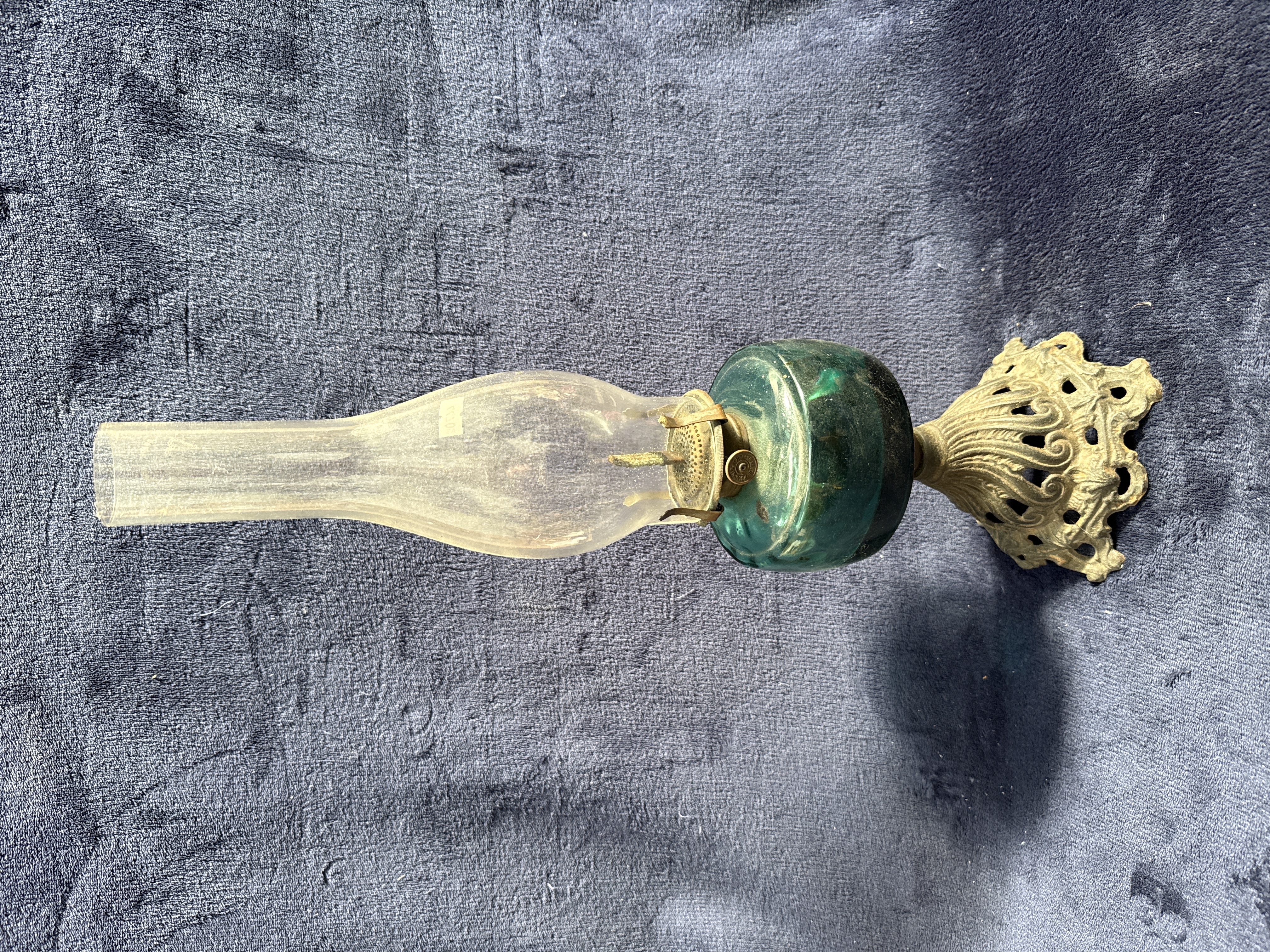 This 19-inch standing kerosene lamp features a turquoise-coloured glass font and a clear glass chimney. The piece is constructed with an ornate, pierced cast metal base displaying scrolling foliate and rococo-style motifs. The metal burner assembly is fitted with an adjustment knob bearing stamped characters, though these are worn and illegible. A fabric wick remains inside the reservoir. The lamp is a traditional non-electrical paraffin or oil-burning model, typical of late 19th or early 20th-century British or European manufacture.