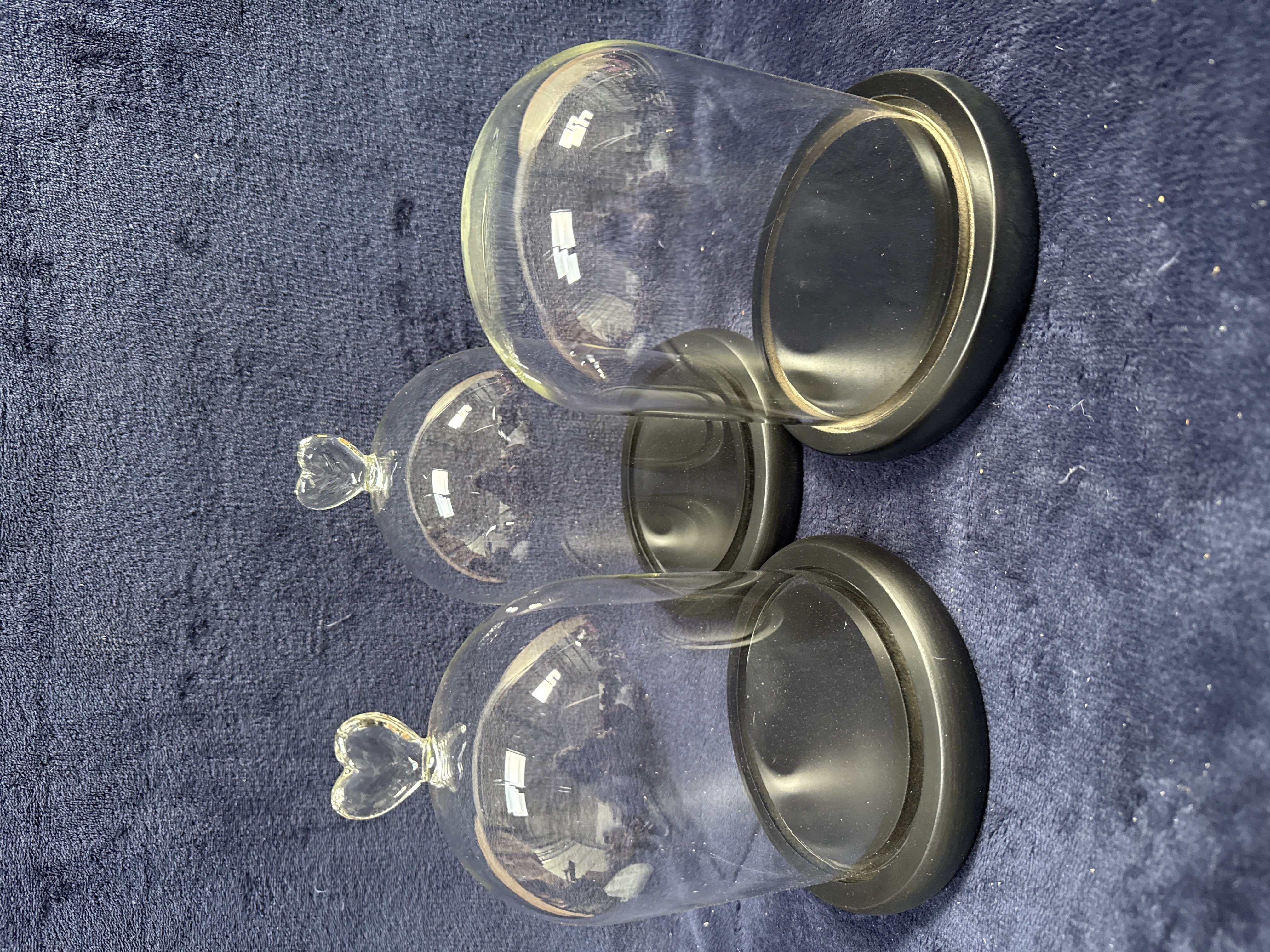 A trio of clear glass display domes, also referred to as cloches, each accompanied by a circular stepped base with a dark matte finish. The set includes two domes featuring applied heart-shaped glass finials and one plain rounded dome. The bases are constructed with a recessed channel to hold the glass securely. No maker marks or signatures are present on the items.