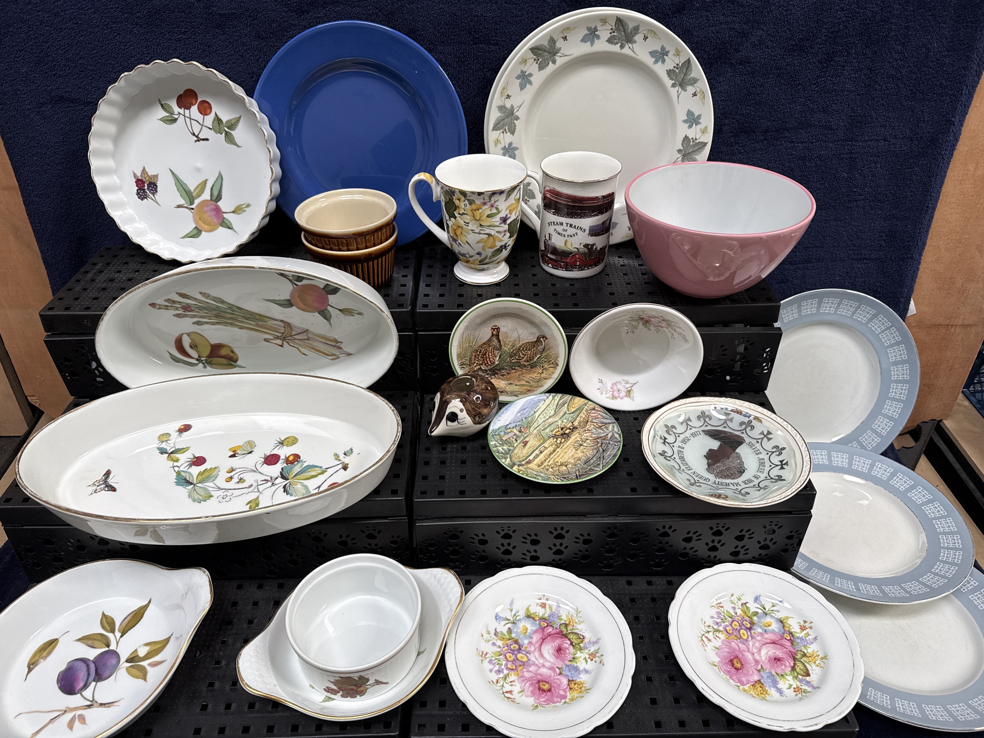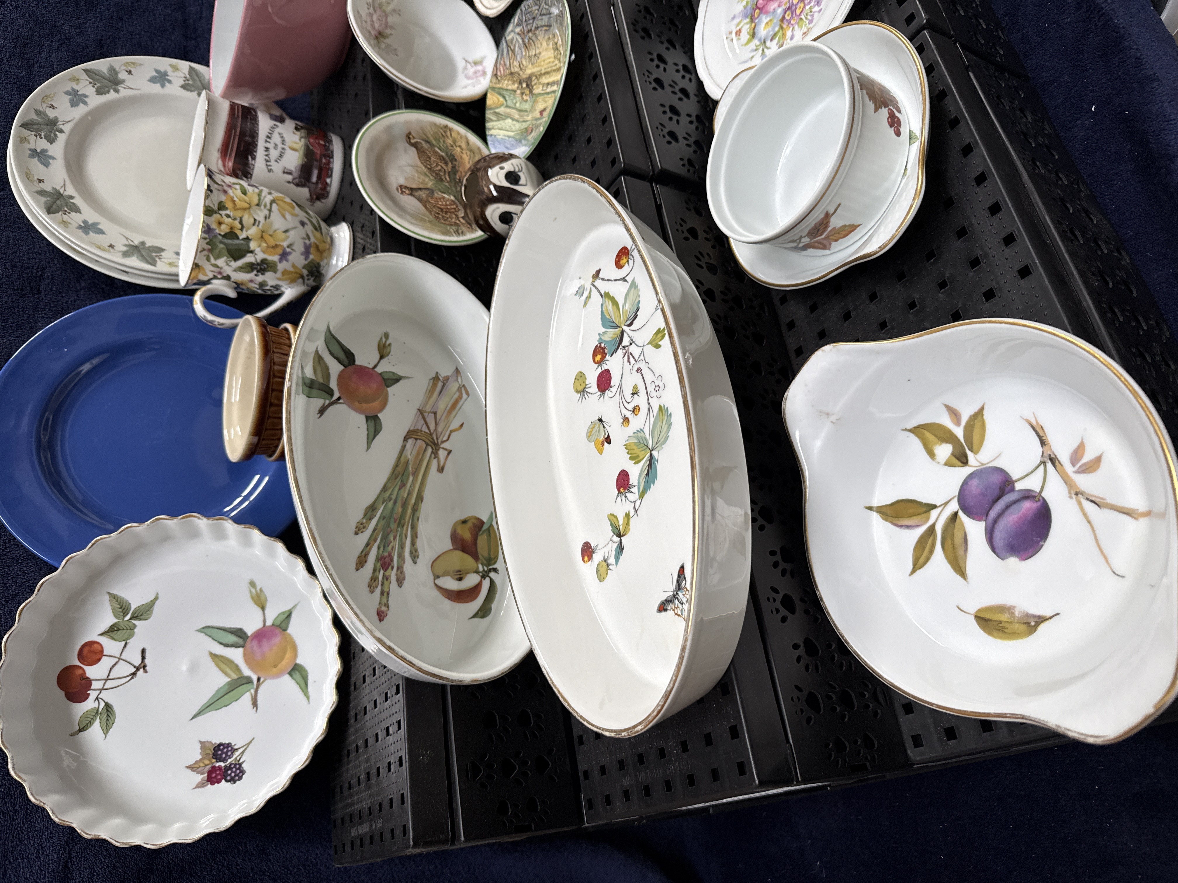 A collection of ceramic table and decorative wares, featuring several pieces of Royal Worcester porcelain in the Evesham Gold pattern. This group includes two large oval serving dishes decorated with transfer-printed fruit and botanical motifs including strawberries, butterflies, and asparagus; a fluted round quiche dish with cherry and peach designs; and a smaller handled serving dish depicting plums. All Evesham pattern pieces feature gilded rims.