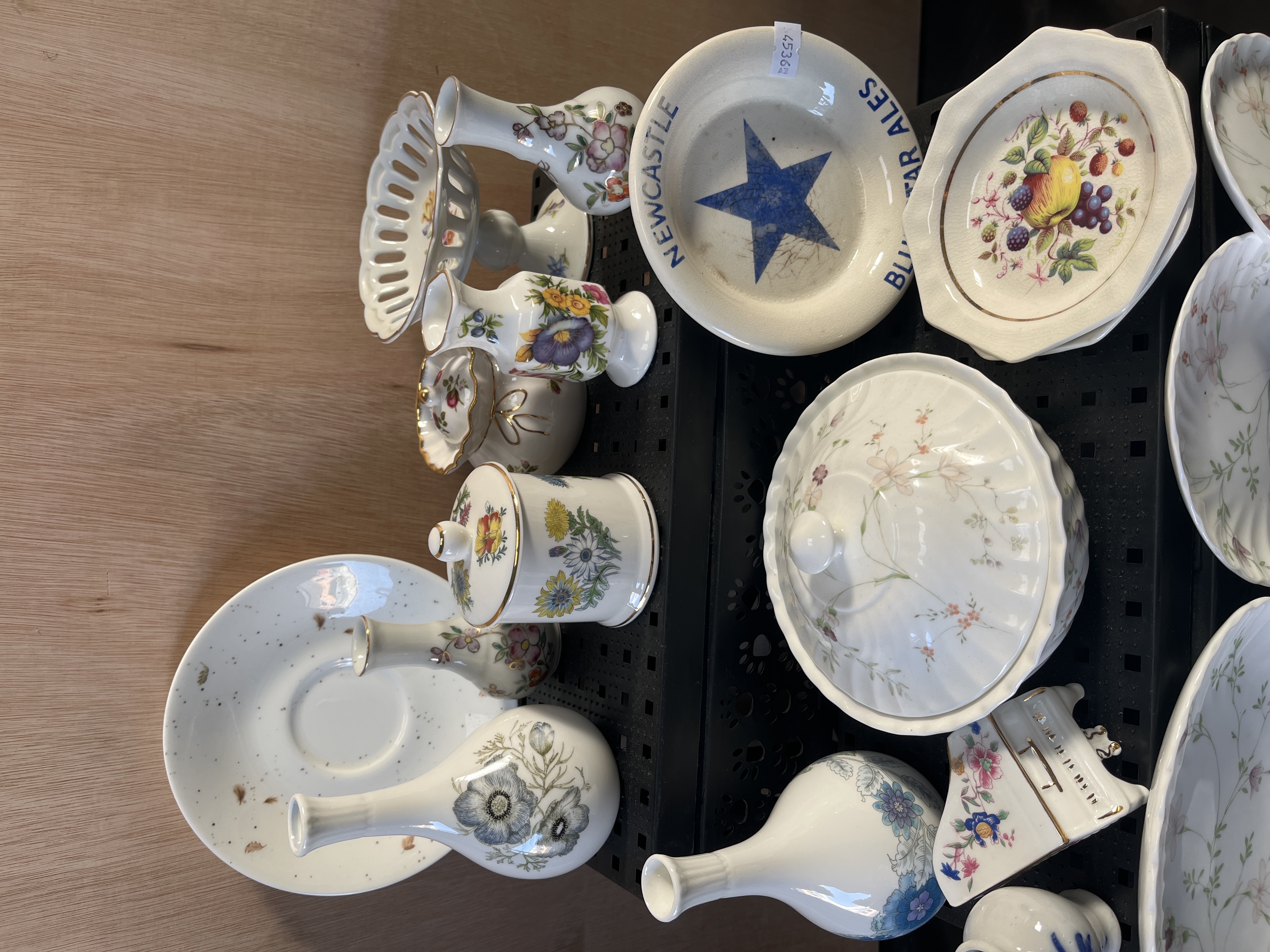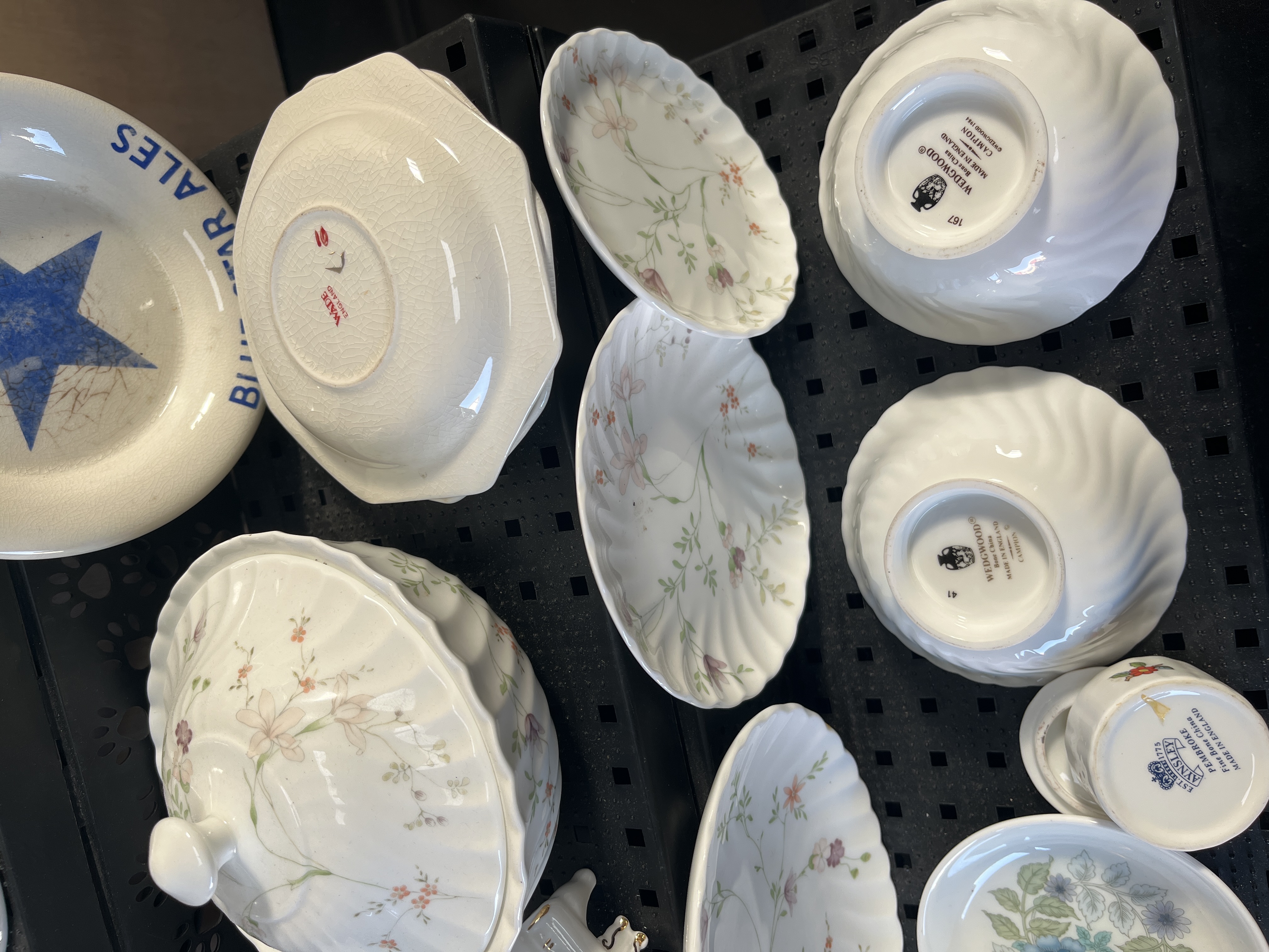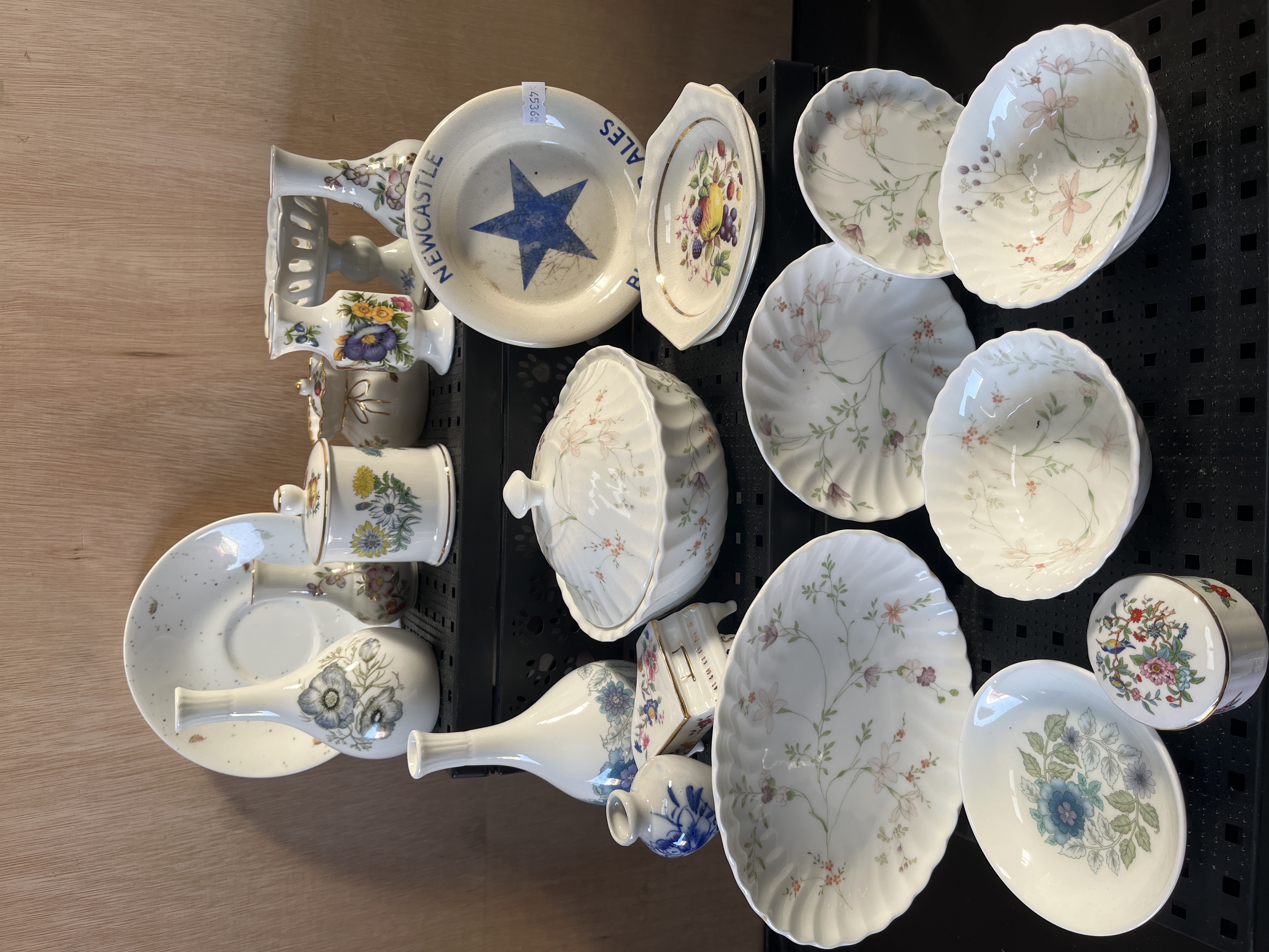 A collection of 20th-century British ceramics comprising various decorative and functional pieces from notable factories. The lot includes seven pieces of Wedgwood bone china in the Campion pattern, featuring a fluted, scalloped form decorated with delicate transfer-printed floral sprigs in tones of pink, purple, and orange. This group consists of one lidded vegetable tureen, two bowls, and four smaller crescent or shell-shaped dishes. The bases of the bowls bear a black printed mark depicting an urn symbol with the text: WEDGWOOD, Bone China, MADE IN ENGLAND, CAMPION, © WEDGWOOD 1984, and numerical codes 167 and 41. Also included is an Aynsley fine bone china lidded pot in the Pembroke pattern, decorated with a colourful transfer-printed bird amongst floral branches and finished with a gilt rim. The base features a blue printed mark with a crown motif and the text: EST. 1775, AYNSLEY, PEMBROKE, Fine Bone China, MADE IN ENGLAND. The collection further contains a small Wade earthenware dish with an octagonal rim, decorated with a central fruit motif and a gold border, marked WADE ENGLAND in red with a hand-painted numeral 10. An earthenware advertising dish for Newcastle Blue Star Ales features a central blue five-pointed star and the brand name printed around the rim. Completing the lot are four assorted bone china bud vases with various floral decorations including poppies and pansies, a cylindrical lidded jar decorated with British wildflowers, and a white-glazed pierced footed compote.