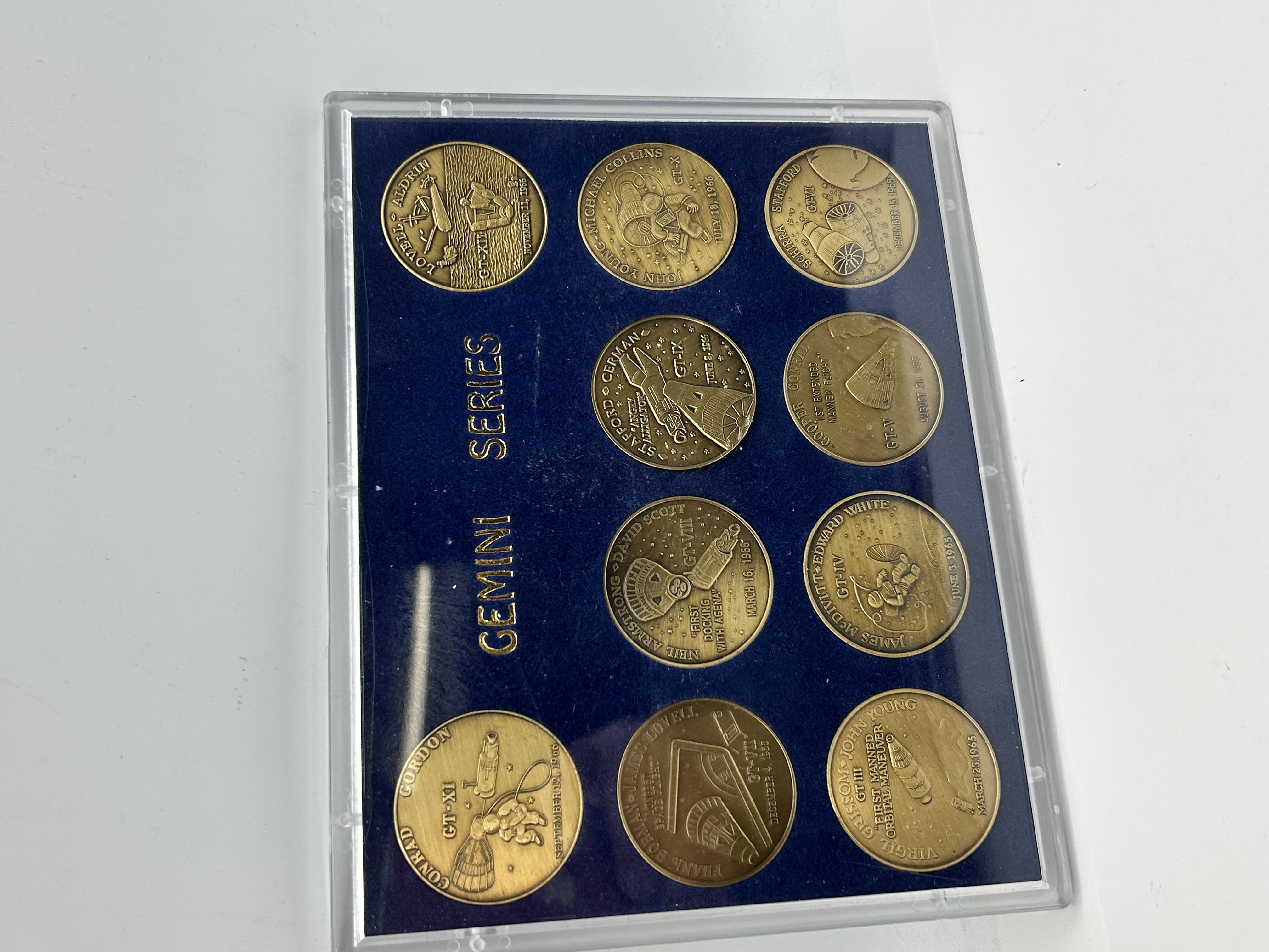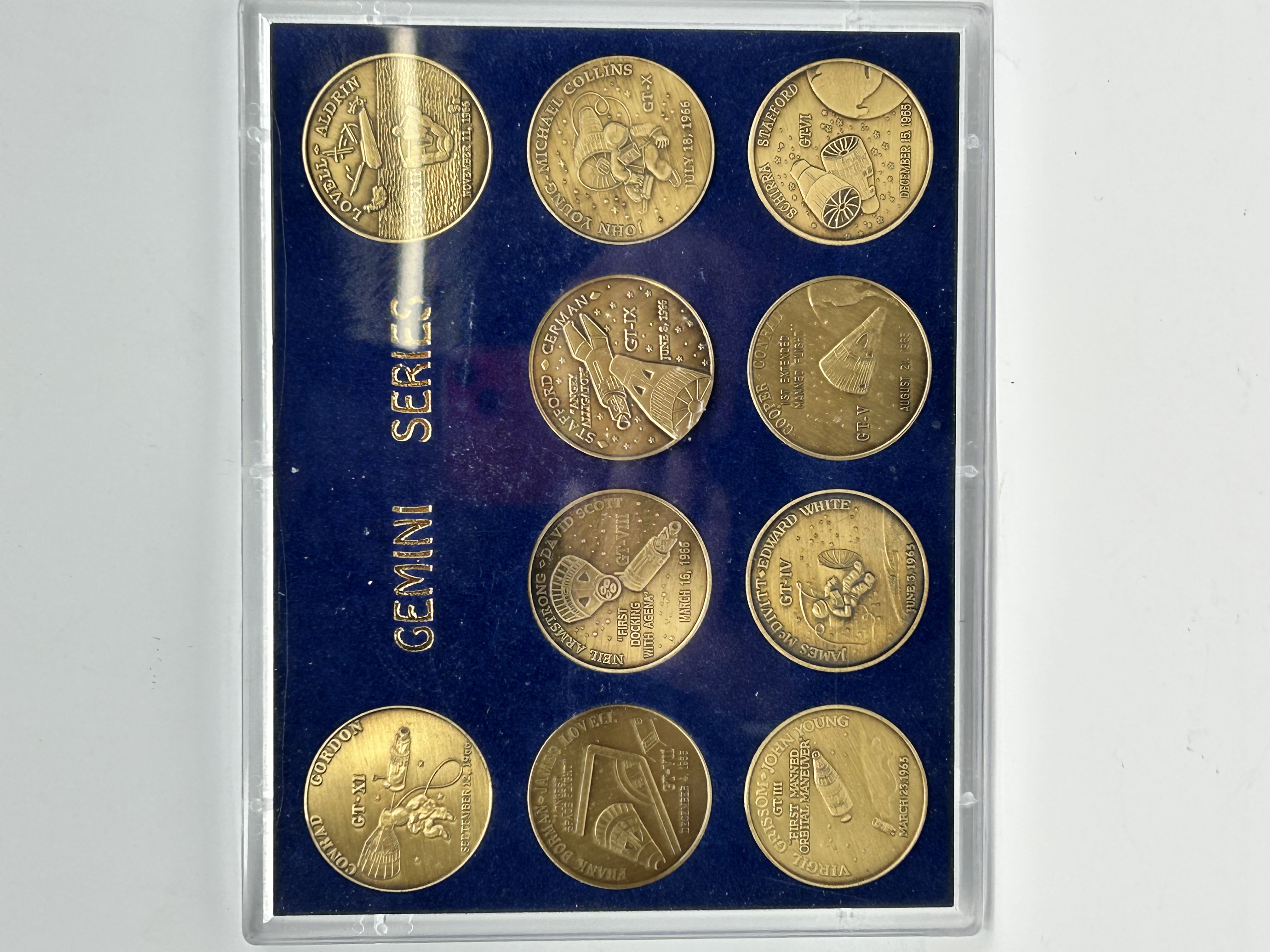 A set of commemorative medals from the Gemini Series, attributed to Galaxy Medals. The collection consists of medals struck in gold-coloured metal, commemorating NASA Gemini missions from 1965 to 1966. Each medal corresponds to a specific mission from GT-III to GT-XII. Inscriptions include mission designations, crew member names such as Grissom, White, Armstrong, and Aldrin, and mission achievements including FIRST MANNED ORBITAL MANEUVER and FIRST DOCKING WITH AGENA. The medals are housed in a blue velvet-lined display tray within a clear plastic case featuring gold-toned embossed lettering.