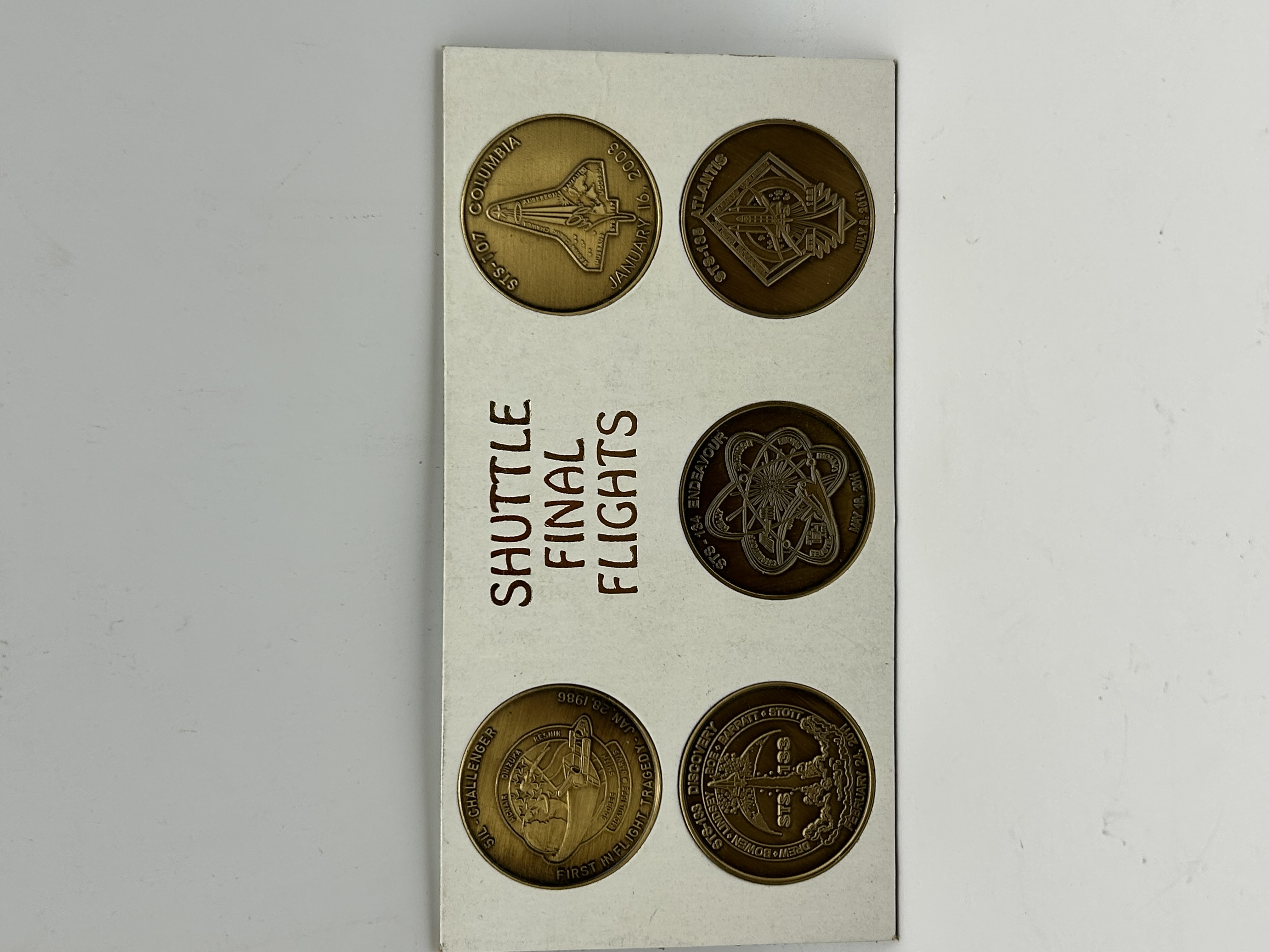A collection of commemorative medals struck in bronze-toned metal, mounted on a white display card titled SHUTTLE FINAL FLIGHTS. The medals commemorate significant and final missions of the NASA Space Shuttle programme. The obverses feature mission emblems in relief, including STS-107 Columbia (January 16, 2003), STS-135 Atlantis (July 8, 2011), STS-134 Endeavour (May 16, 2011), 51-L Challenger (January 28, 1986) inscribed FIRST IN FLIGHT TRAGEDY, and STS-133 Discovery (February 24, 2011). The Challenger and Discovery medals include inscribed crew surnames. The reverses are obscured by the mounting card.