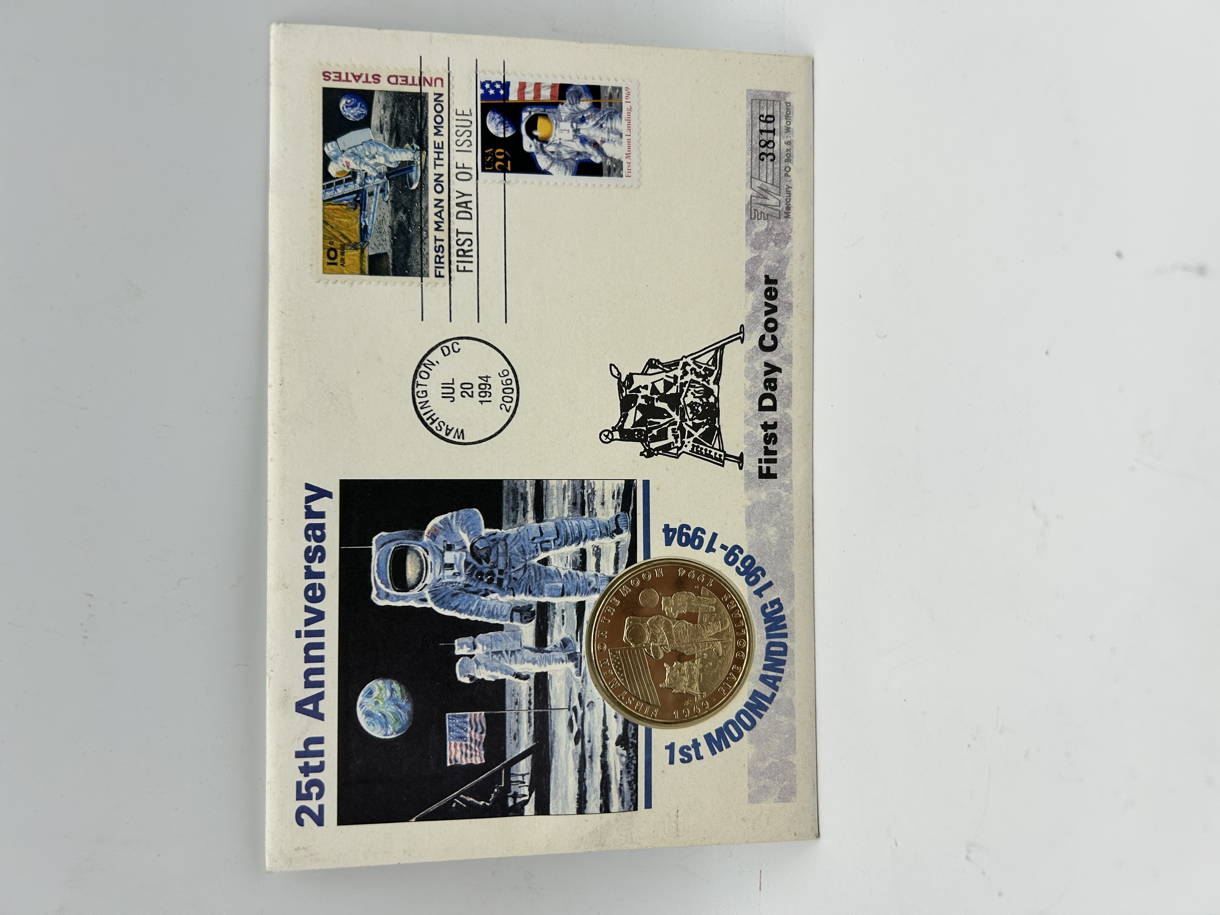 Philatelic Numismatic Cover (PNC) produced by Mercury, Watford, commemorating the 25th anniversary of the first moon landing. The cover features two United States stamps: a 10c First Man on the Moon airmail issue (Scott #C76) and a 29c First Moon Landing commemorative (Scott #2841). Both stamps are cancelled with a Washington, DC circular date stamp dated 20 July 1994, featuring First Day of Issue bar cancels. The cachet includes a multi-coloured illustration and an embedded gold-toned five-dollar commemorative medallion. The medallion is inscribed First Men on the Moon 1969-1994 and Five Dollars. The envelope bears the printed reference M 3816 and the distributor mark Mercury : PO Box 5 : Watford.