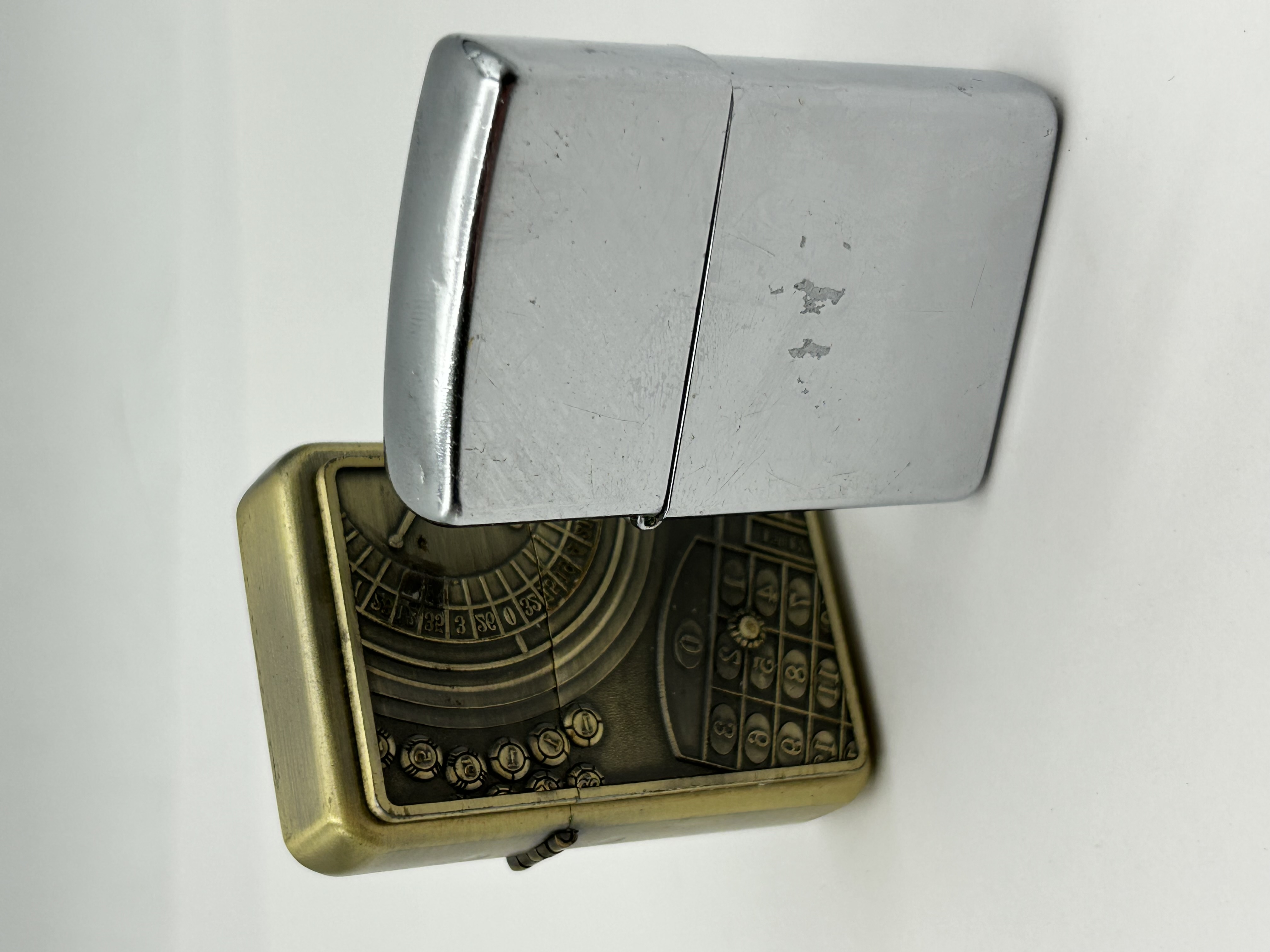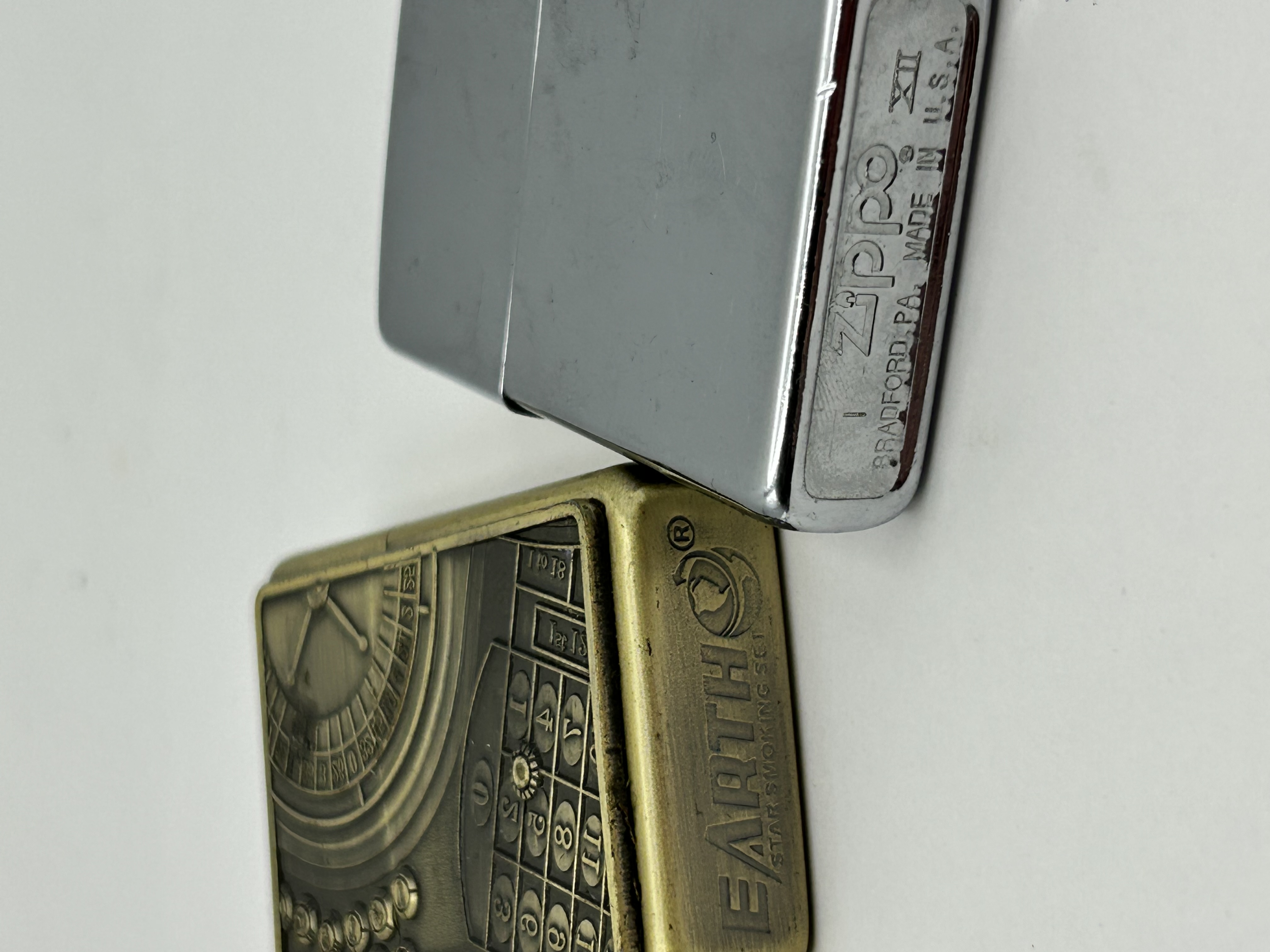 A collection of two metal flip-top pocket lighters. The first is a polished silver-toned lighter manufactured by Zippo. The base is stamped with the characters I, Zippo, XII, and BRADFORD PA. MADE IN U.S.A., which identifies the manufacture date as September 1996. The second item is a brass-toned lighter featuring an embossed relief design of a casino roulette wheel and a betting grid. The side of this lighter is marked with a circular logo and the text EARTH STAR SMOKING SET. Both lighters are of standard rectangular form with hinged lids and metal construction.