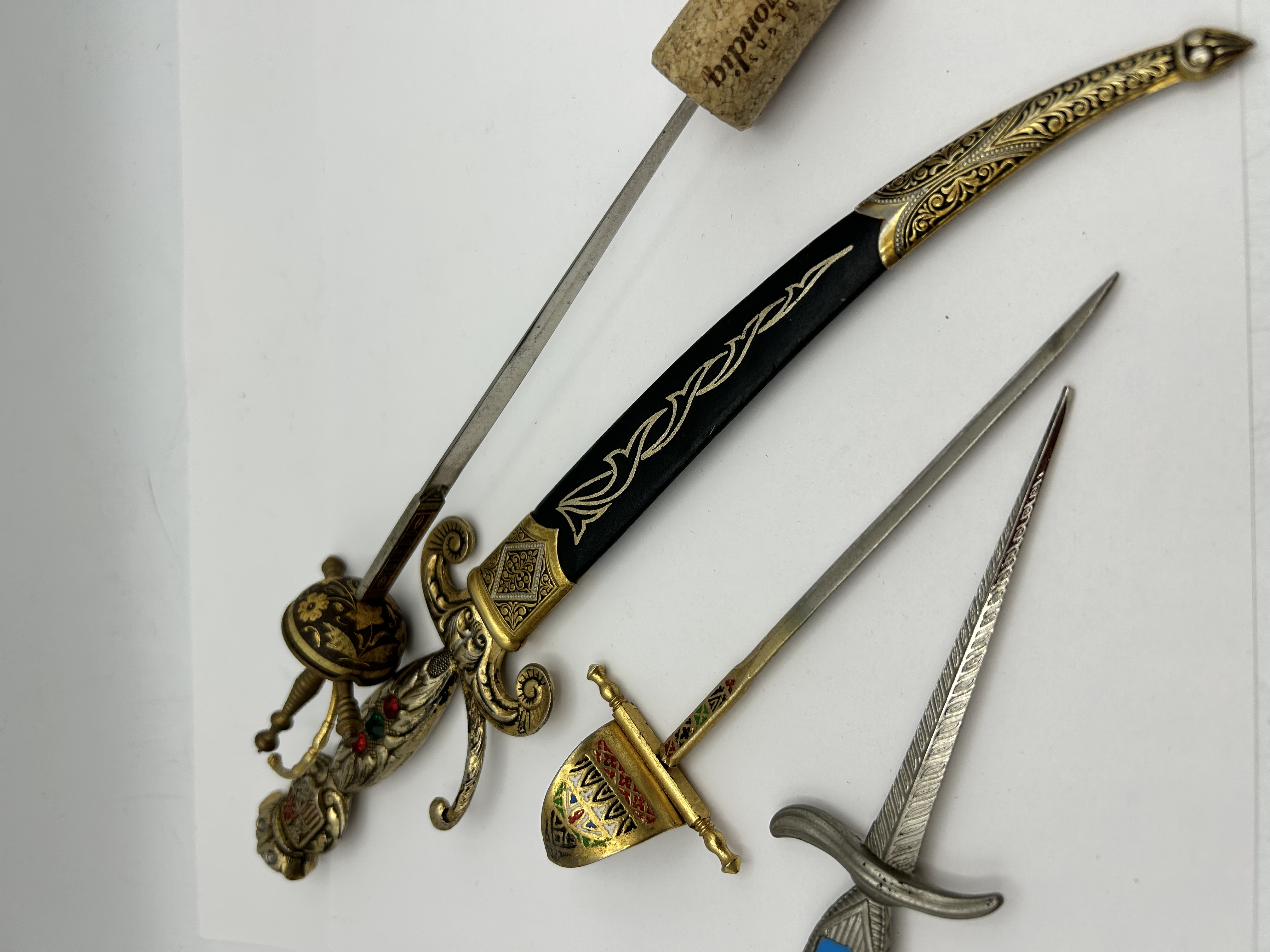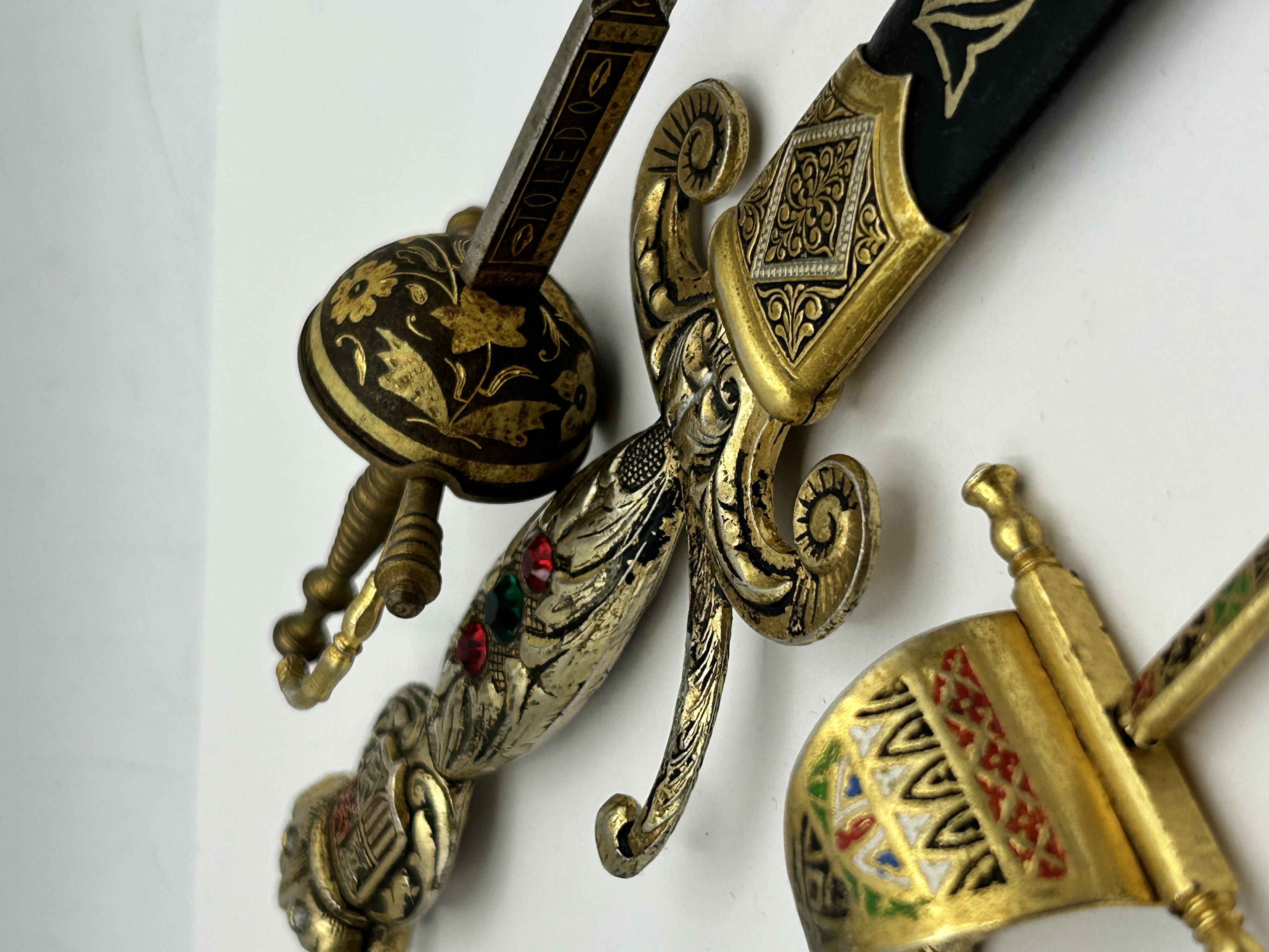 A collection of miniature swords and daggers produced in the style of traditional Spanish weaponry. One piece features a ricasso marked TOLEDO within a rectangular border. The collection includes a miniature rapier with a cast metal hilt, scrolled quillons, and a grip inset with red and green glass cabochons, accompanied by a black and gold-toned scabbard. Also included is a cup-hilt rapier with damascene style floral decoration in black and gold, a sail-hilt dagger with multi-coloured enamelled heraldic patterns, and a silver-toned dagger featuring a blue and white enamelled crest depicting a fortification. These items are constructed from cast base metals with various gilt, silvered, and enamelled finishes.