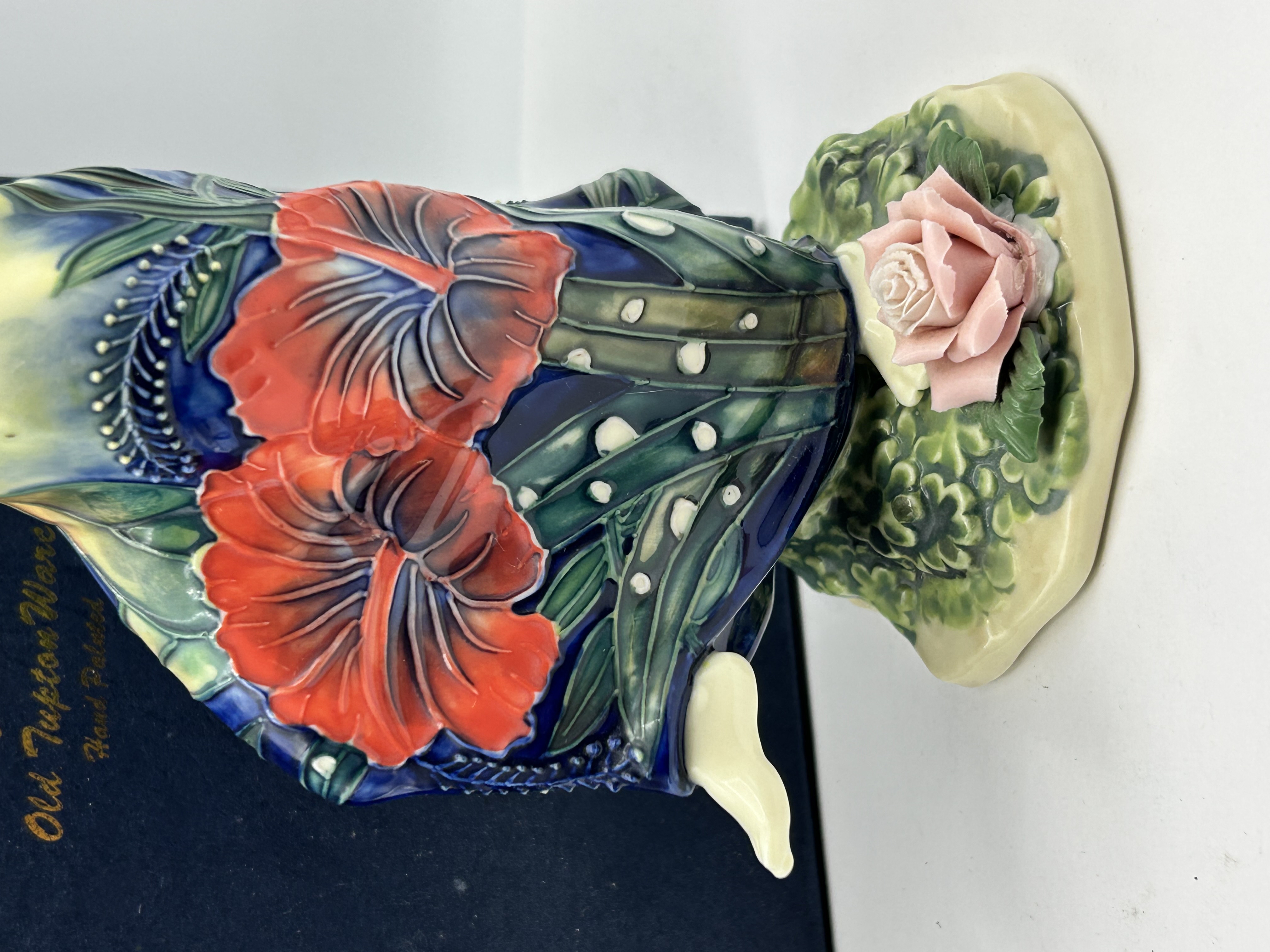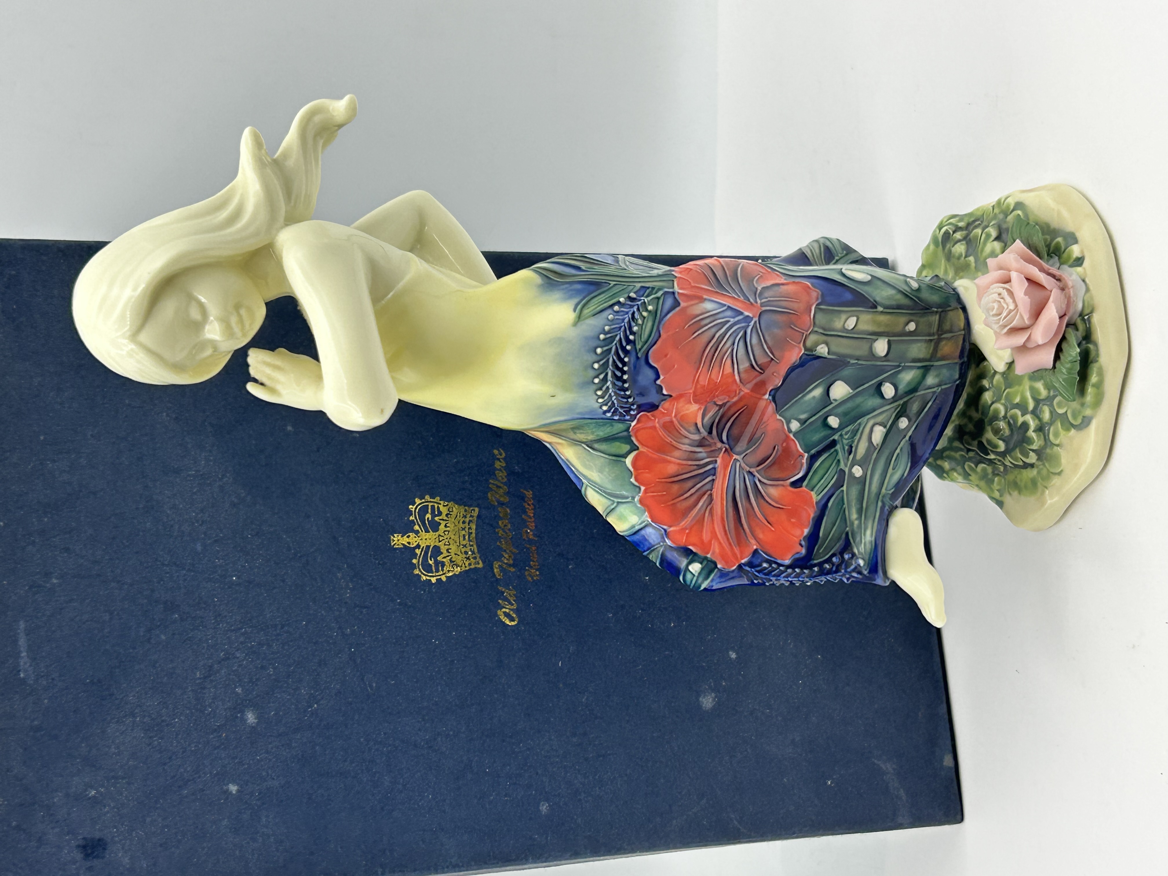 An Old Tupton Ware glazed ceramic figurine depicting a reclining female figure with long flowing hair. The figure is decorated with hand-painted polychrome enamels and tube-lined detailing. The lower portion of the figure and the base feature large red hibiscus-style flowers amongst green foliage set against a cobalt blue ground. A single pink ceramic rose is applied to the base near the figure’s feet. The item is accompanied by its original blue presentation box featuring a gold crown emblem and the text Old Tupton Ware Hand Painted.