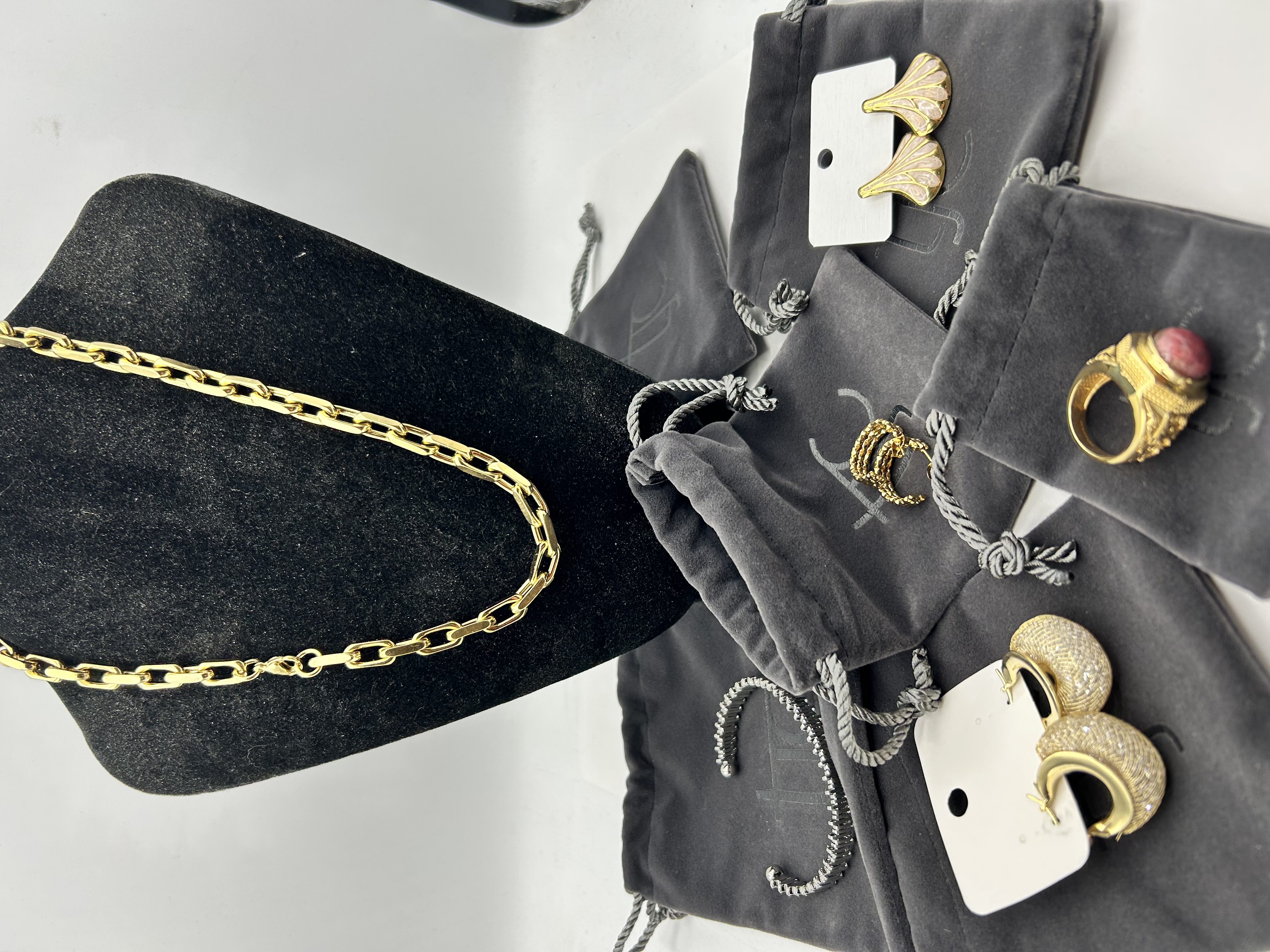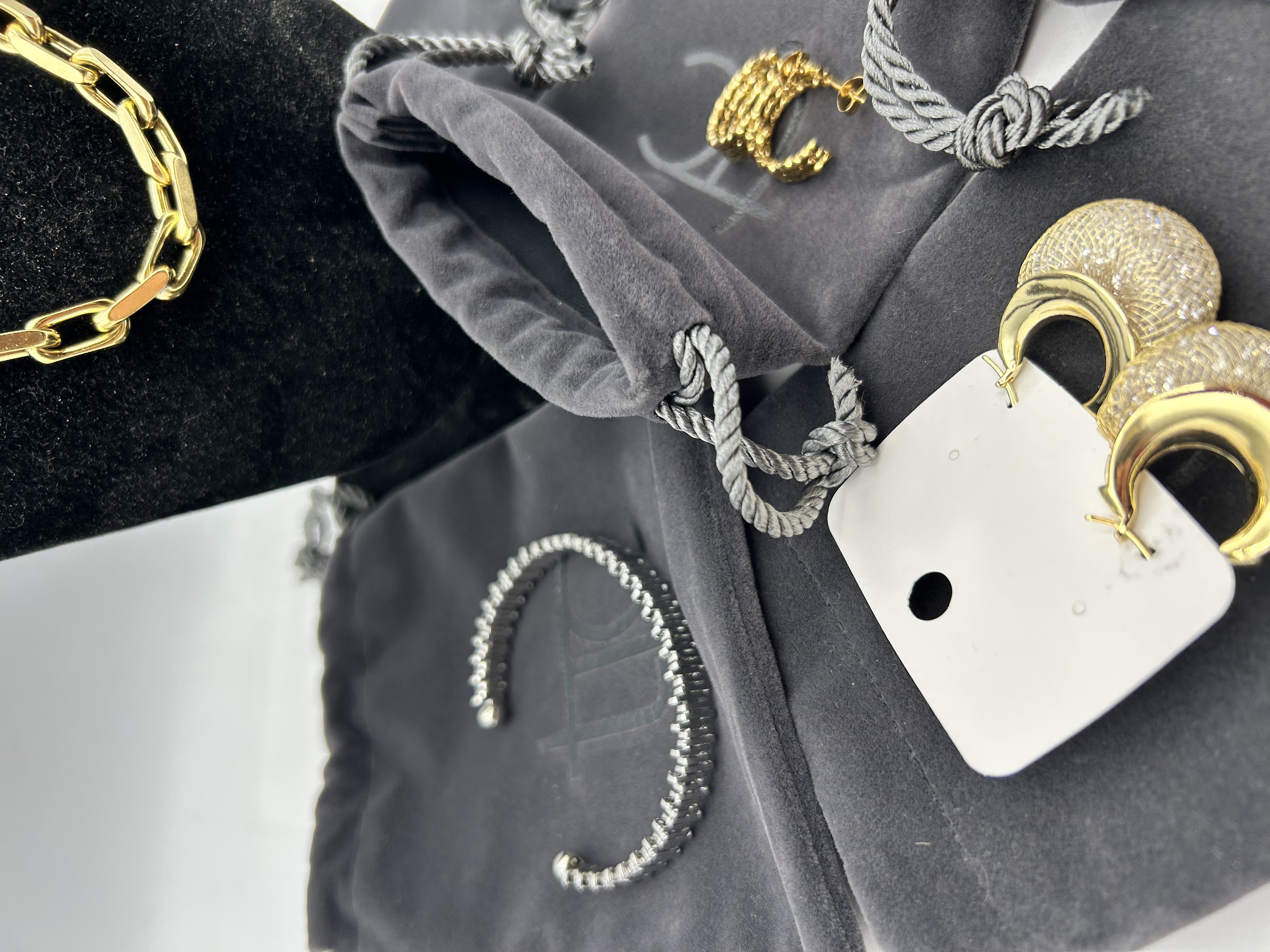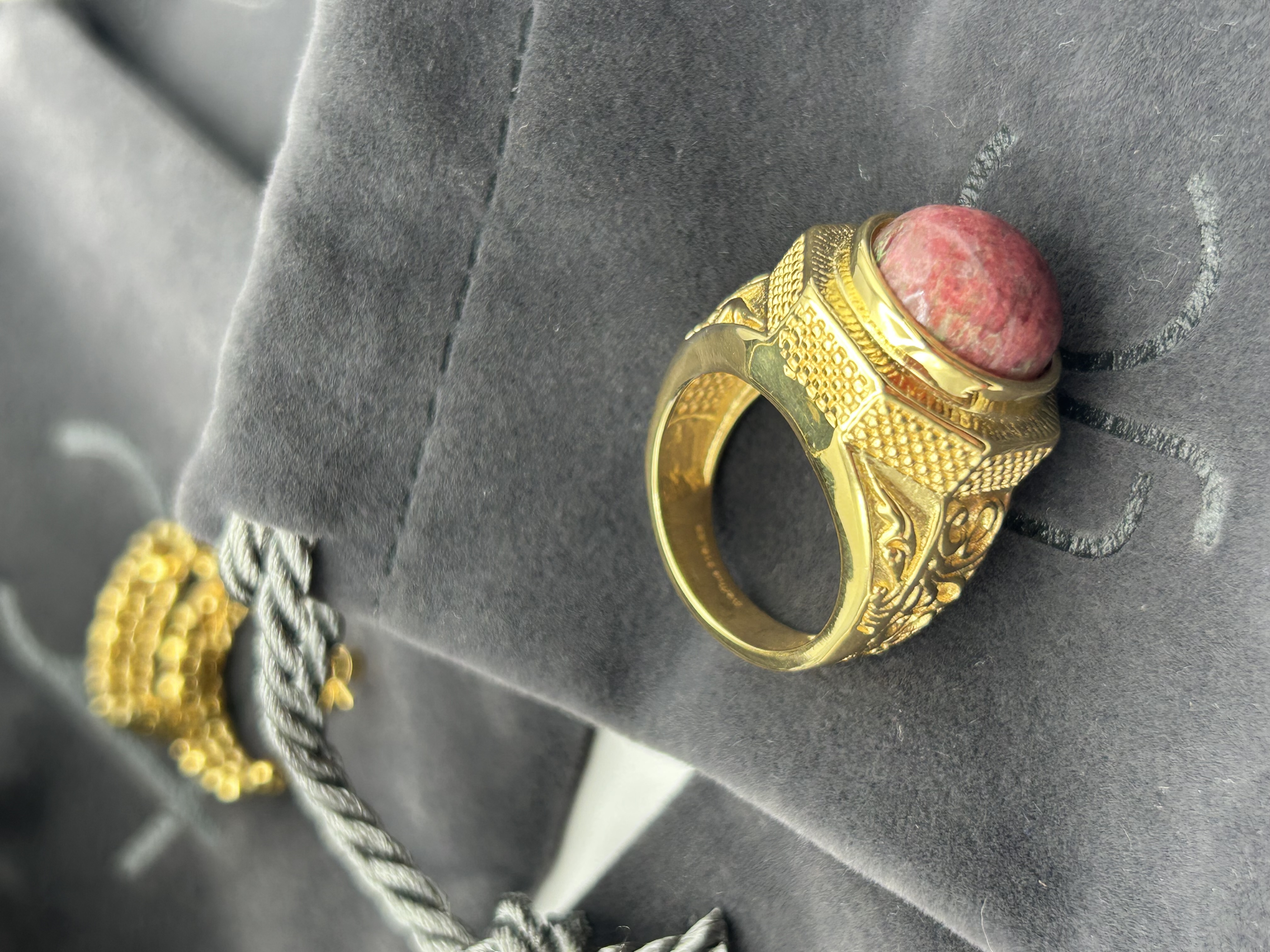 A collection of fashion jewellery comprising multiple pieces in yellow and silver-toned metals. The collection features a yellow metal necklace with elongated rectangular links in a mariner or Hermes link design. Included is a yellow metal ring featuring a large, bezel-set pink mottled cabochon stone, which appears to be rhodonite or a similar mineral, set into an intricately textured and relief-decorated shank. The inner shank of the ring is marked Avenue 316L, indicating construction from stainless steel. The assortment also contains a pair of yellow metal fan-shaped earrings with pearlescent pink and white inlays; a pair of yellow metal textured hoop earrings; and a pair of yellow metal crescent-shaped earrings pavé-set with colourless stones. Additionally, there is a silver-toned textured open cuff bracelet. The items are accompanied by several grey velvet drawstring pouches featuring a stylized logo.