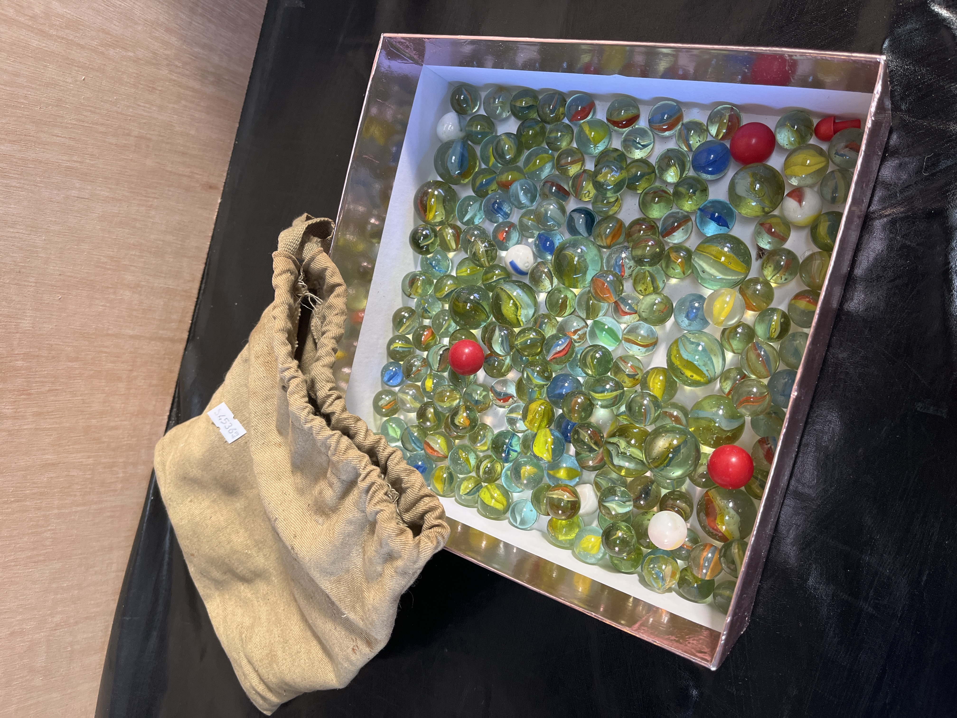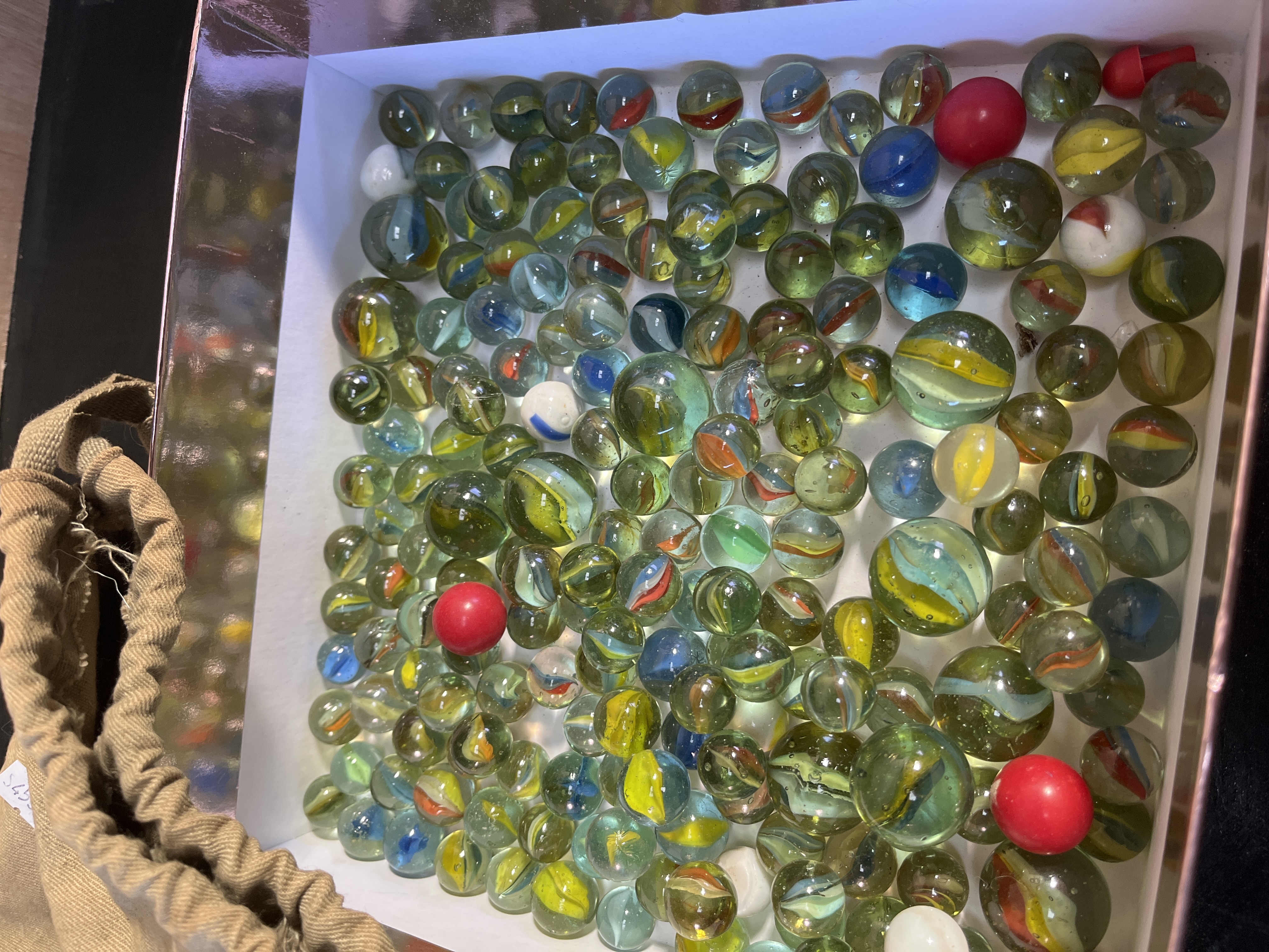 An assortment of glass marbles featuring a variety of designs and sizes. The collection primarily consists of clear and tinted glass examples with internal cat’s eye swirls in various colours including yellow, blue, red, and green. The group includes several larger shooter marbles alongside standard-sized examples and a small number of solid-coloured opaque marbles in red and white. The marbles are accompanied by a tan fabric drawstring pouch which features a small white adhesive label with the handwritten inventory number 545367. The entire collection is presented in a shallow square display box with a metallic-finished rim. No manufacturer marks or country of origin labels are present on the items.