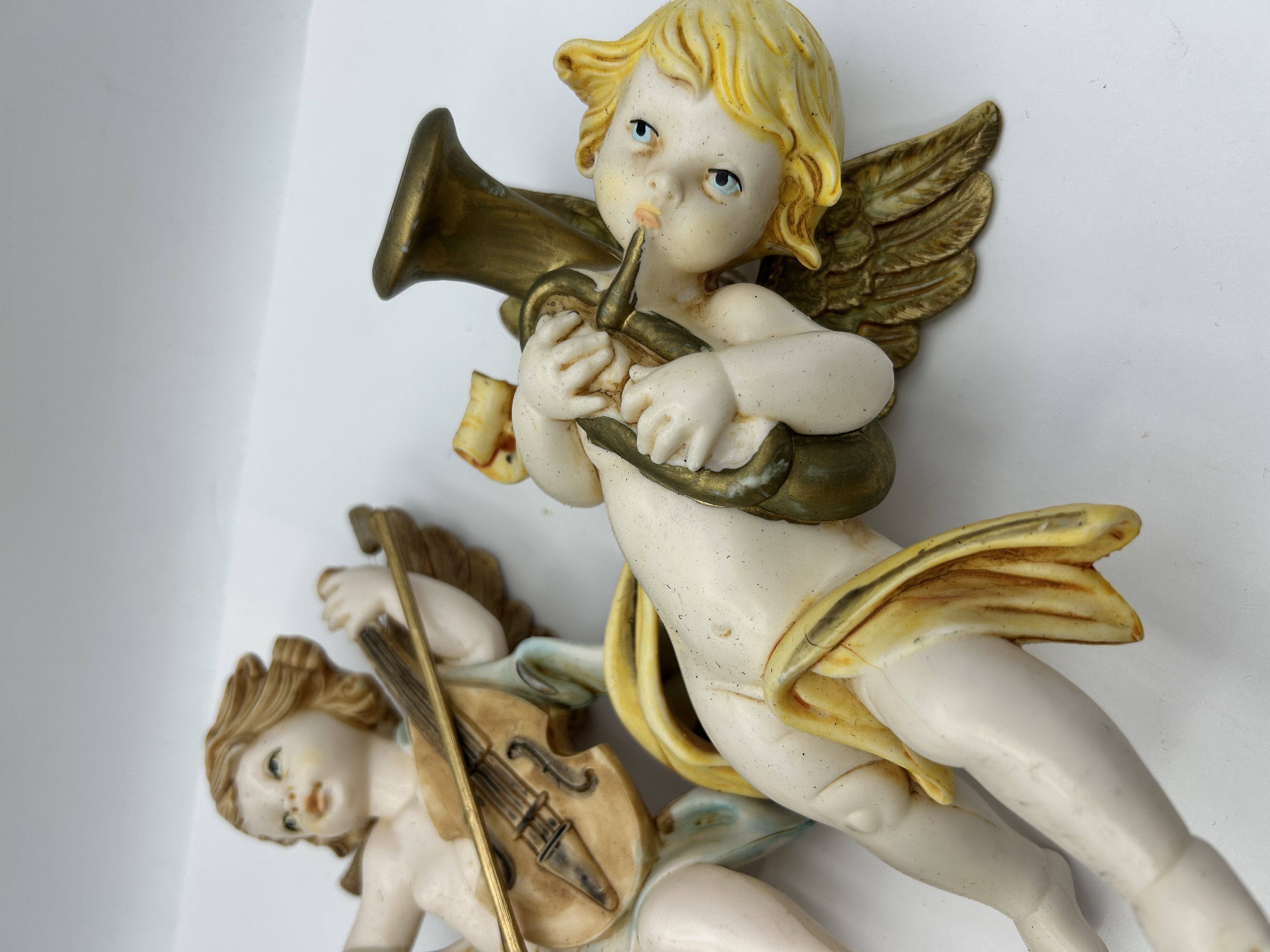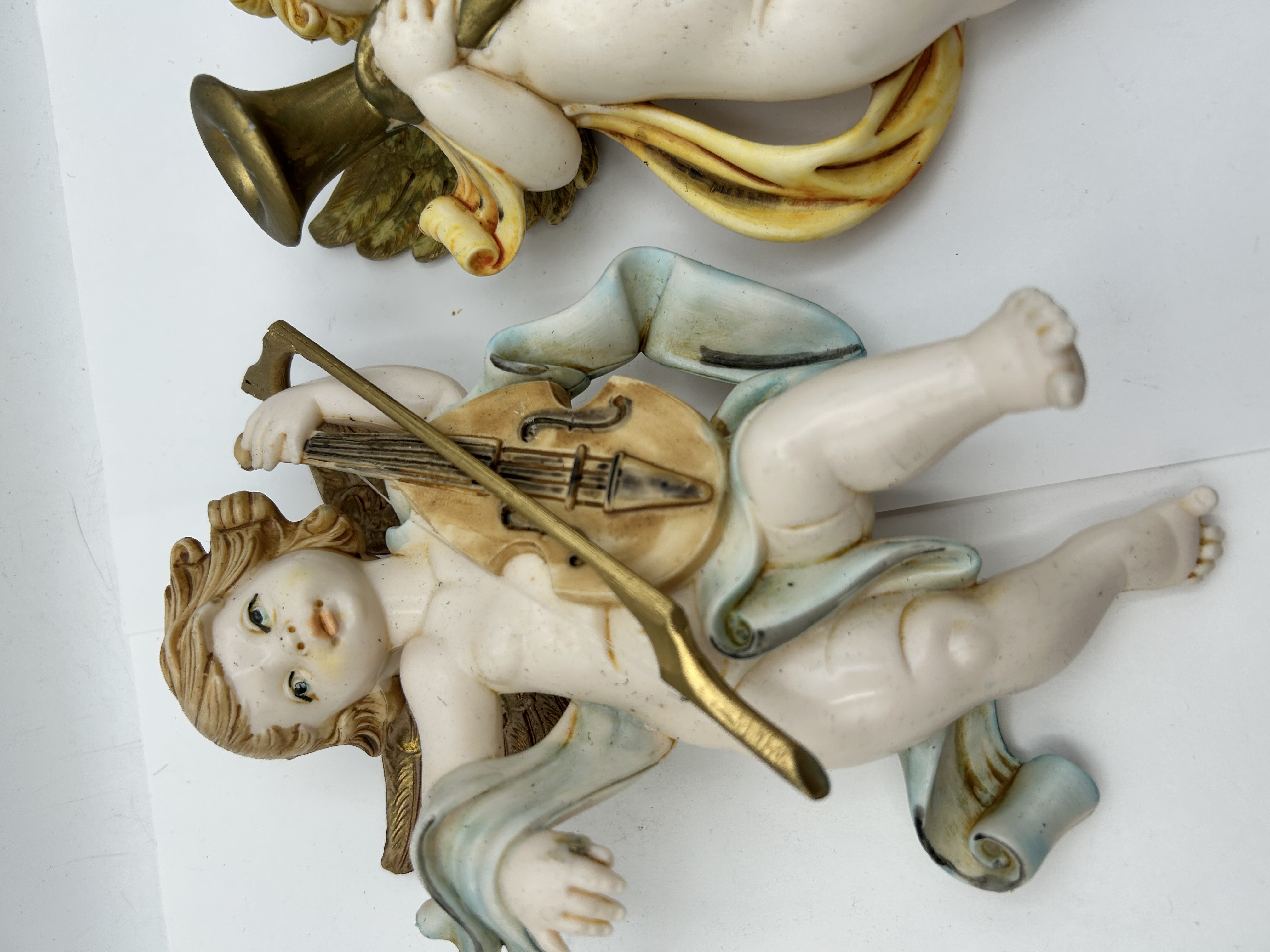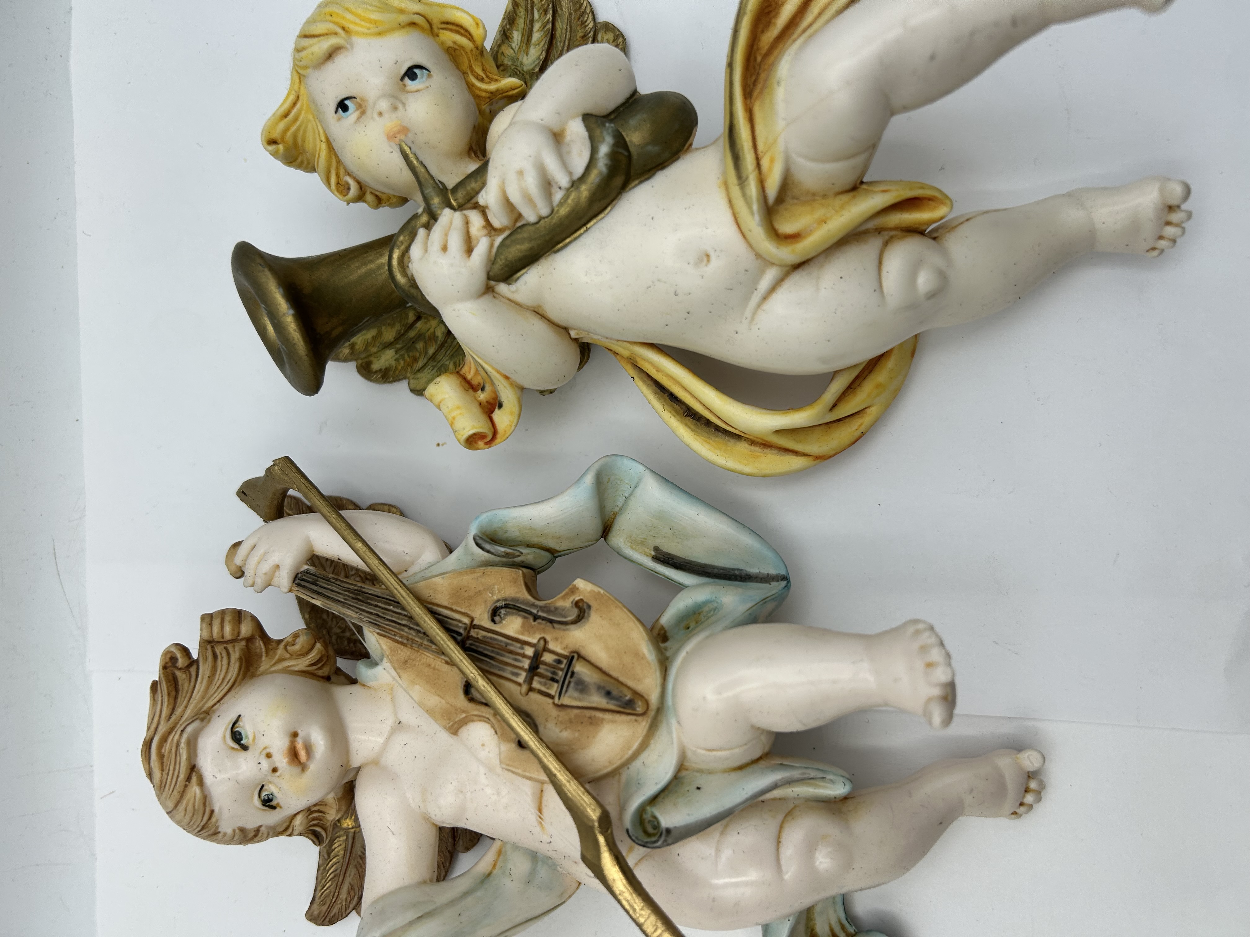 A pair of vintage wall-hanging cherub figures, manufactured in Italy. The figures are depicted in flight, with one playing a harp and the other a violin. They are constructed from a painted composite material, featuring hand-painted details including pastel pink and blue drapery. The wings are finished with a gold-coloured gilding. The reverse of each plaque is hollowed with a flat profile for wall mounting and includes a wire hanging loop. Each figure bears an embossed mark reading ITALY on the reverse.