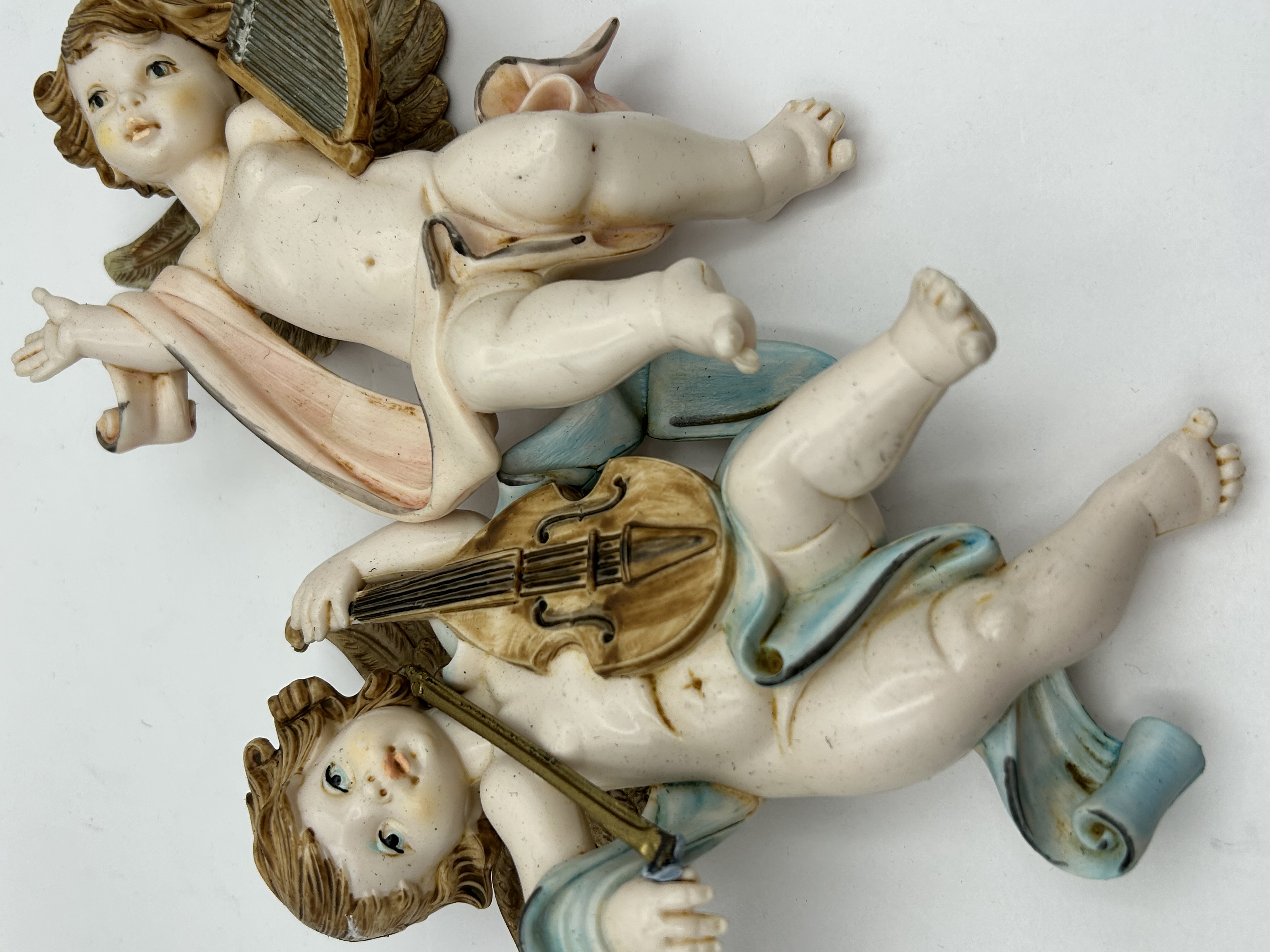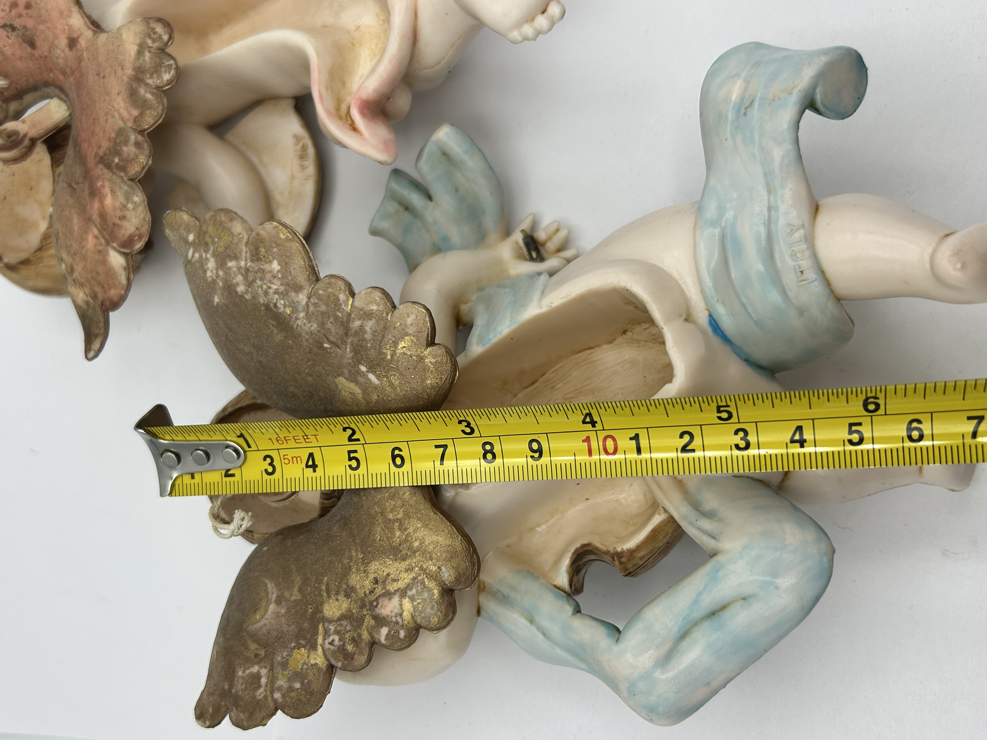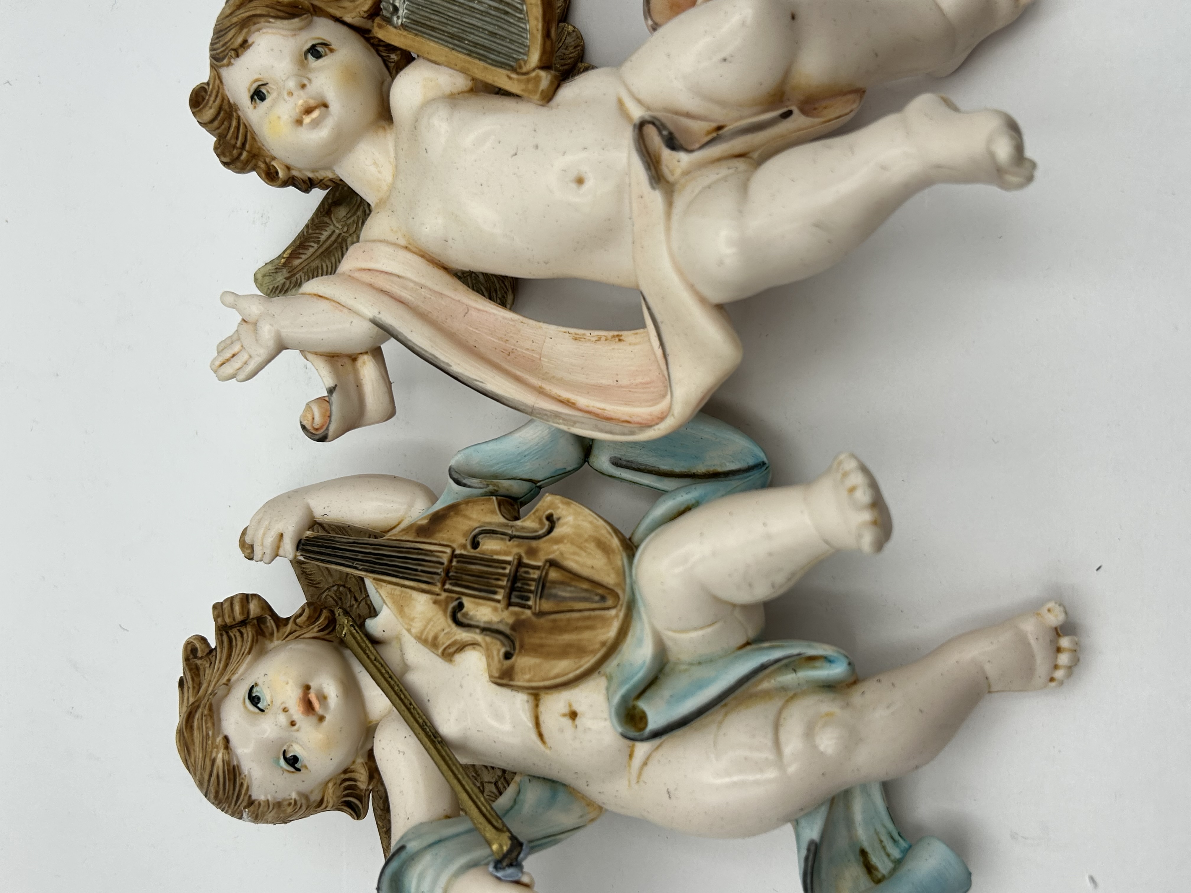A pair of vintage wall plaques depicting winged cherubs in flight, one playing a harp and the other a violin. The figures are constructed from a cast composite material with a hand-painted finish. The cherubs feature draped sashes in pale pink and blue with gilded highlights applied to the wings. The reverse of each item is hollow-cast and bears the moulded mark ITALY. Integrated wire loops are present for wall mounting.