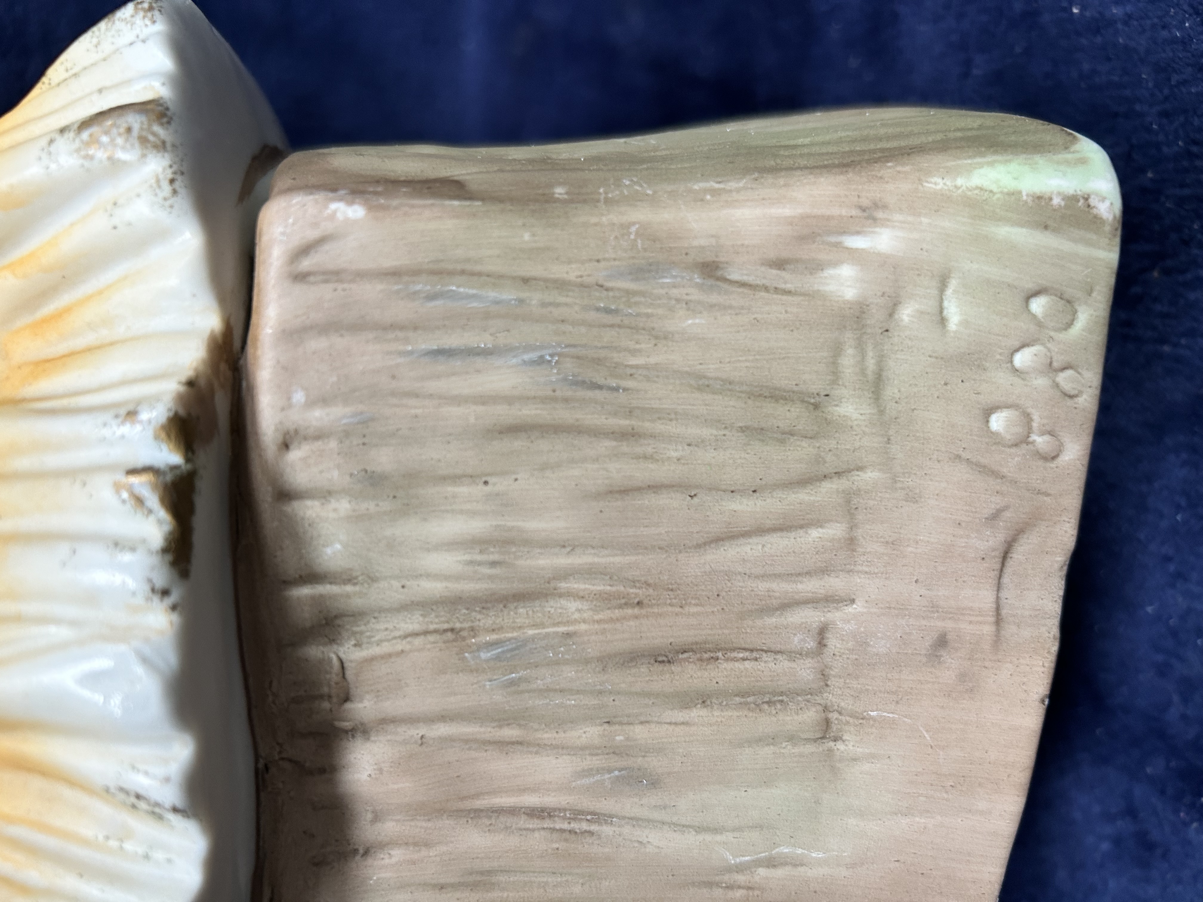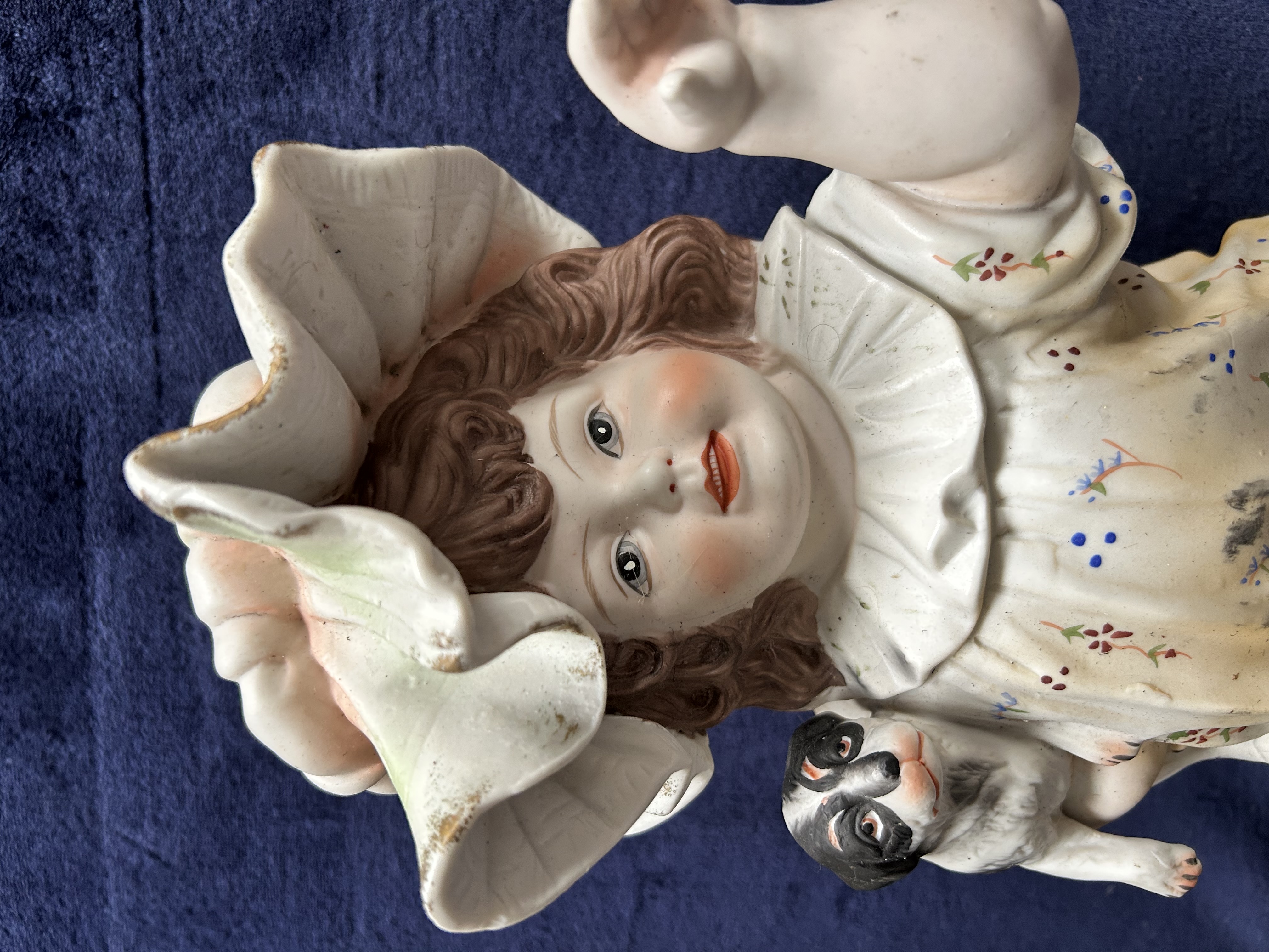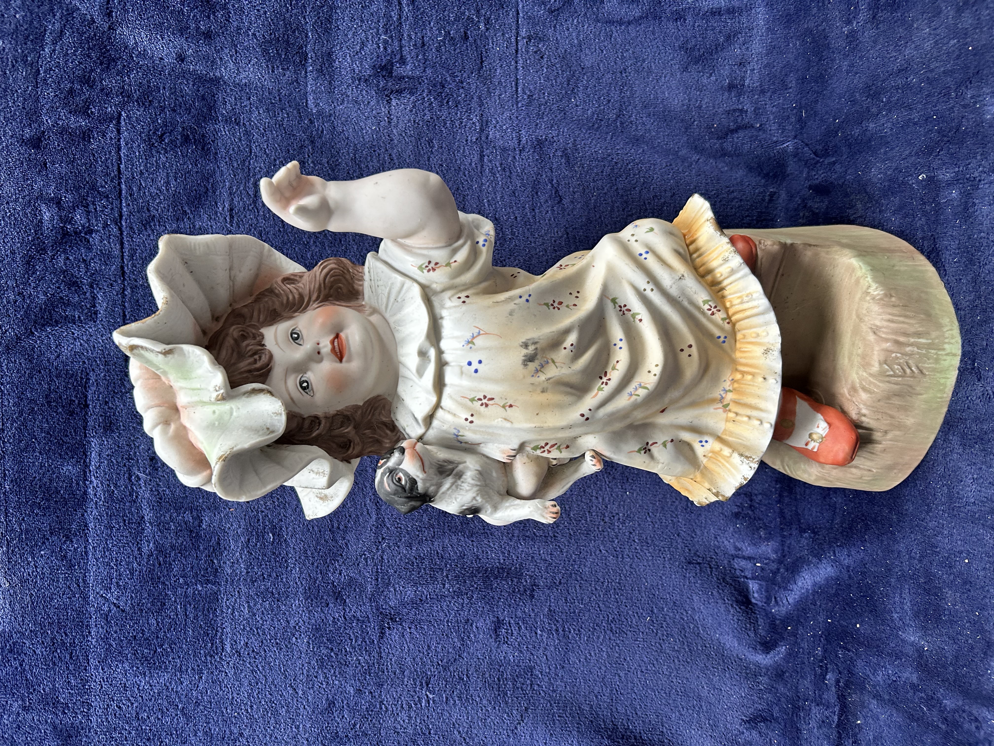 A large late 19th or early 20th-century bisque porcelain figurine, modelled as a young girl seated with a small black and white dog. The girl is depicted with brown curly hair and painted facial features, wearing a voluminous ruffled bonnet and a white gown decorated with floral sprigs and a yellow frilled hem. She wears red shoes and sits upon a textured base tinted with green. To the reverse of the base are the impressed numbers 880 and an indistinct impressed symbol above. The item is in the style of German manufacturers such as Gebrüder Heubach or Conta and Boehme.
