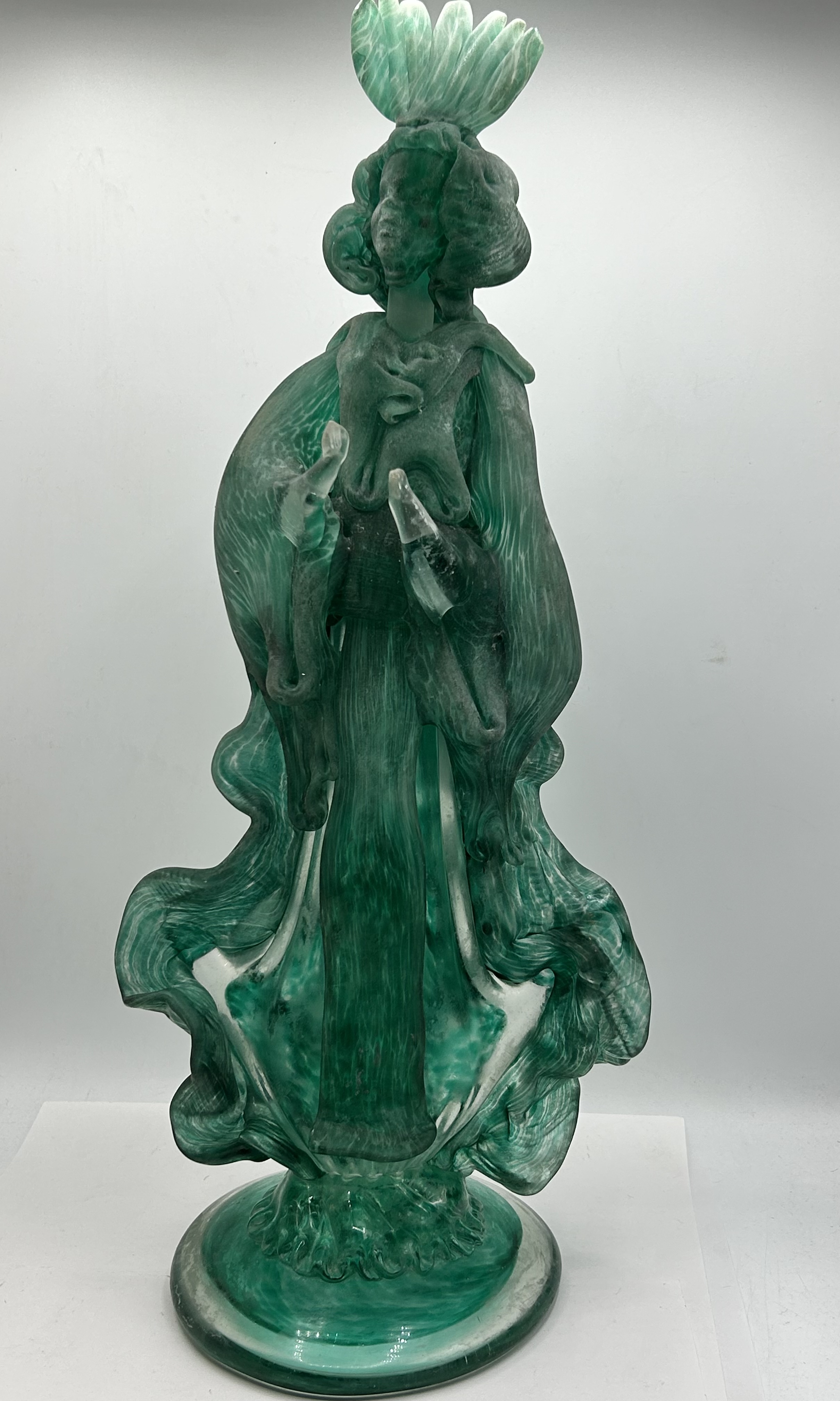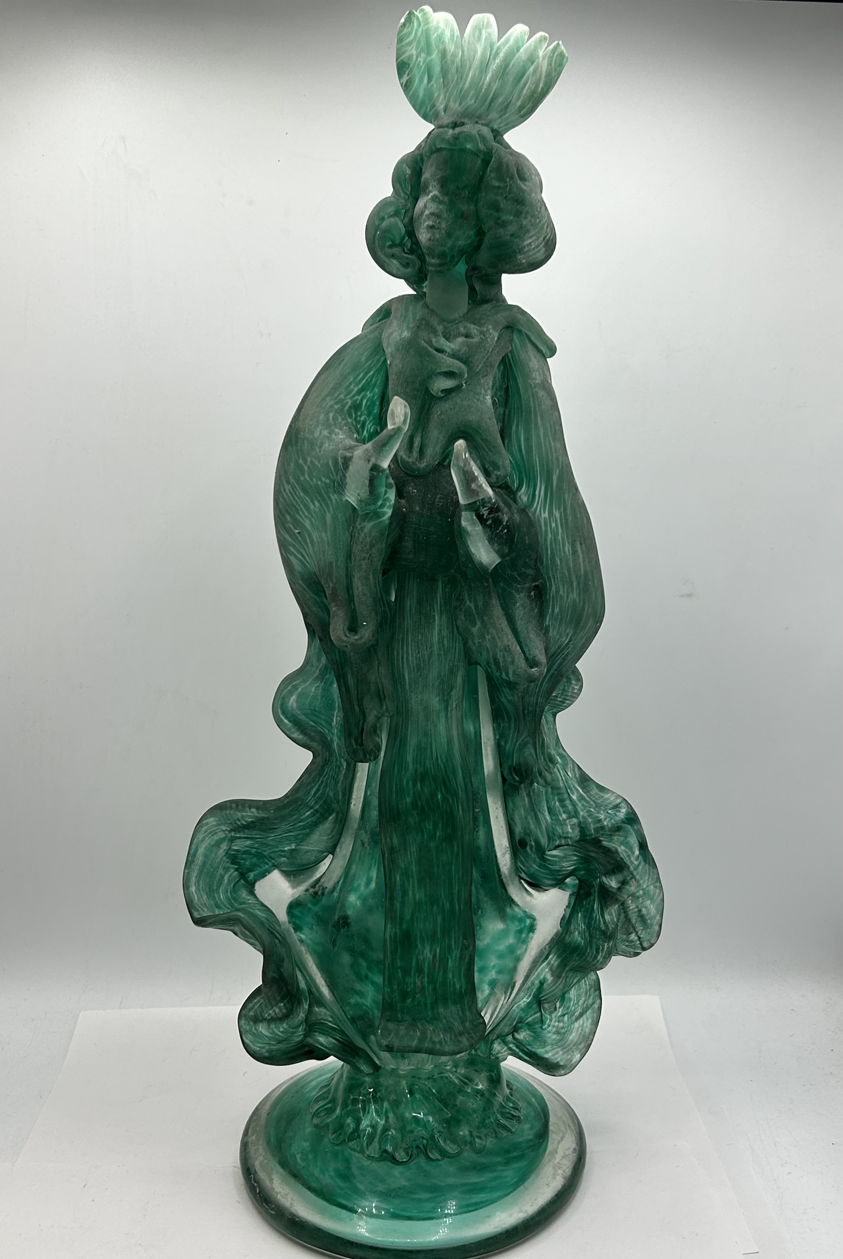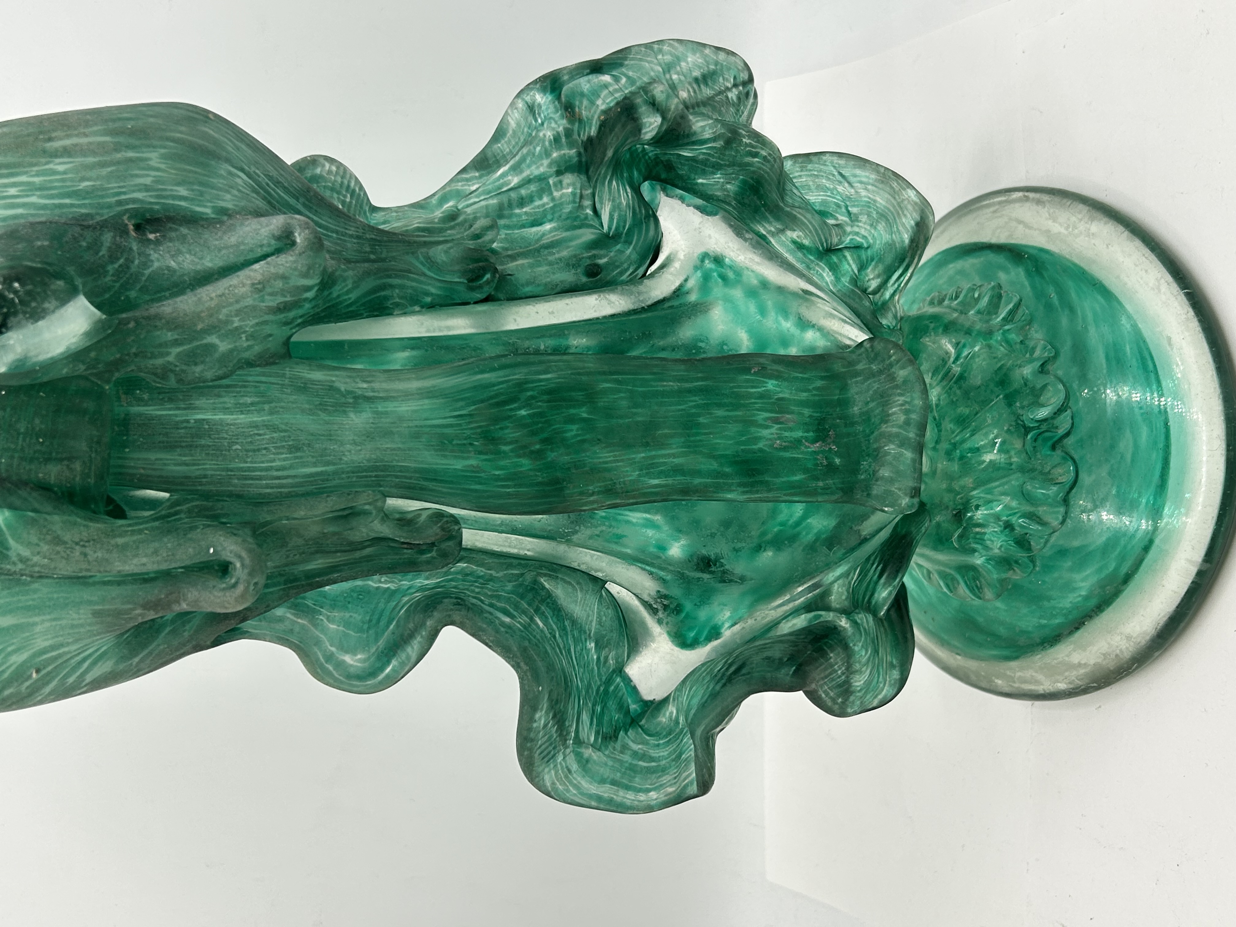 A large Art Deco style figurine crafted from cast malachite glass, featuring a variegated green and white mottled appearance designed to simulate semi-precious stone. The figure is depicted in a dynamic pose with voluminous, billowing drapery and an elaborate headdress, suggestive of early 20th-century orientalist dance. The glass has a satin frosted finish throughout. This item is attributed to the Ingrid line produced by Curt Schlevogt ?and designed by Heinrich Hoffmann? in Czechoslovakia, based on the material and stylistic characteristics. No maker marks or factory signatures are visible on the base or body.