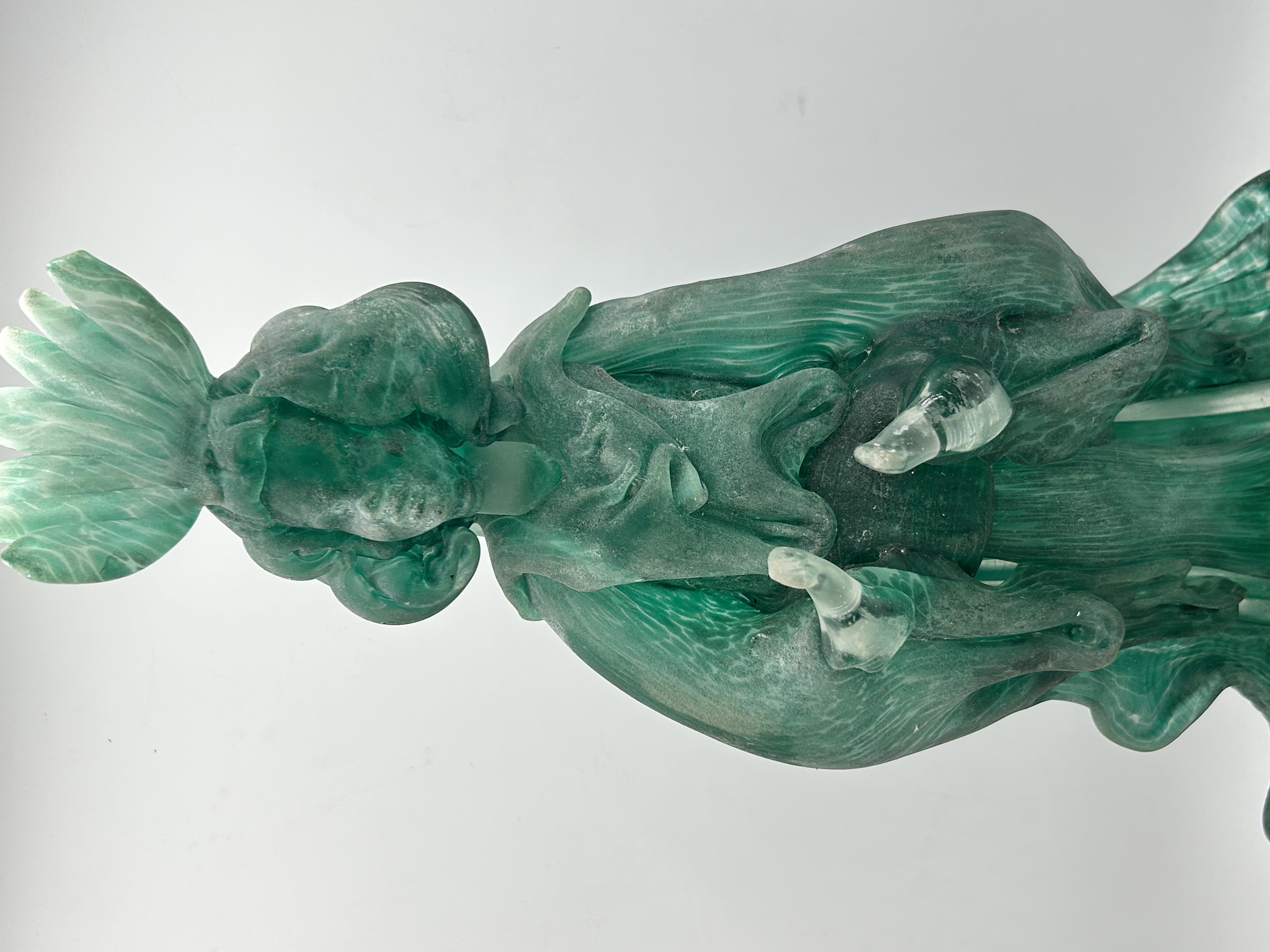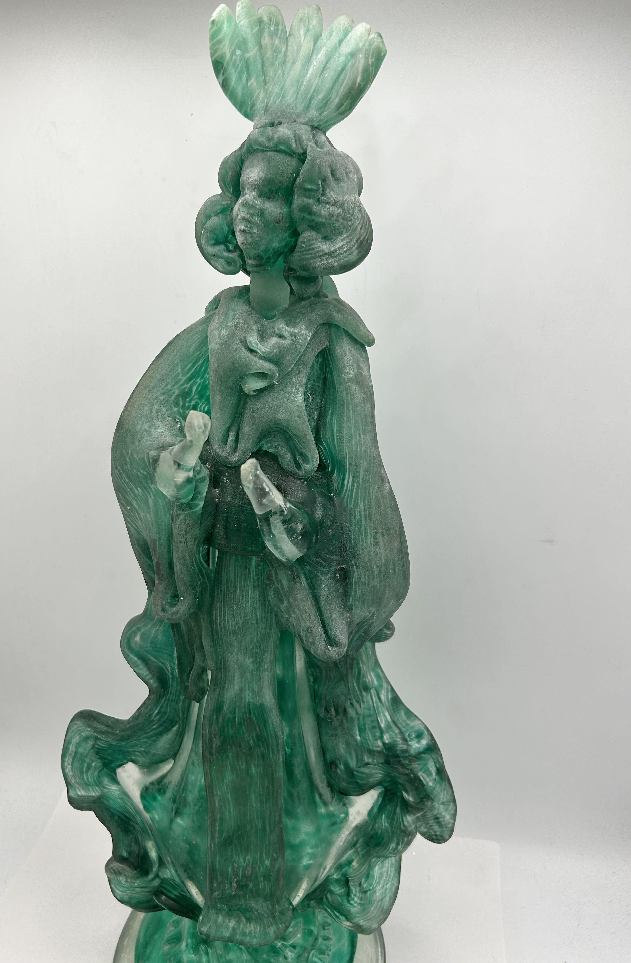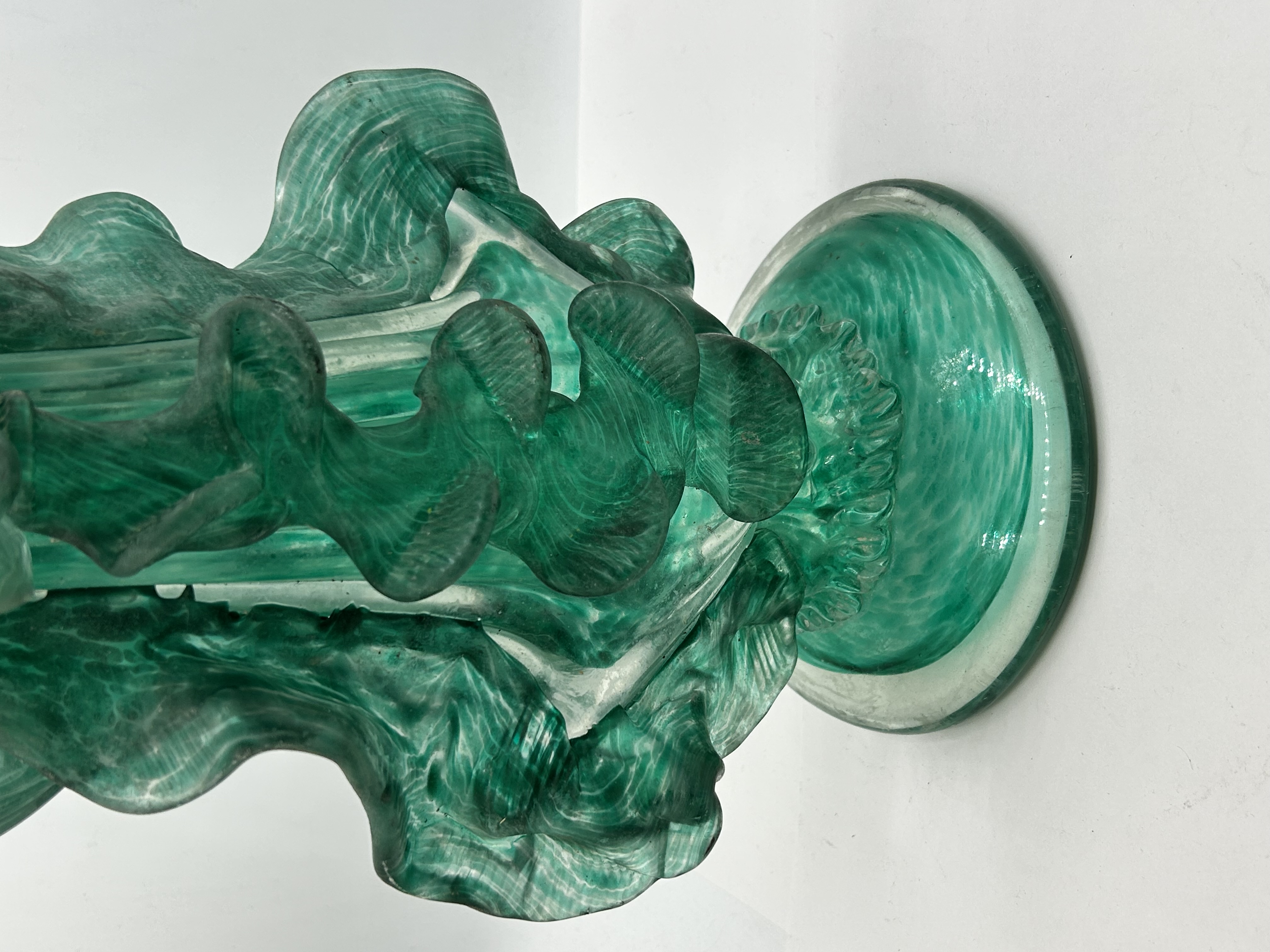 A large Art Deco style figurine crafted from cast malachite glass, featuring a variegated green and white mottled appearance designed to simulate semi-precious stone. The figure is depicted in a dynamic pose with voluminous, billowing drapery and an elaborate headdress, suggestive of early 20th-century orientalist dance. The glass has a satin frosted finish throughout. This item is attributed to the Ingrid line produced by Curt Schlevogt ?and designed by Heinrich Hoffmann? in Czechoslovakia, based on the material and stylistic characteristics. No maker marks or factory signatures are visible on the base or body.