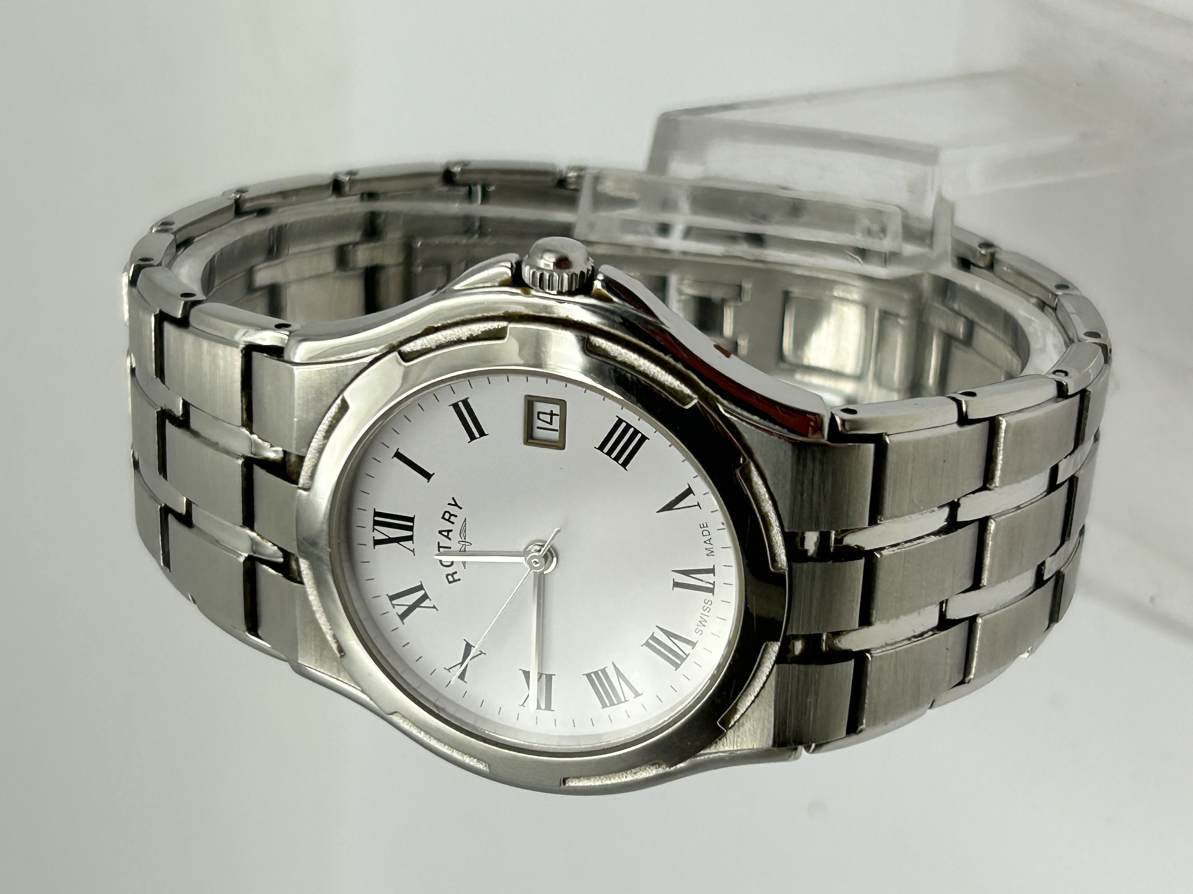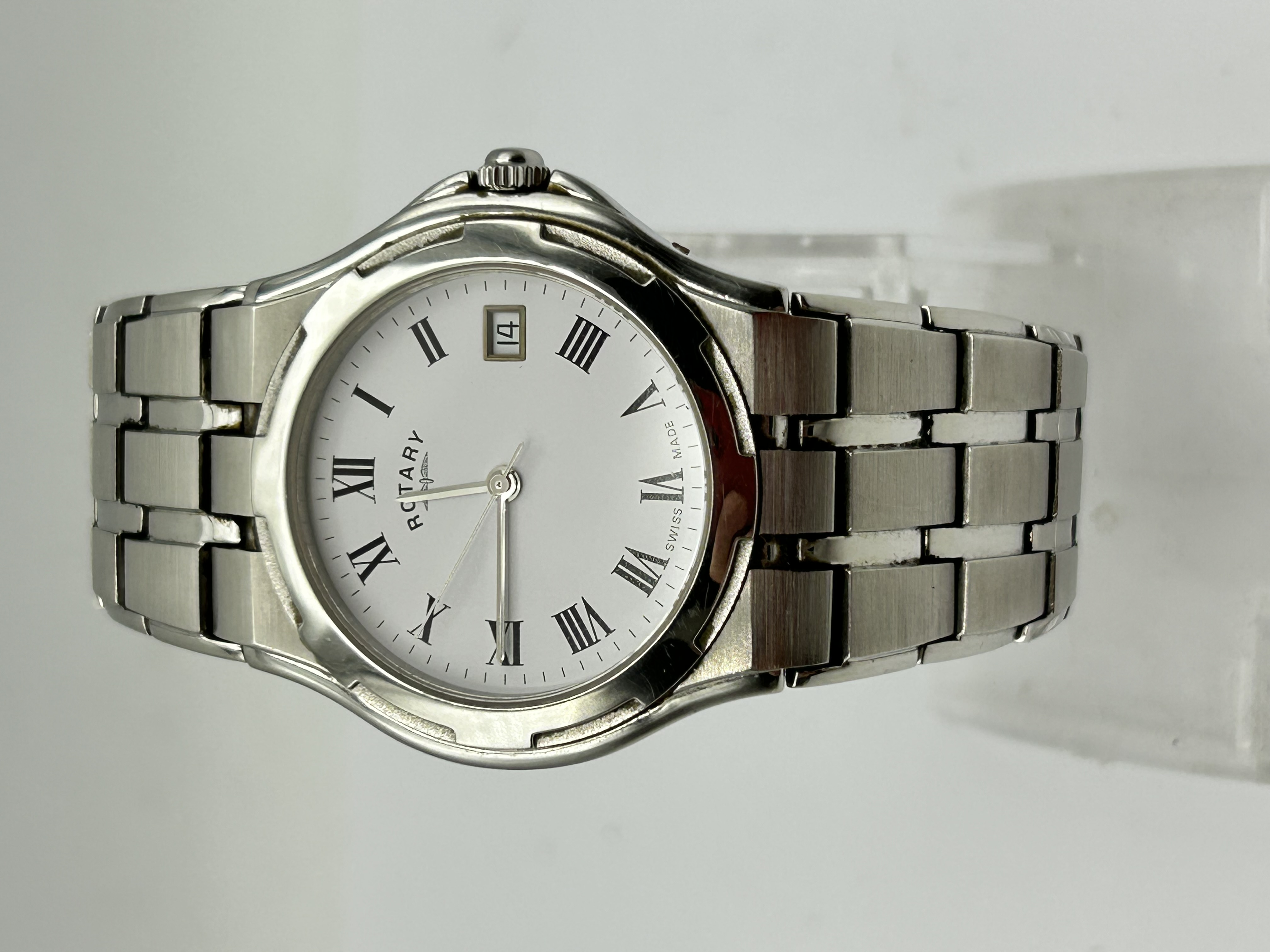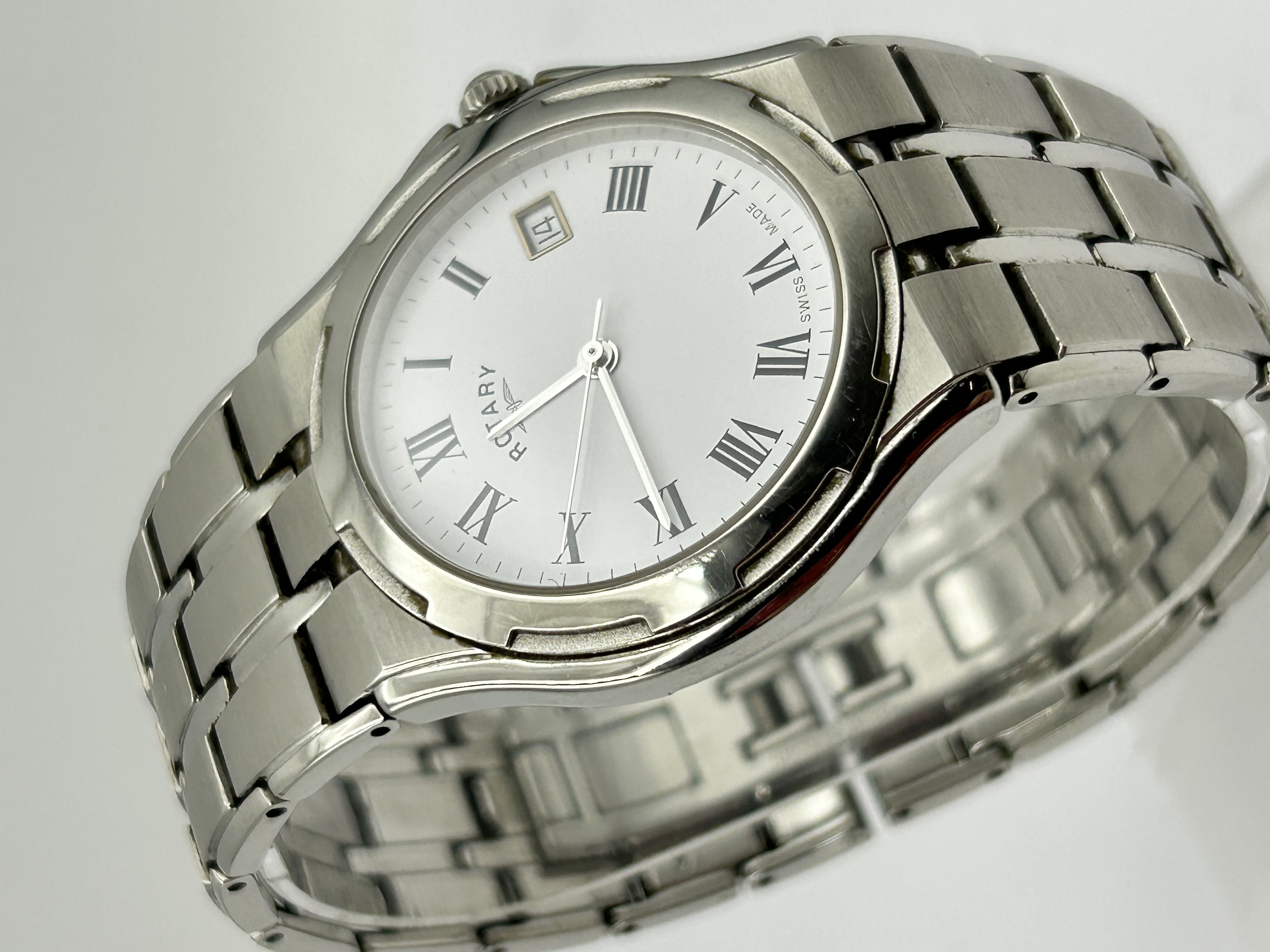 A gentleman’s wristwatch by Rotary featuring a silvered white dial with black Roman numeral hour markers and a date aperture at the 3 o’clock position. The dial is signed with the Rotary name and winged wheel logo, and marked Swiss Made at the base. The watch is housed in a stainless steel case with a matching integrated multi-link bracelet featuring both brushed and polished finishes. The movement is likely quartz.