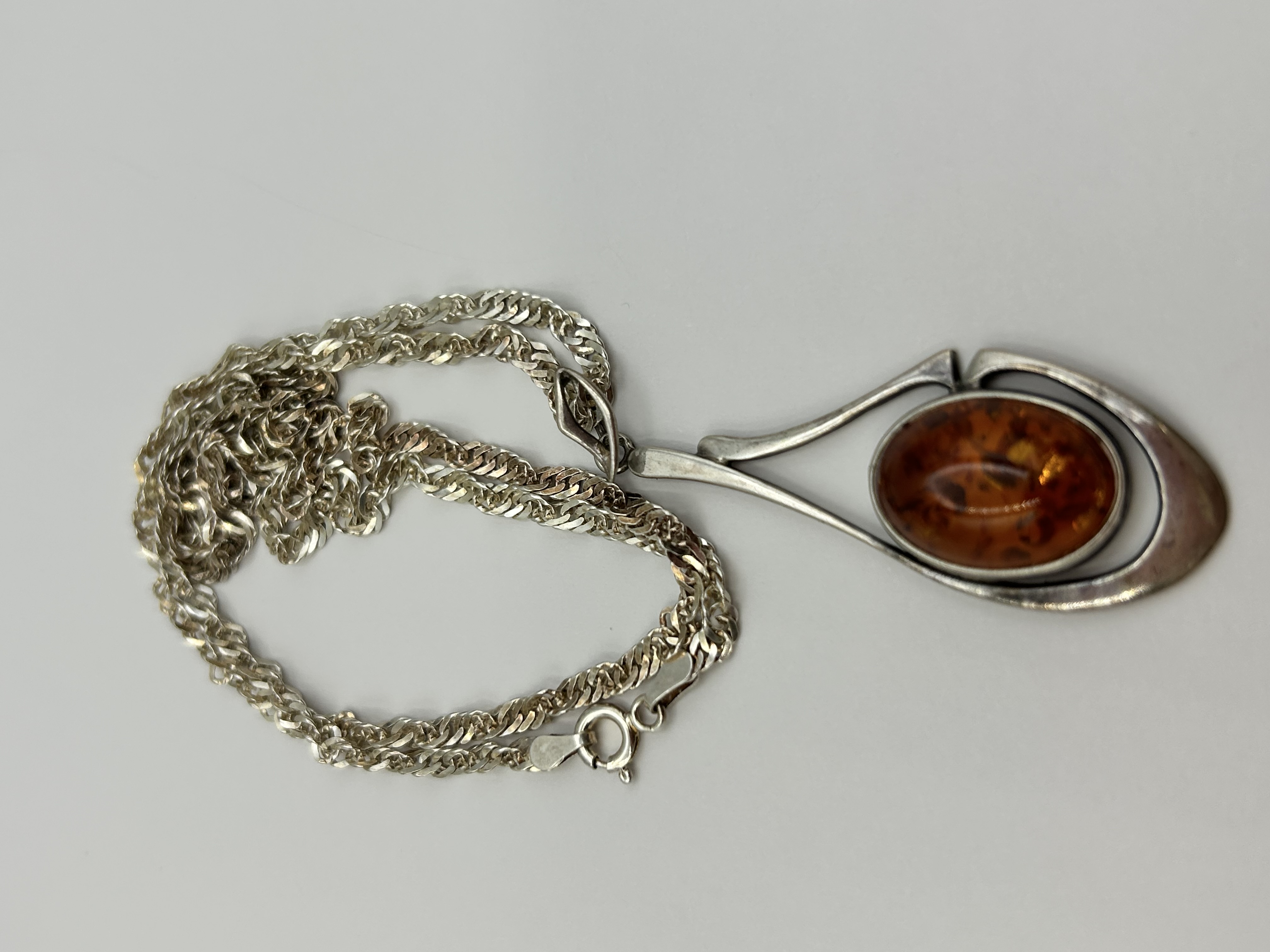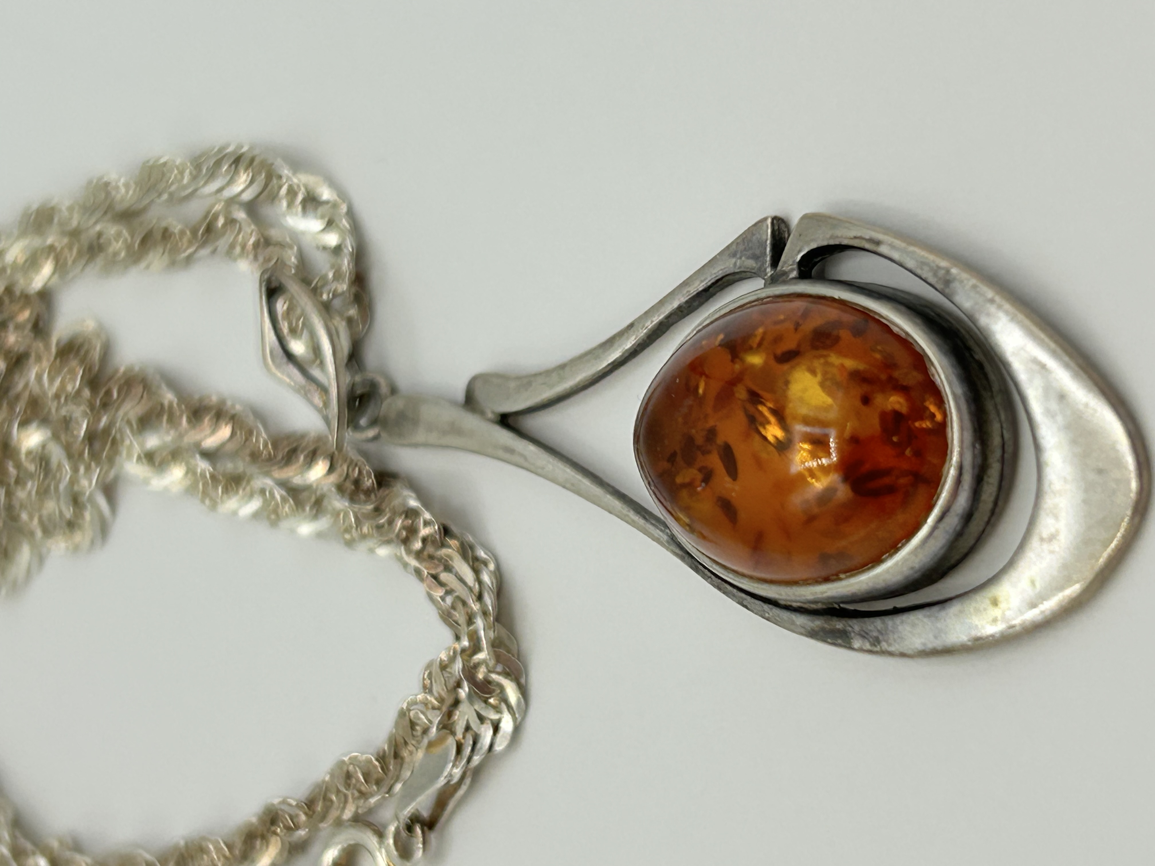 A modernist pendant necklace featuring a large oval amber cabochon. The pendant is constructed with an openwork sterling silver frame of fluid, asymmetrical design, tapering towards the bail. The central amber stone is of a honey-orange hue with visible internal spangles and is secured in a rub-over bezel setting. The pendant is suspended from a twisted curb-link chain. The chain is fitted with a spring-ring bolt clasp and an oval tag stamped 925. Additional struck marks are present on the clasp and pendant bail but are illegible. The design is in the style of mid-to-late 20th-century European studio jewellery, resembling designs by Wulflund.