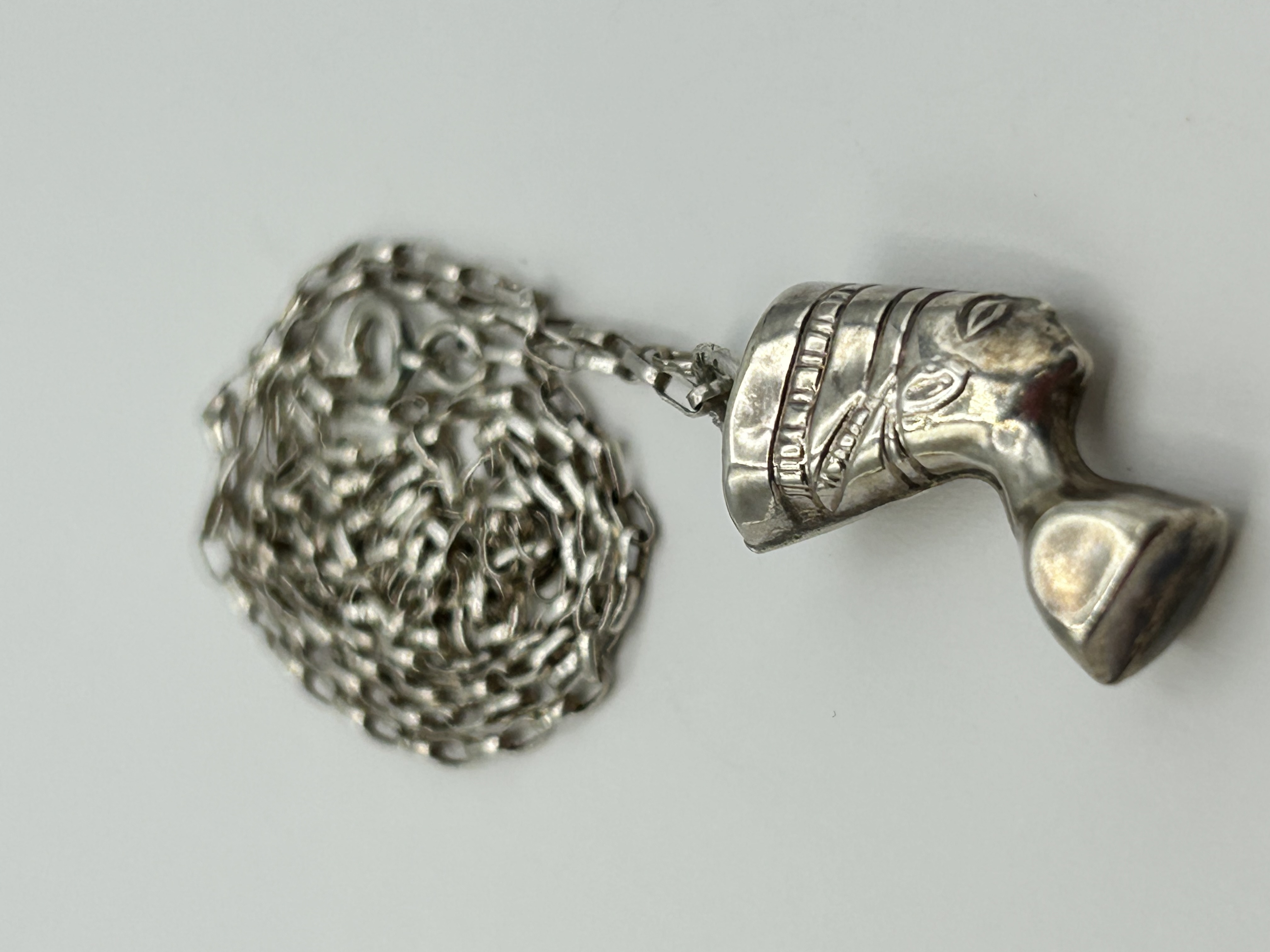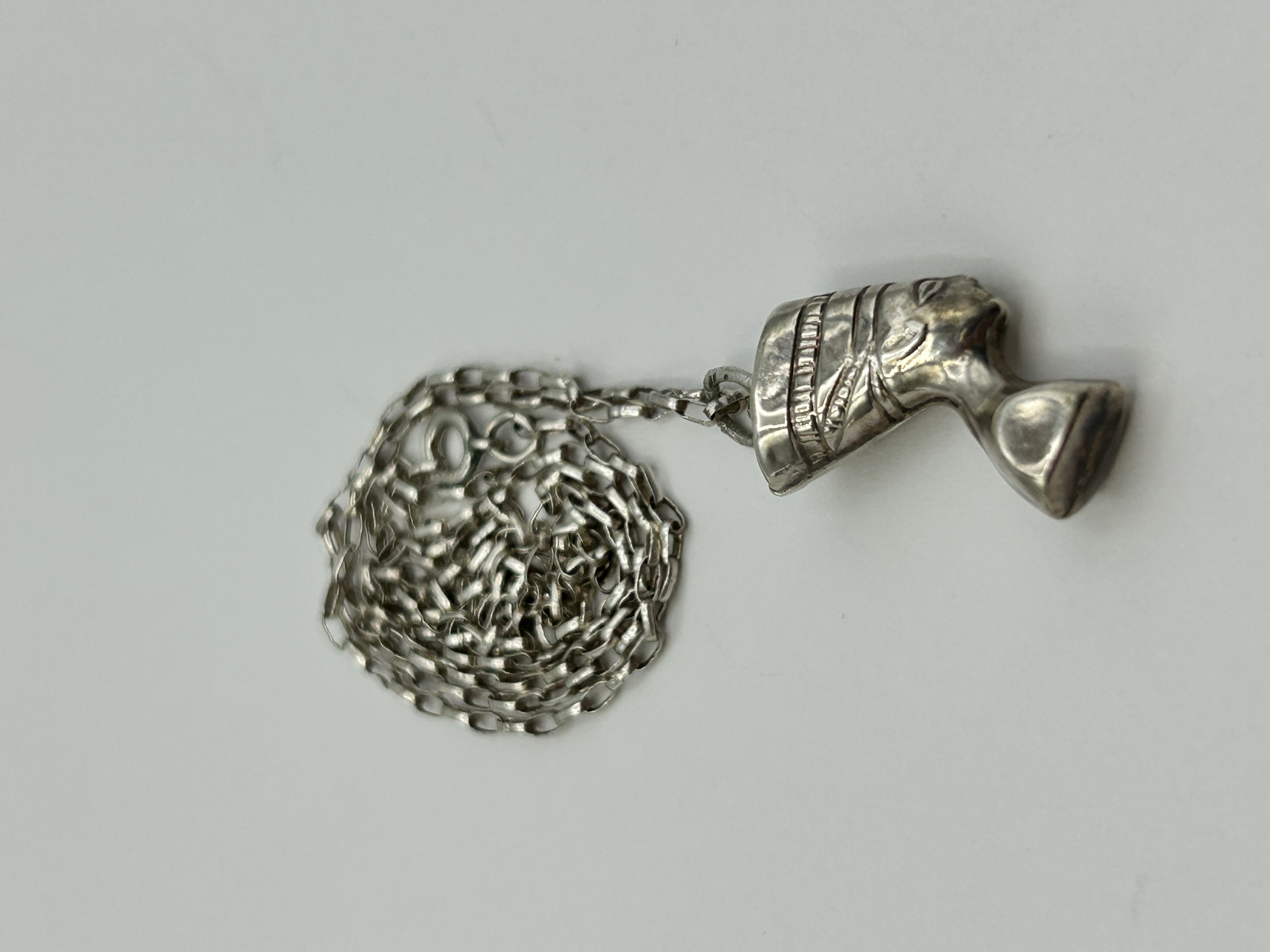 An Egyptian Revival style pendant necklace in silver-coloured metal, dating to the mid-20th century. The pendant is designed as a profile bust of Queen Nefertiti, featuring her iconic tall, flat-topped crown and stylised facial features. The pendant is suspended from a fine trace-link chain. The necklace is secured with a spring ring clasp. Indistinct marks are present on the pendant bale and on a link adjacent to the clasp, though these are not clearly legible.