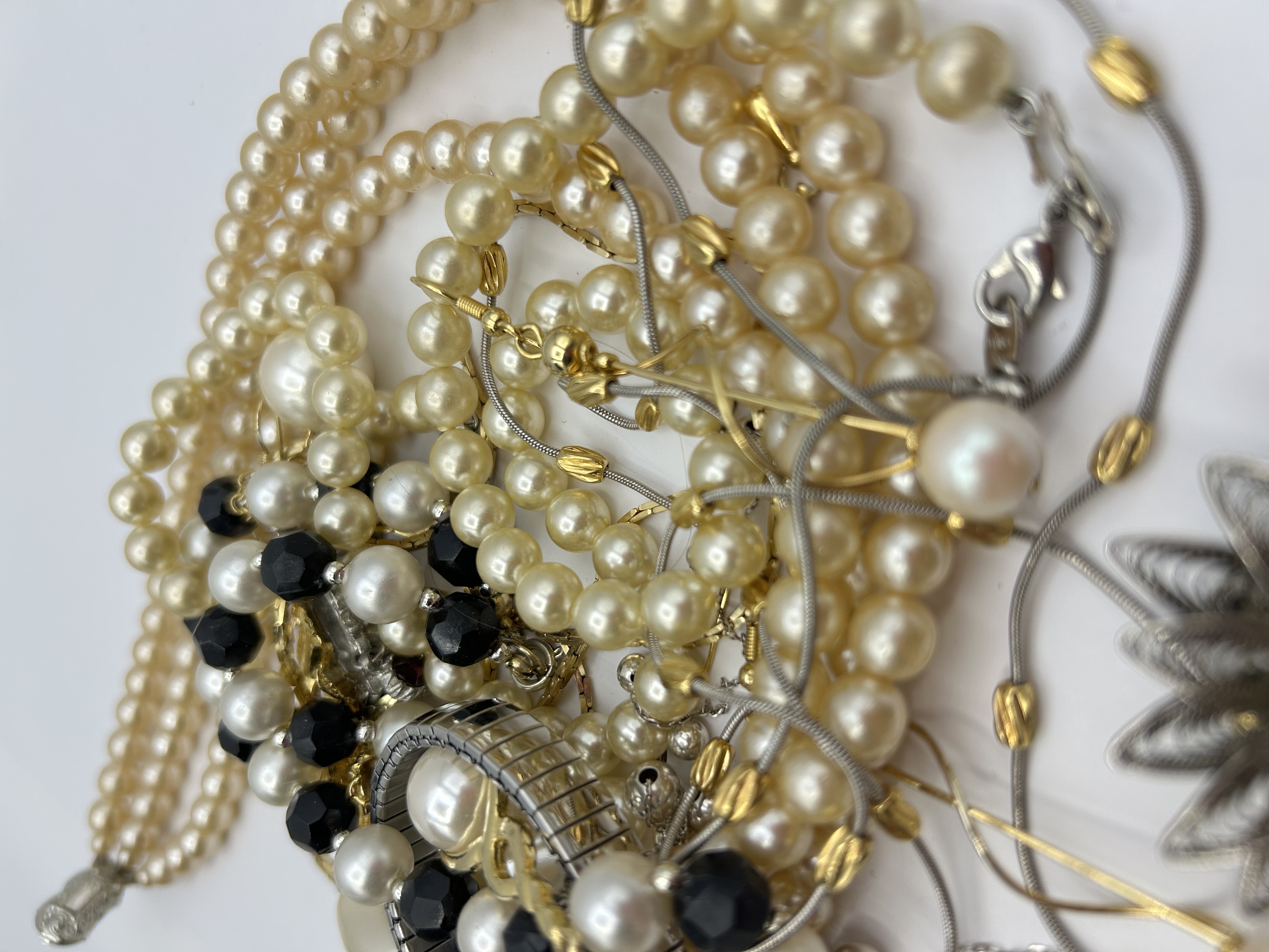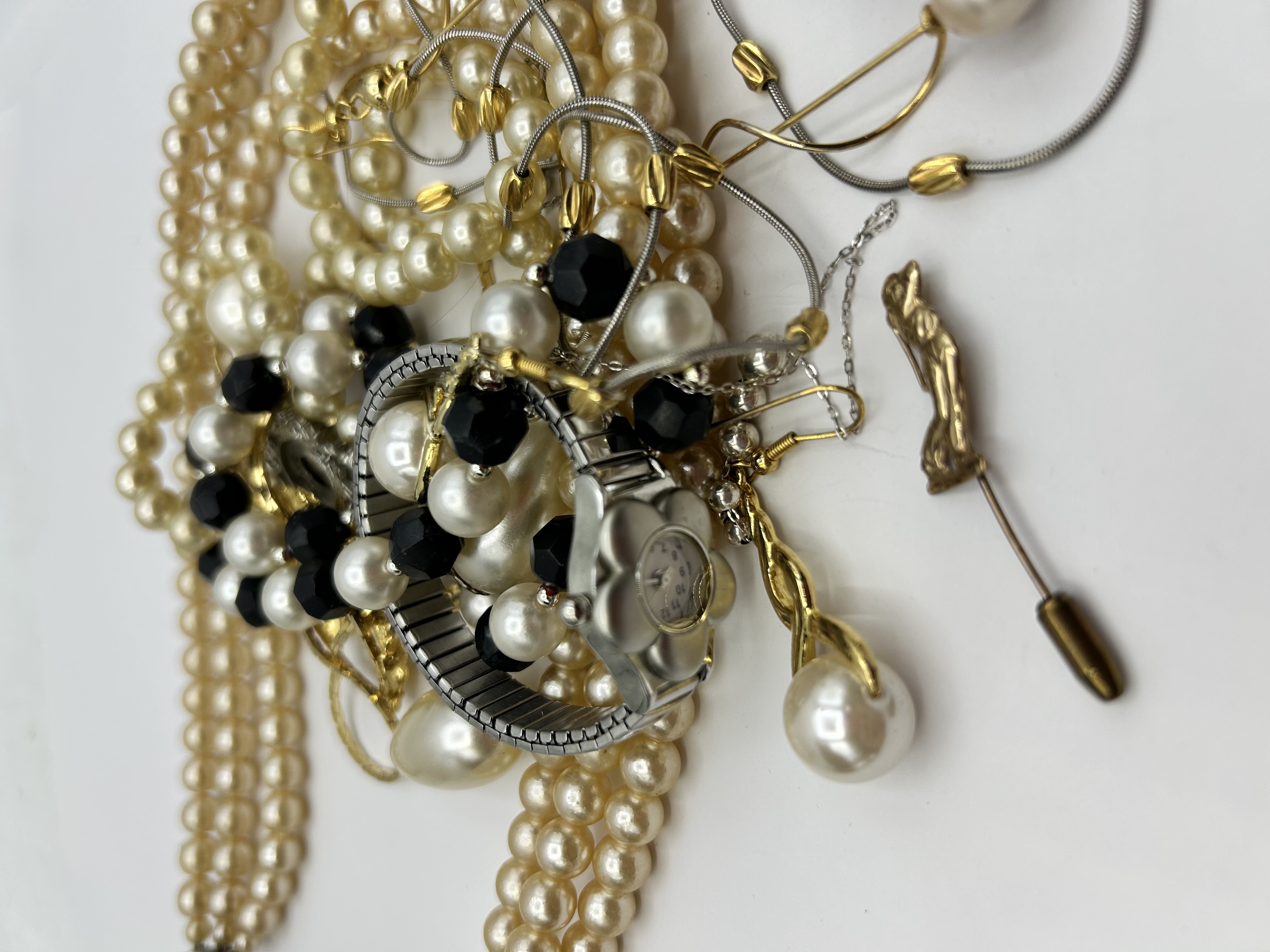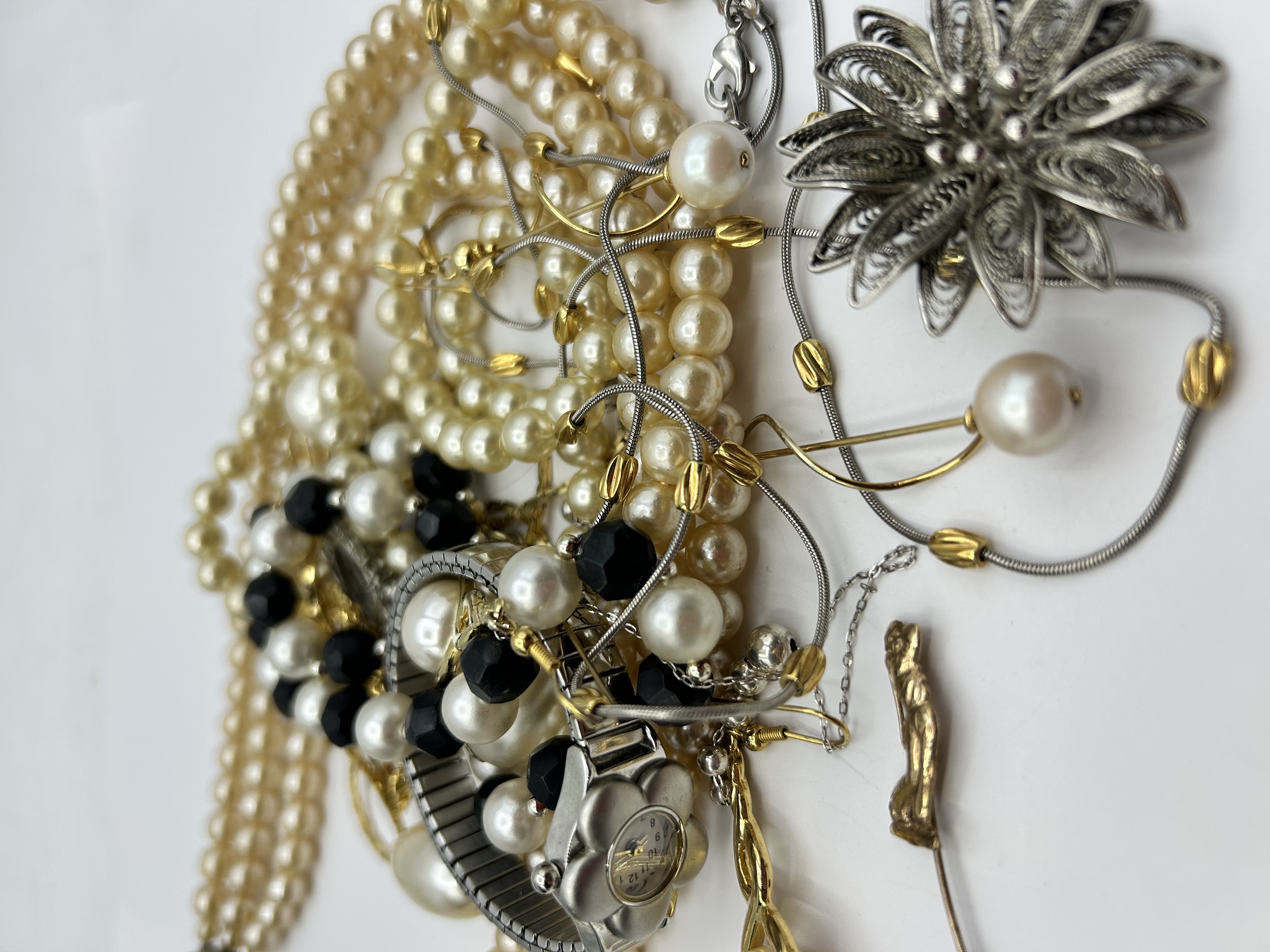 A collection of unbranded costume jewellery and fashion accessories. The group includes multiple strands of cream-coloured imitation pearl necklaces and a necklace featuring alternating white and black faceted beads. Also present are several fine-link white-metal snake chains with yellow-metal accents. The collection features a lady’s silver-tone wristwatch with a flower-shaped case, a white dial with Arabic numerals, and a flexible metal expansion band. Additional items include a large silver-tone filigree flower brooch and a yellow-metal stick pin with a terminal cast in the form of a seated figure. The items appear to be constructed from base metals with silver and gold-tone plating. Construction techniques include machine-made chains, strung beads, and cast metal elements. No legible hallmarks, purity stamps, or maker’s marks are visible on the pieces.