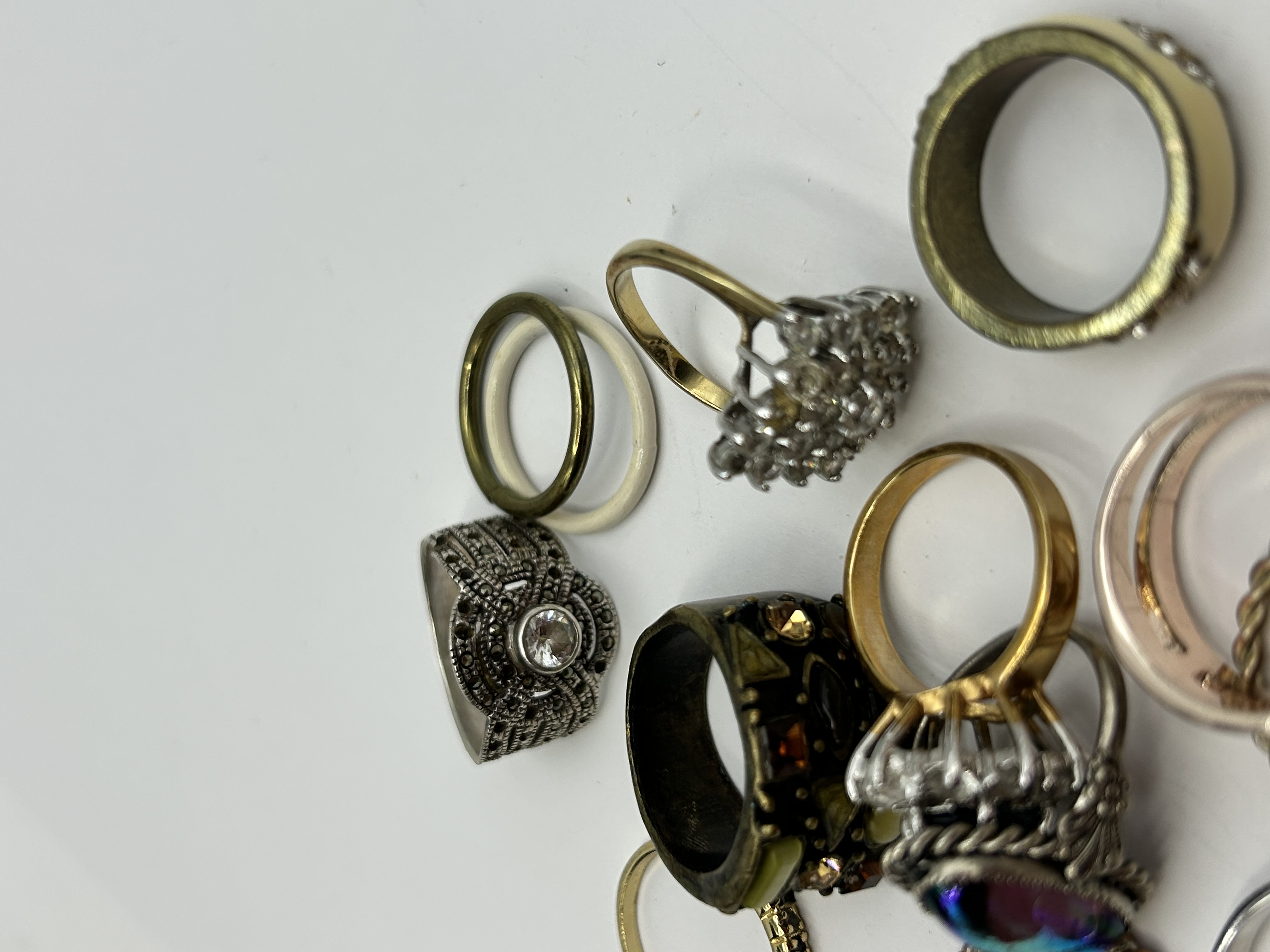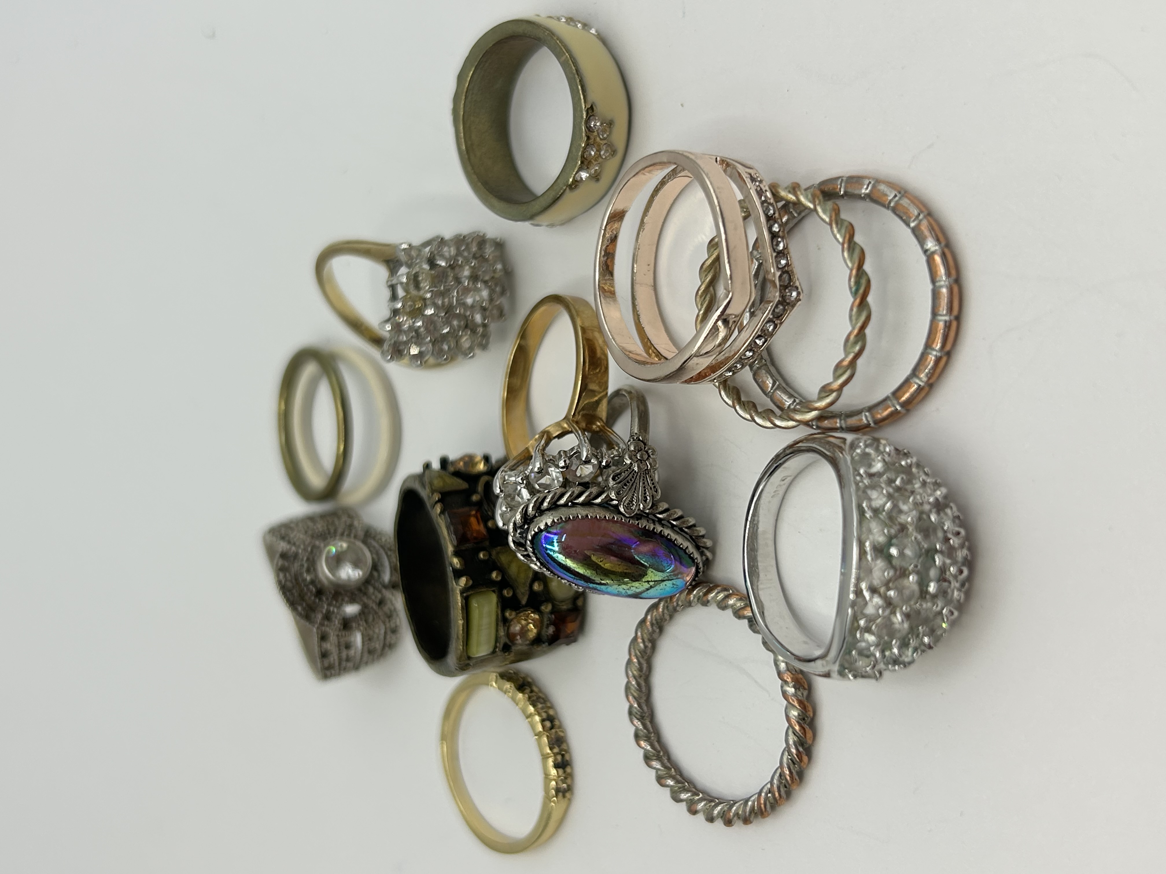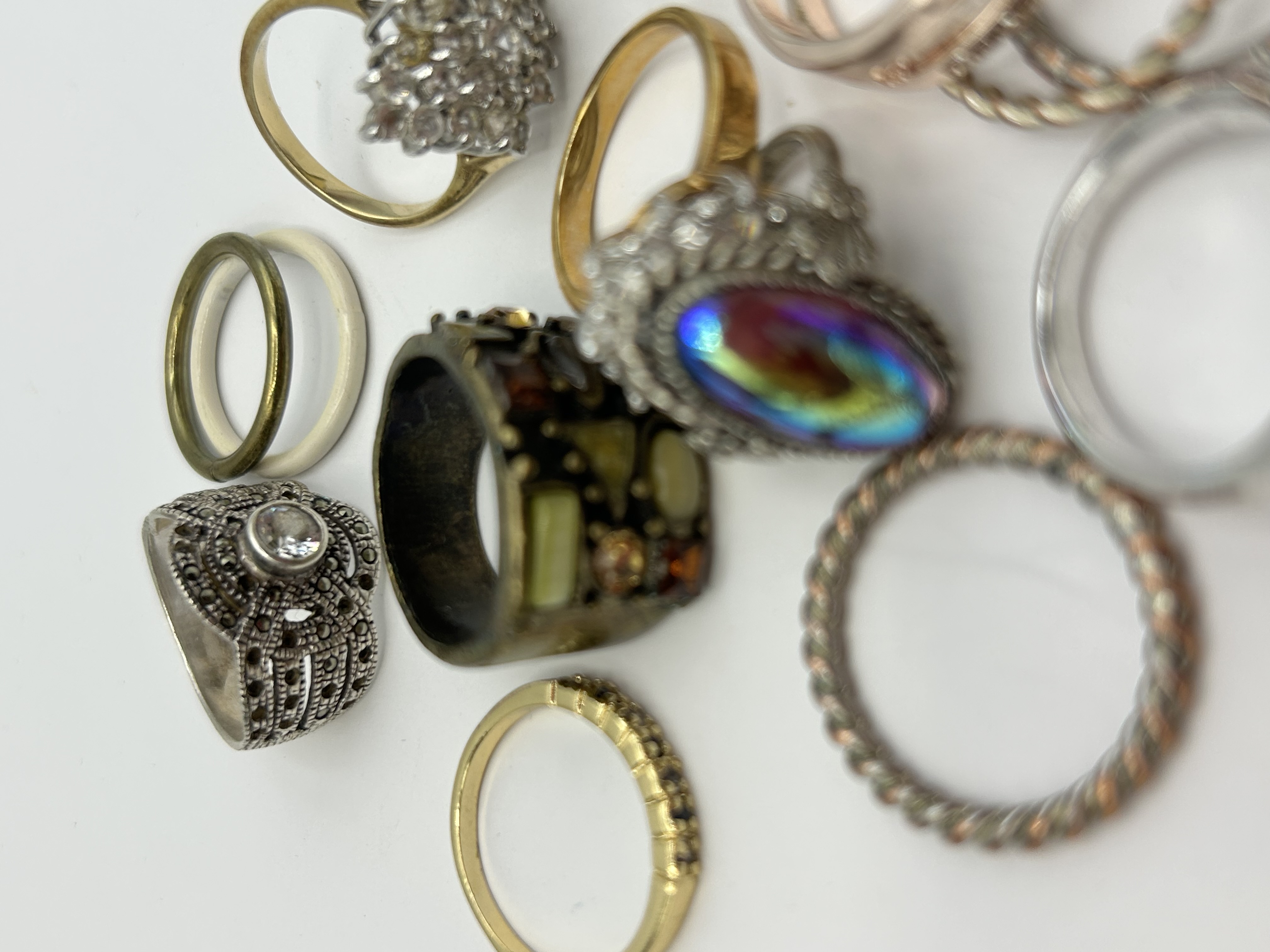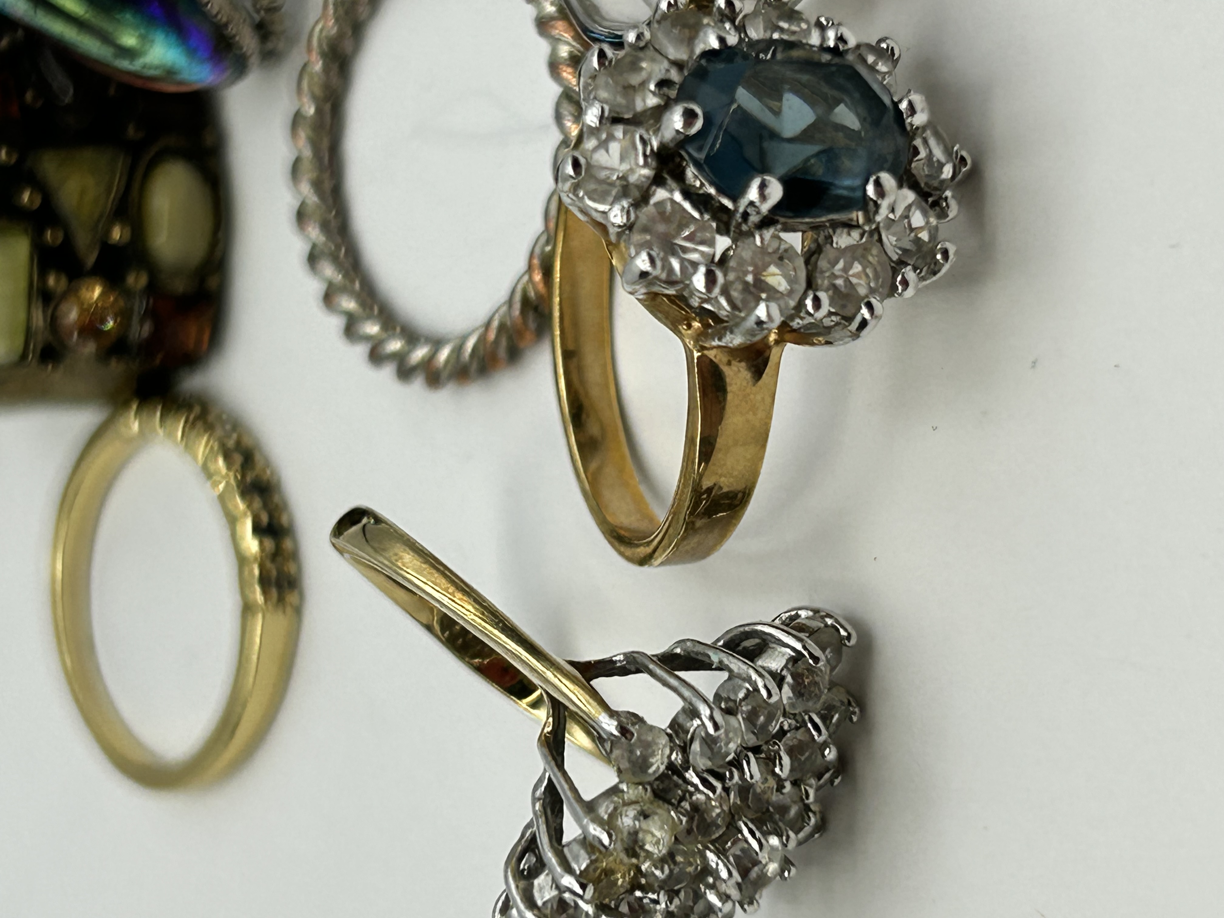 A collection of rings in various styles and finishes, including yellow, white, and rose-tone metals. The group features a yellow metal cluster ring set with an oval-cut faceted blue stone surrounded by clear stones,. Also included is a white metal dome-style cluster ring set with clear stones in a pavé setting, marked S925 for sterling silver. Other pieces comprise a wide patinated band set with rectangular green and amber-coloured cabochons, a pierced silver-tone ring in the marcasite style with a central clear stone, and a ring featuring a large oval iridescent stone in a decorative claw setting. The collection is completed by various stacking bands with twisted, textured, and smooth finishes. Gemstones appear to be a mix of paste, cubic zirconia, and synthetic or treated stones.