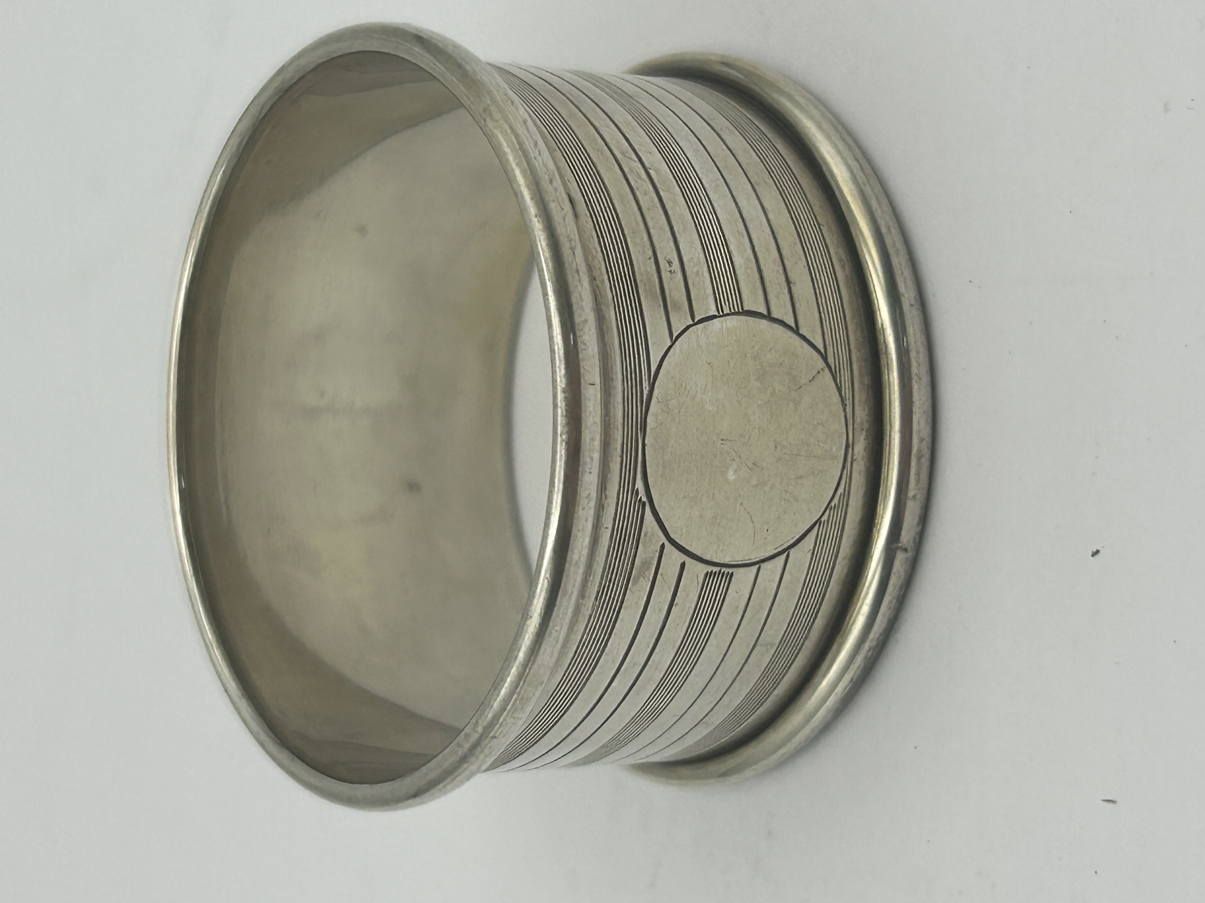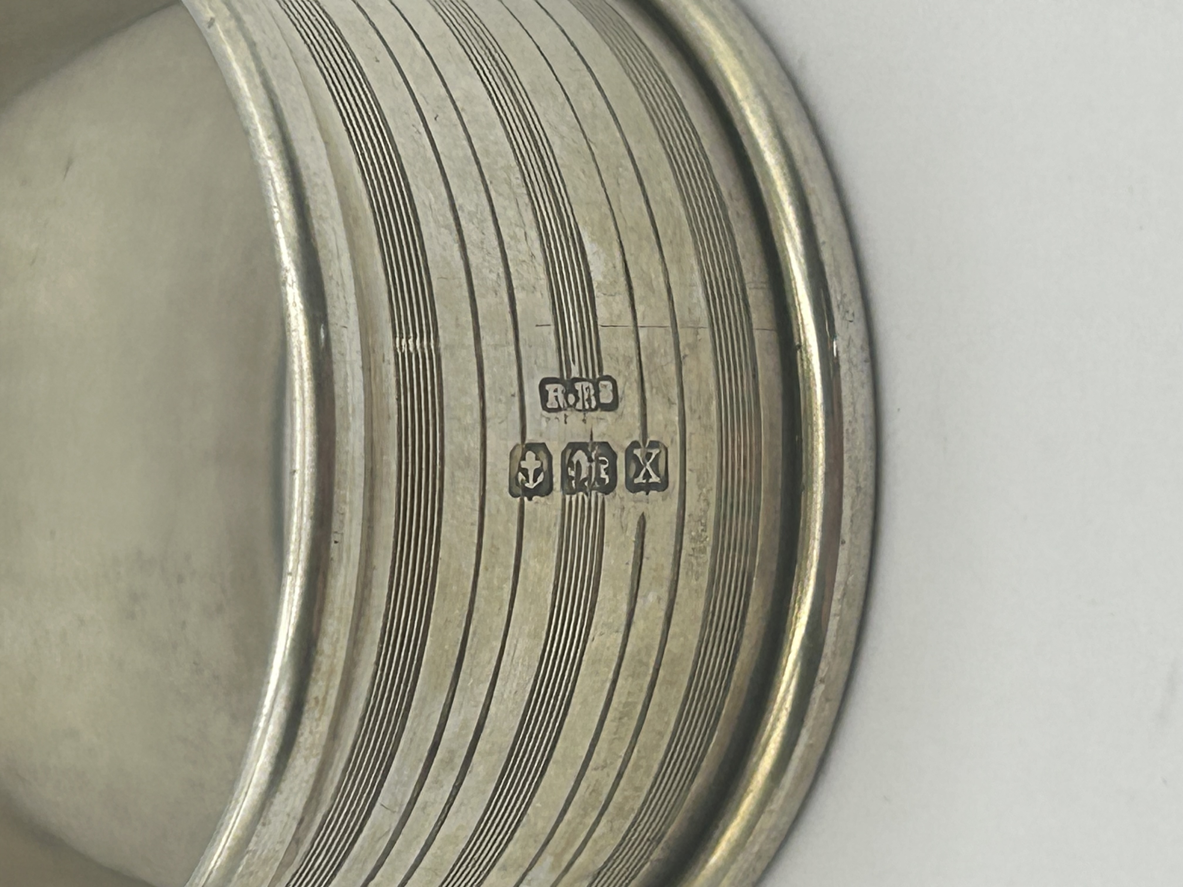 A solid sterling silver napkin ring of cylindrical form with rolled rims. The exterior features an engine-turned design consisting of parallel horizontal bands and a vacant circular cartouche. The interior is polished smooth. The item is fully hallmarked on the exterior body. Hallmarks: Maker mark R.B.B for R. B. Bell Ltd, anchor for Birmingham, lion passant for sterling silver, and date letter X for 1947.