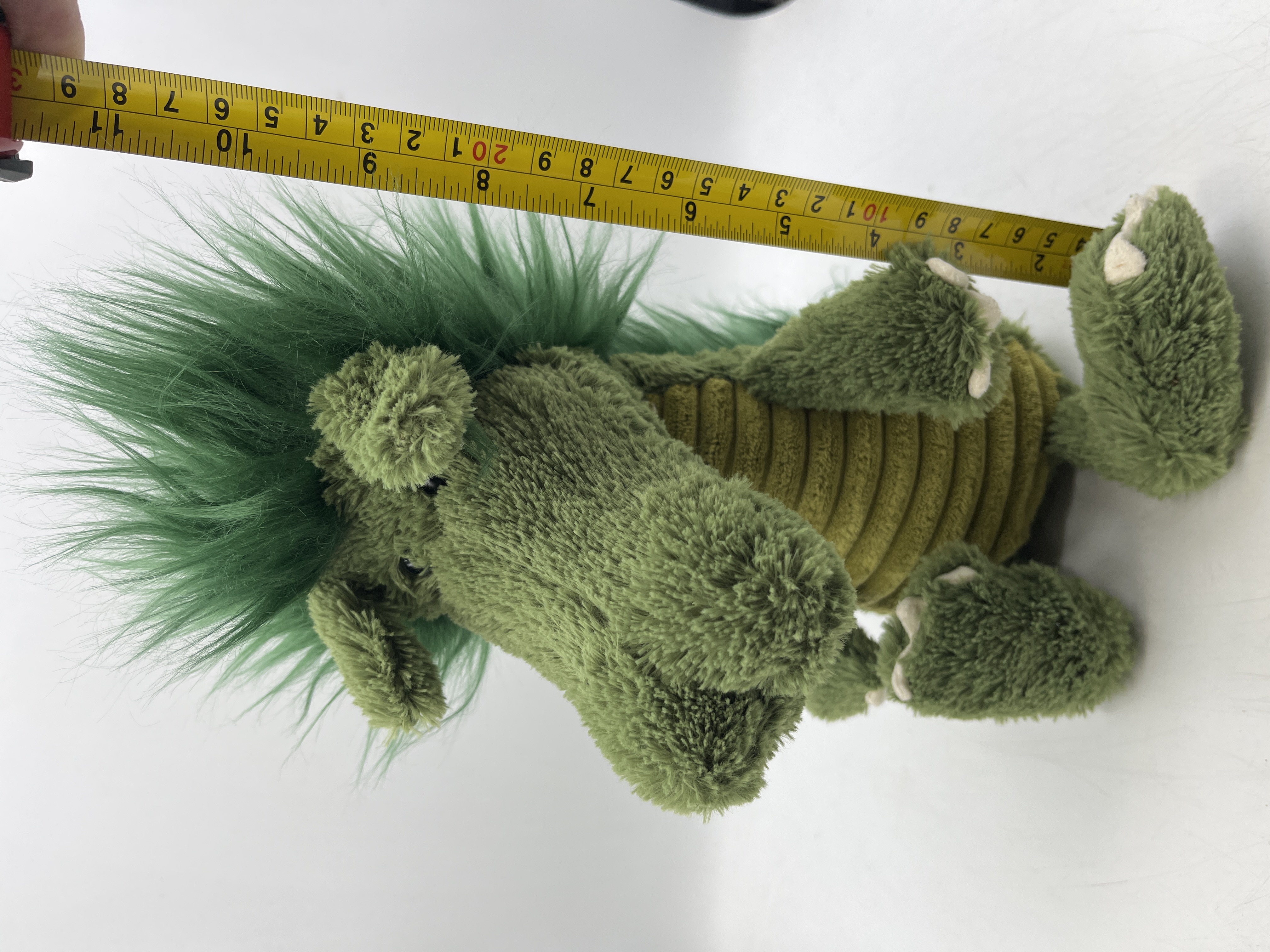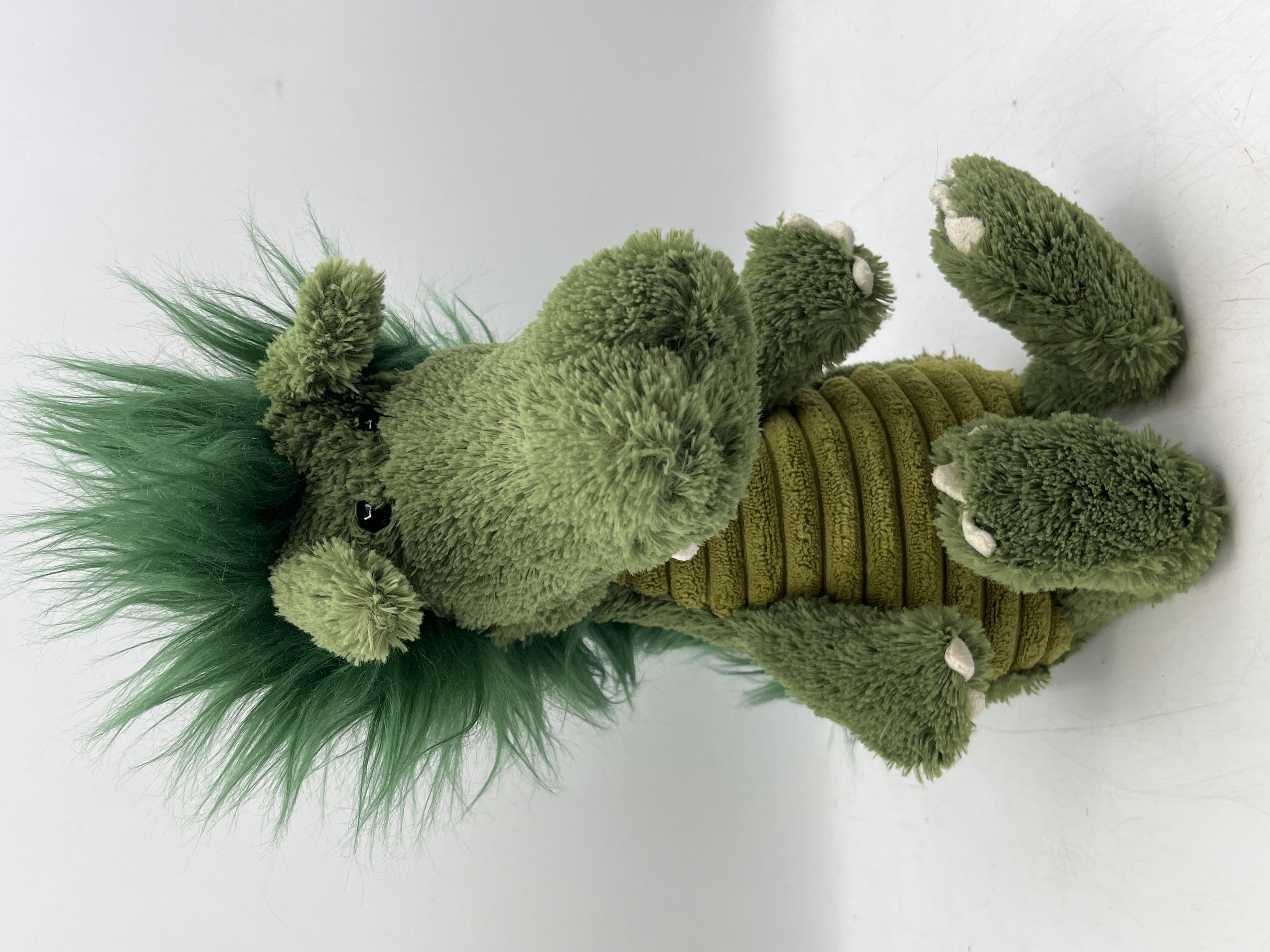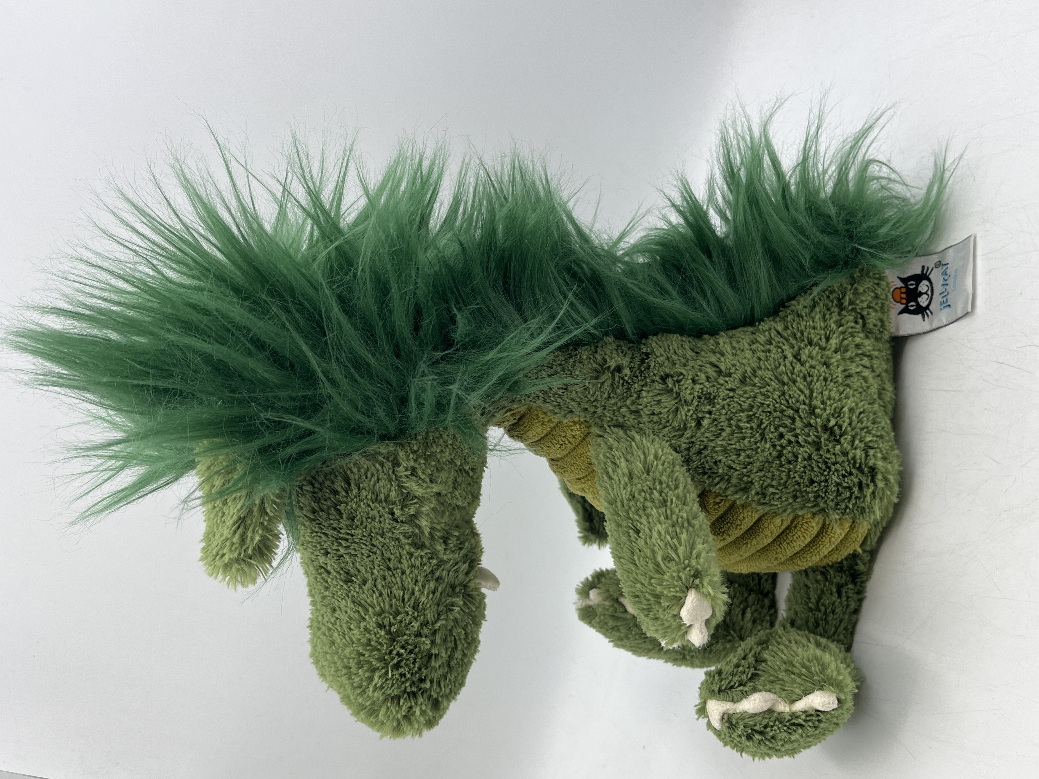 A Jellycat Dudley Dragon soft toy constructed from mixed plush fabrics. The item features a green textured main body with a yellow-green corduroy-style underbelly. A long, vibrant green faux fur mane runs along the head and spine. The toy includes felt-like claws on the feet and small rounded ears. A sewn-in fabric manufacturer label is attached, displaying the Jellycat black cat logo with orange ears and blue lettering for Jellycat London.
