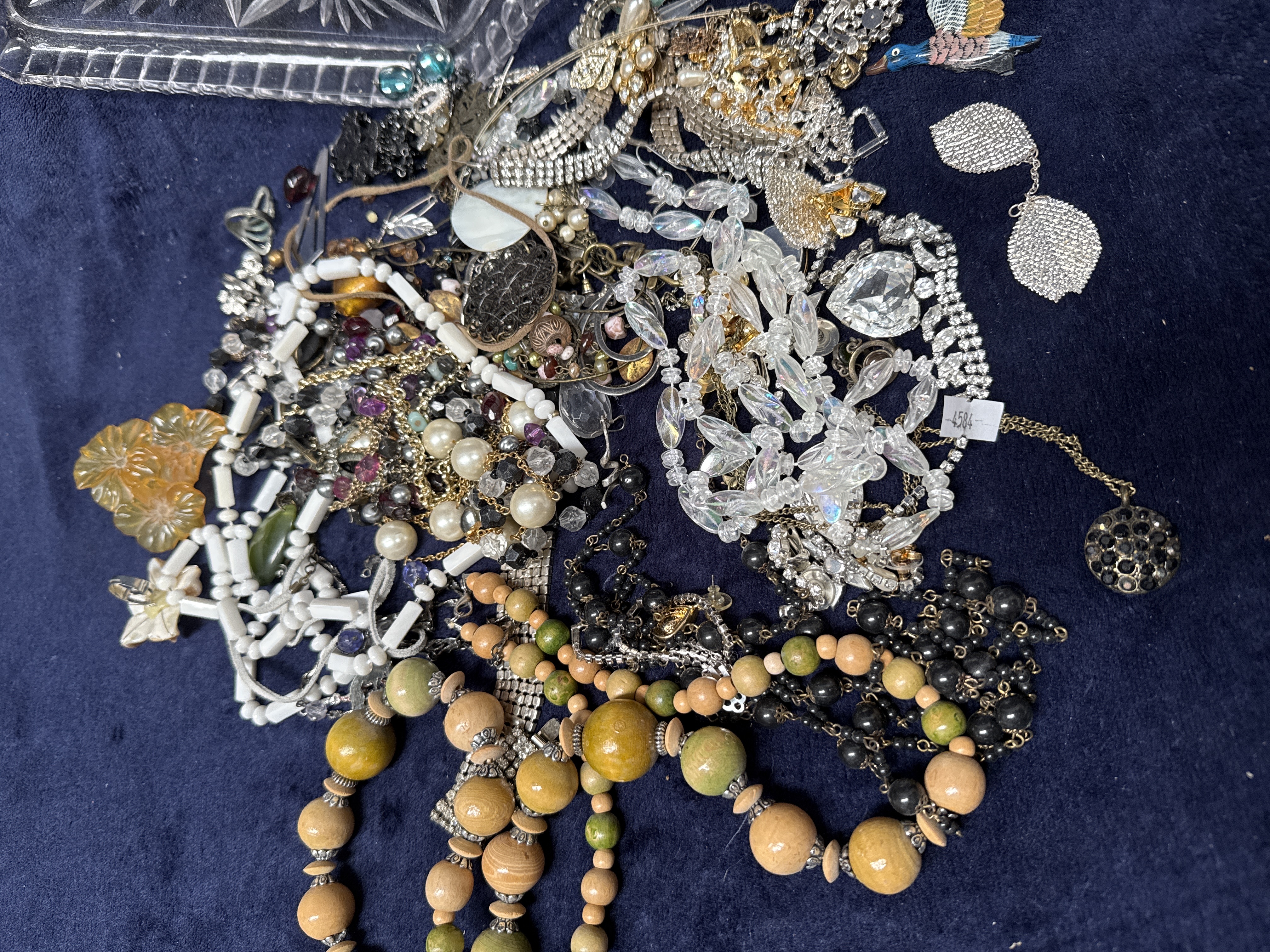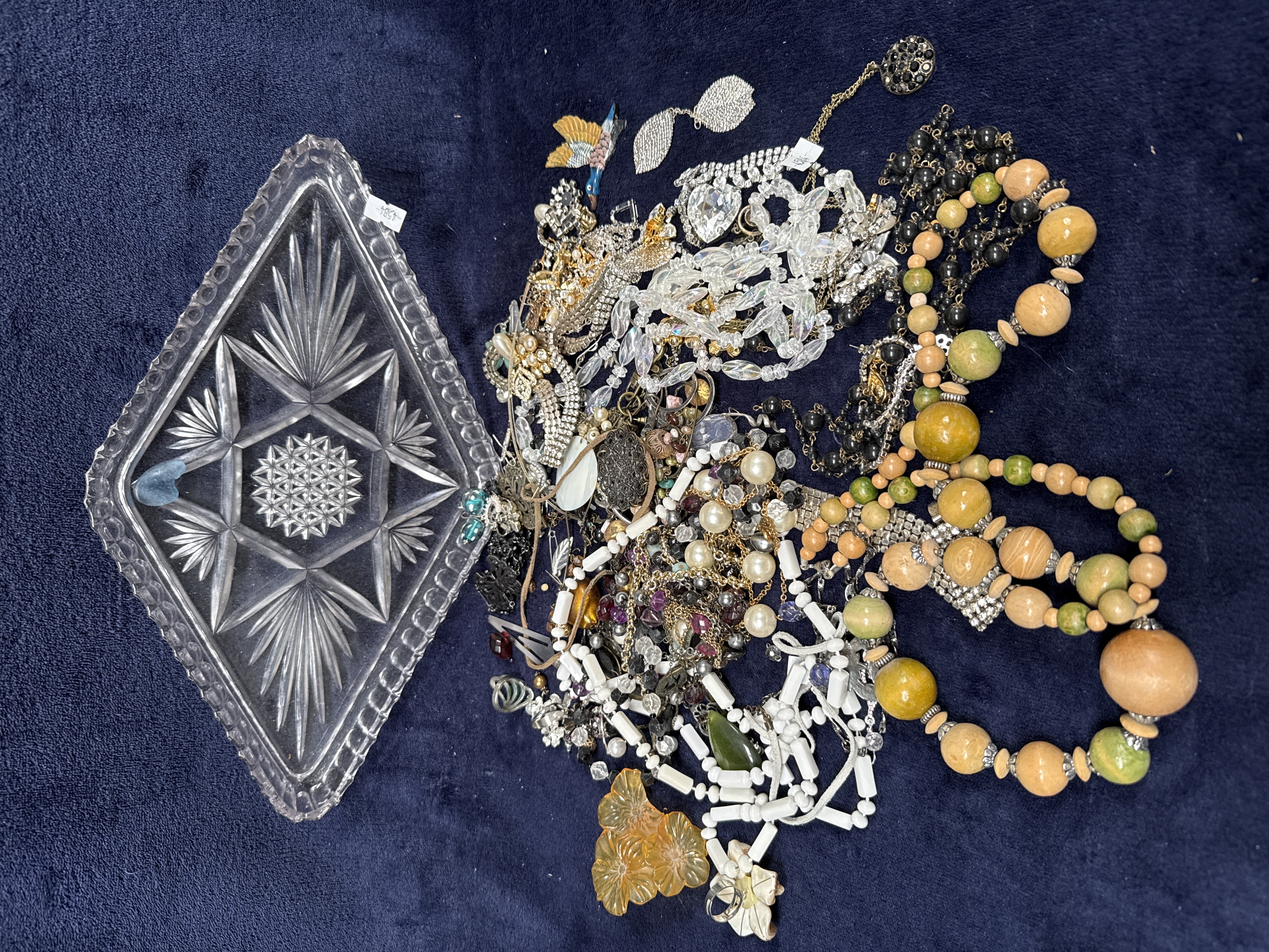 This lot comprises an assortment of vintage costume jewellery including pieces attributed to Sarah Coventry, accompanied by a decorative glass dish. The collection features a diverse range of 20th-century styles, from Art Deco-inspired rhinestone work to mid-century enamelled pieces and 1970s-style wooden items. Notable pieces include several beaded necklaces featuring wooden, faux pearl, and faceted glass beads; a large amber-coloured moulded resin floral brooch; and an enamelled bird brooch depicting a kingfisher-style bird in blue, pink, and yellow. The lot also contains various silver-tone and gold-tone items set with clear and coloured rhinestones, including a pair of leaf-shaped clips and a clear faceted glass beaded necklace. The accompanying glassware is a diamond-shaped clear pressed glass dish featuring a central multi-pointed star motif surrounded by diamond-cut patterns and a notched rim. Materials include base metals, rhinestones, faux pearls, faceted glass, moulded resin, wood, and enamel. Small white paper adhesive tags with the handwritten characters 4584– are present on some items.