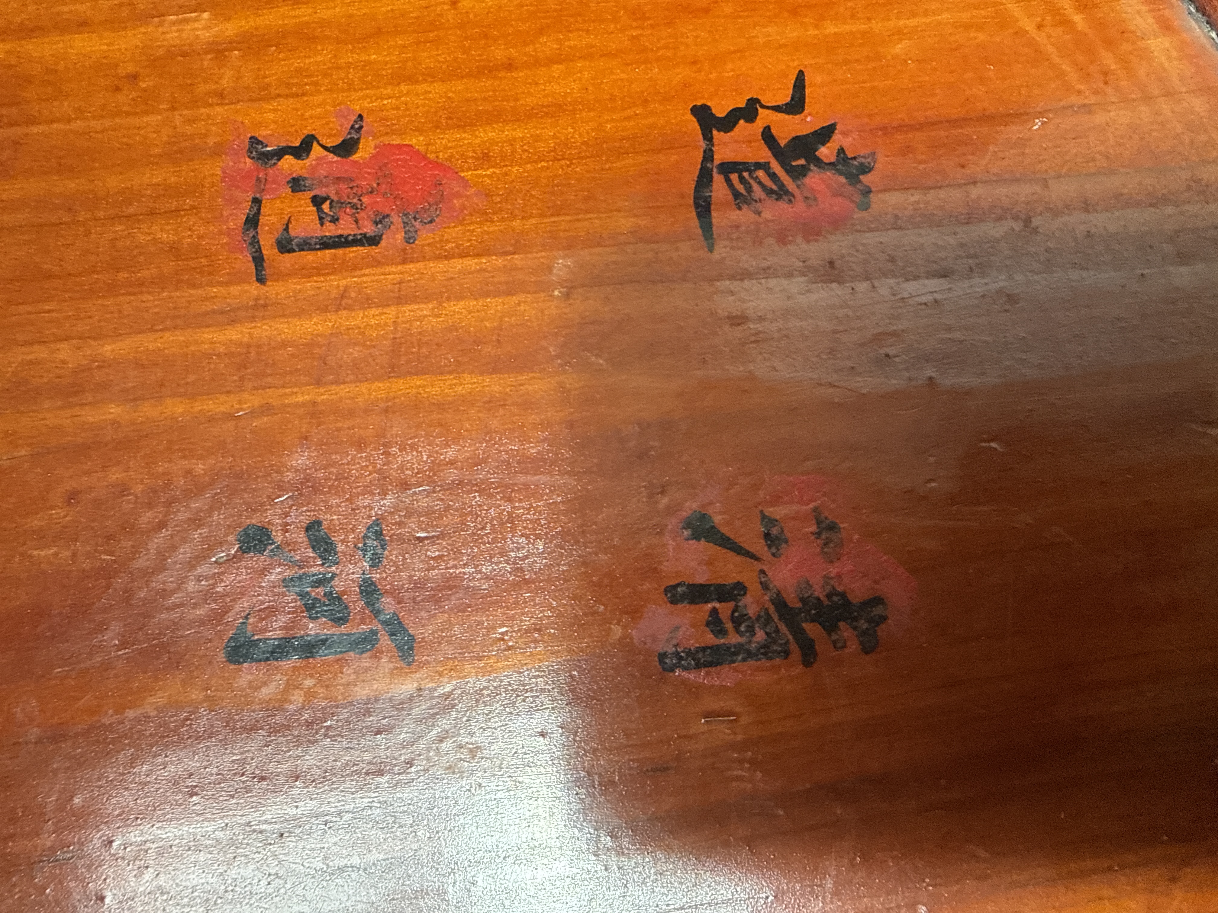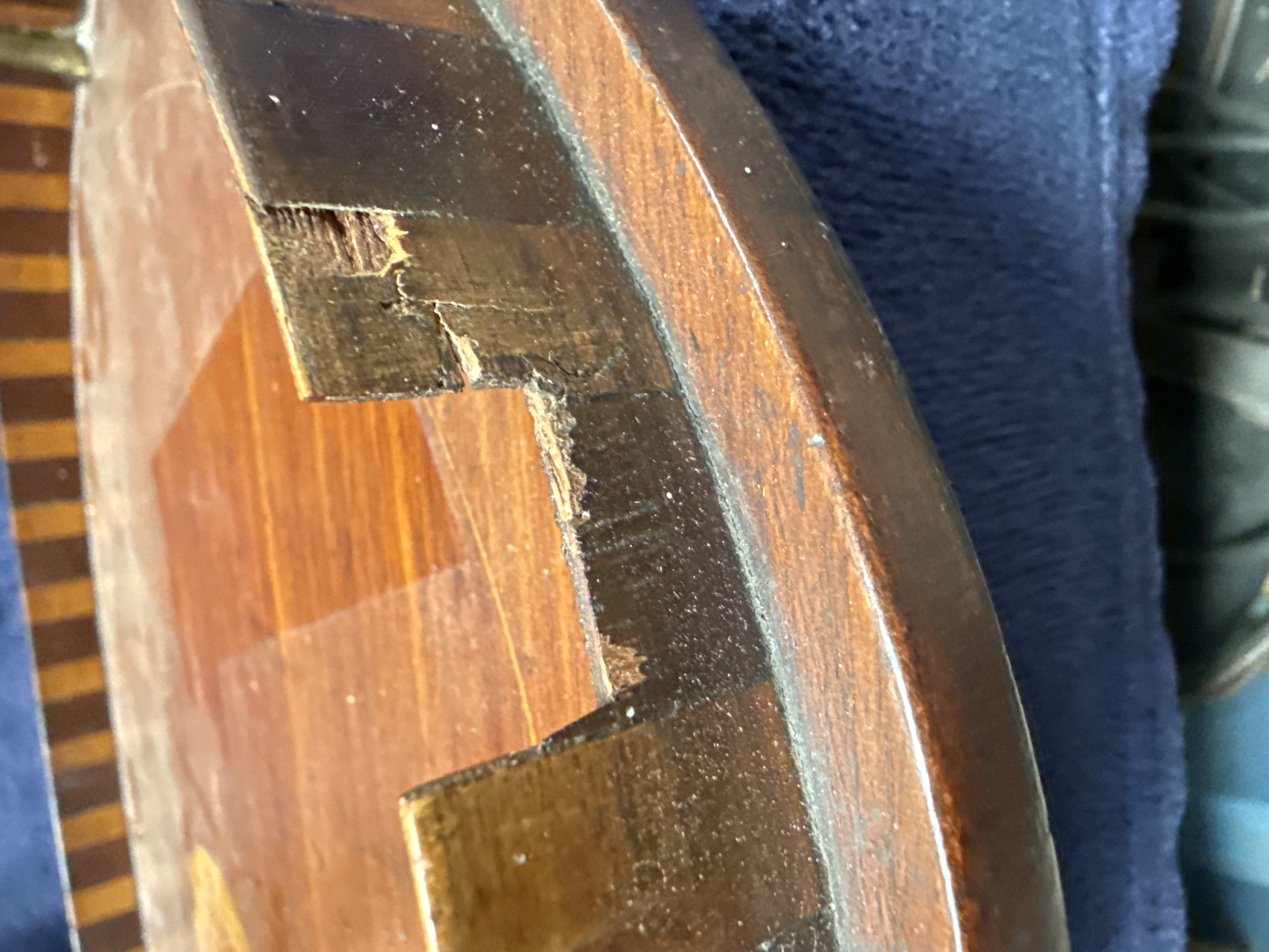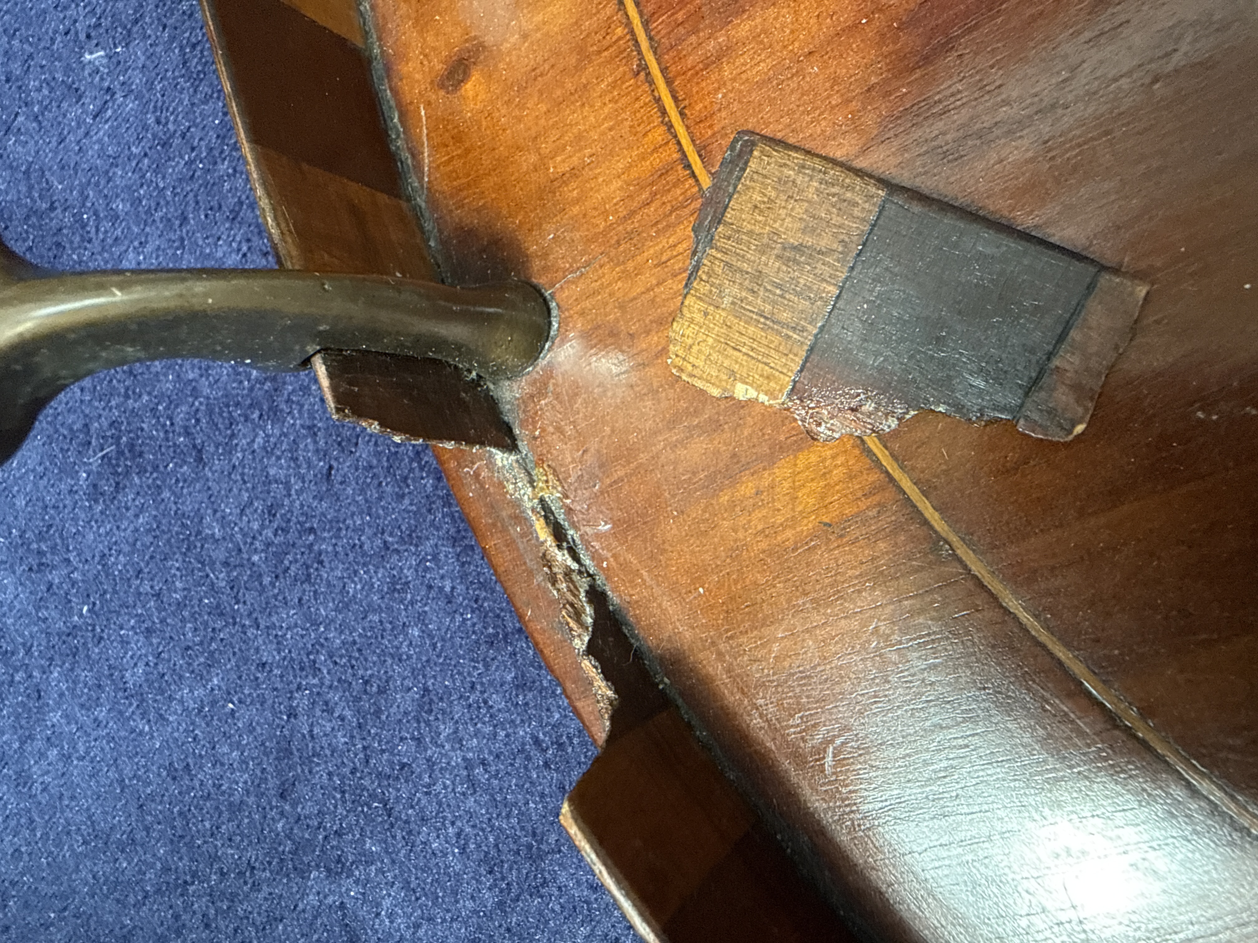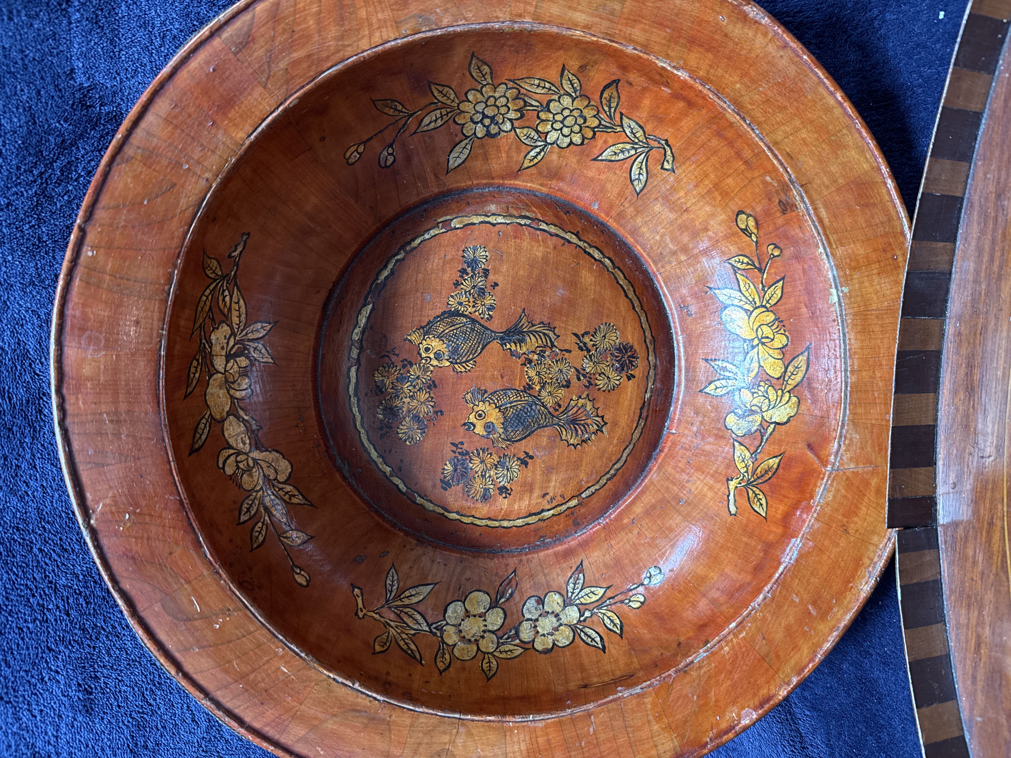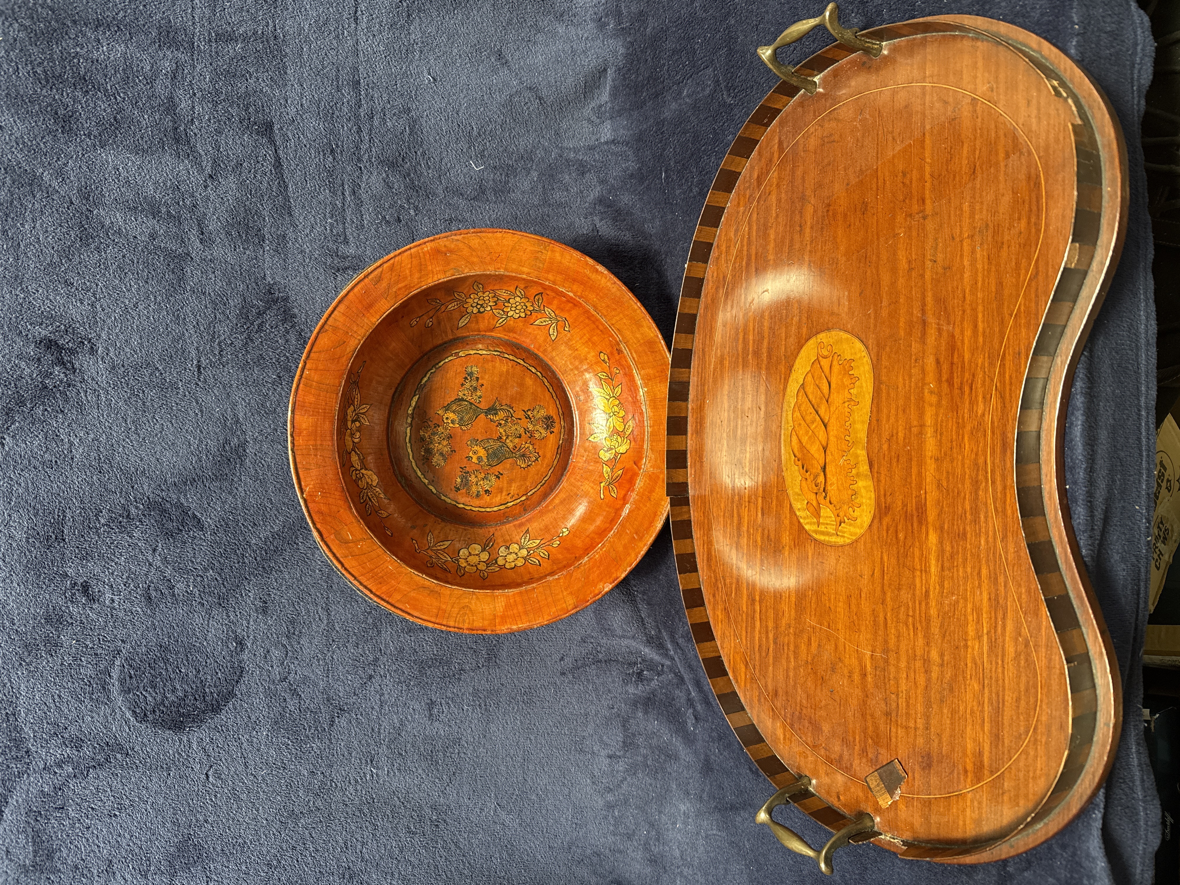 A collection of two wooden items consisting of a reniform serving tray and a circular bowl. The tray is designed in the Edwardian style with marquetry inlay, featuring a central conch shell motif set within an oval cartouche and a chequered gallery border. It is fitted with two brass handles. The underside of the tray bears four characters in Chinese script. The circular bowl is decorated with Chinoiserie motifs, including a central medallion depicting two fish and four floral sprays distributed around the interior rim.
