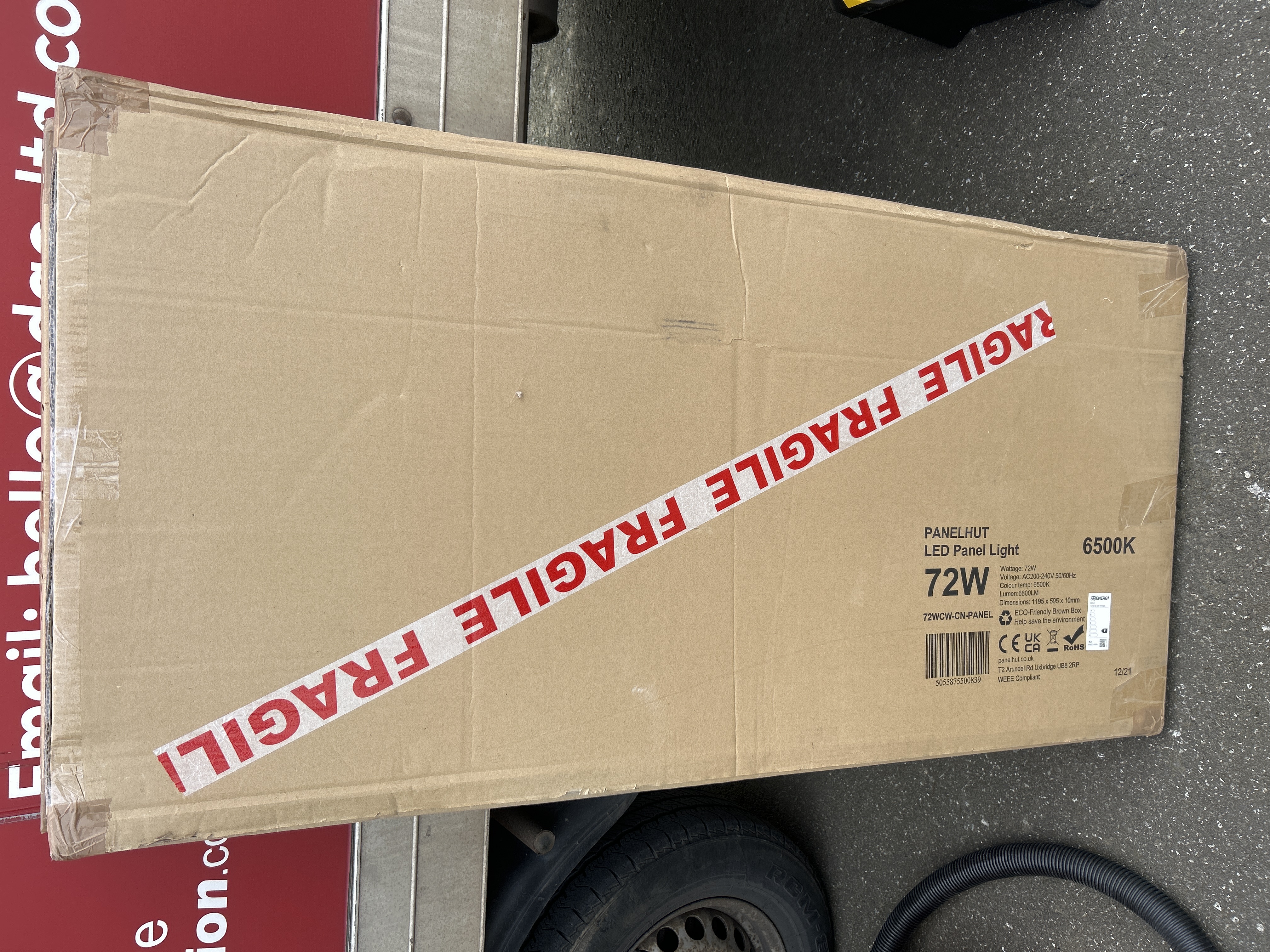 A Panelhut LED panel light, model number 72WCW-CN-PANEL. The unit is designed for industrial or commercial use with a power output of 72W and a colour temperature of 6500K (cool white), producing 6800 lumens. The manufacturer’s specifications indicate an operating voltage of AC200-240V at 50/60Hz. The packaging displays various compliance marks including CE, UK CA, RoHS, and the WEEE symbol. The item is housed in its original manufacturer’s cardboard box, which includes the company’s web address and a date stamp of 12/21.