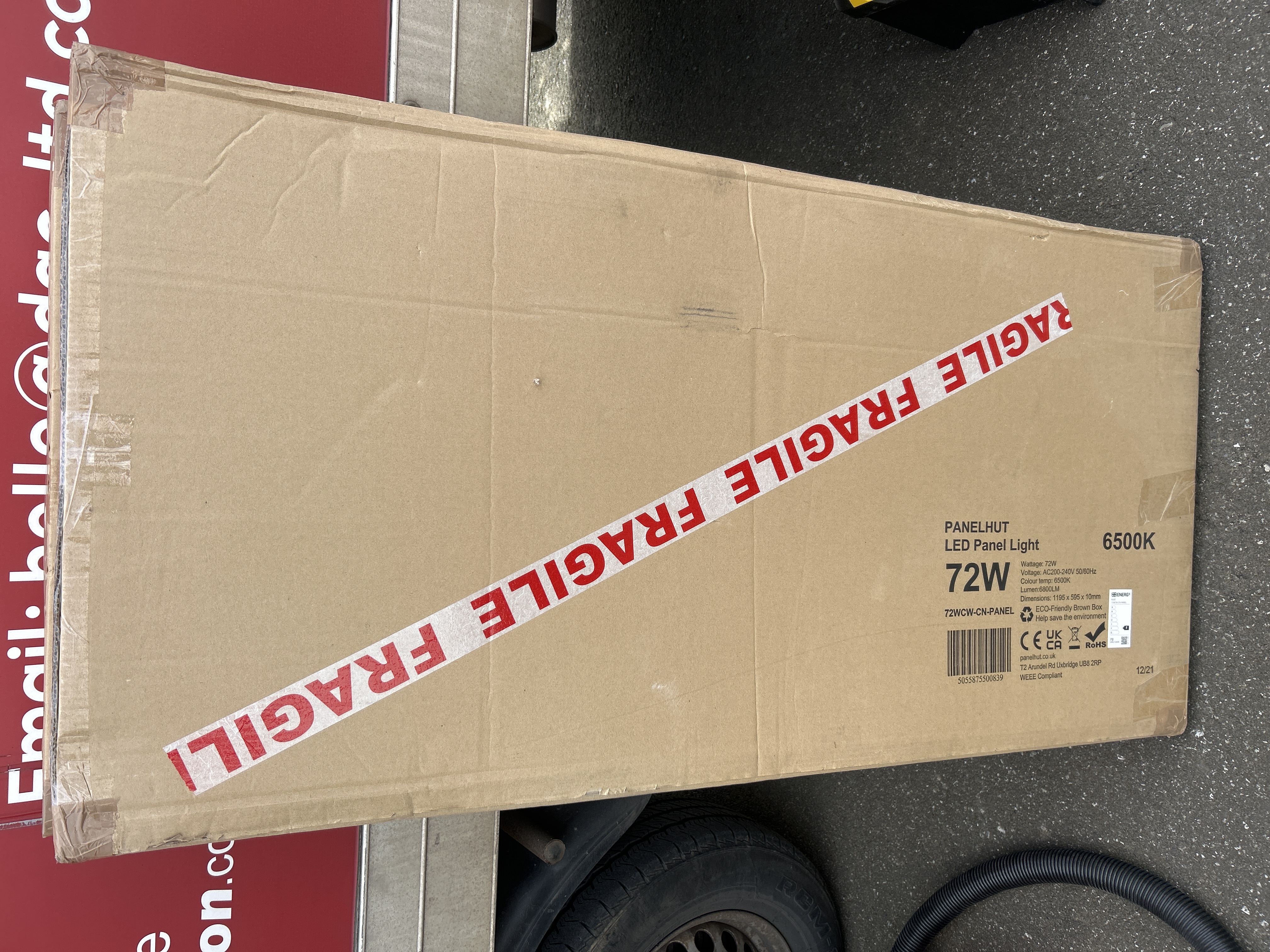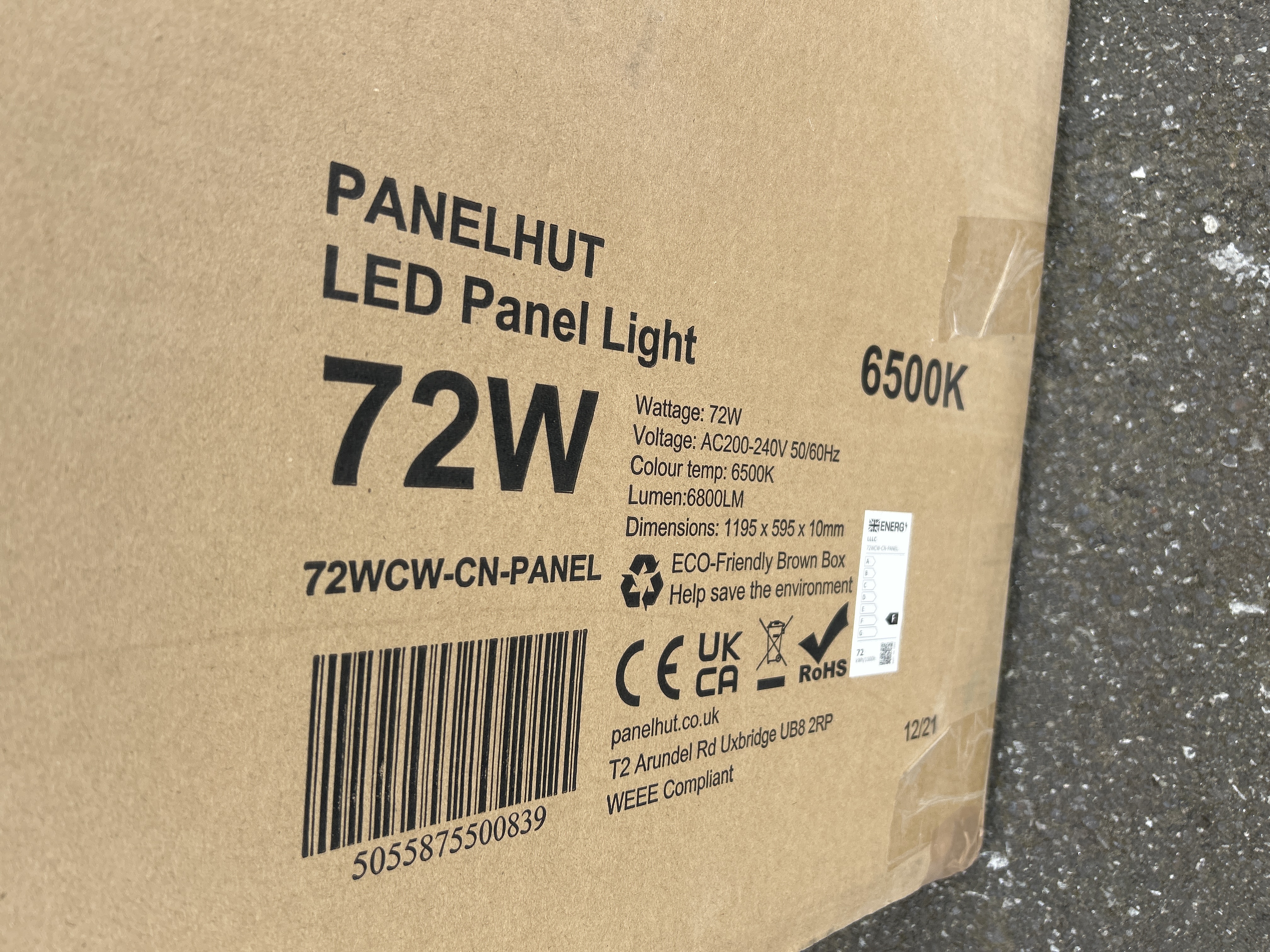 A single Panelhut LED panel light, model number 72WCW-CN-PANEL. The unit is specified with a 72W power rating, a colour temperature of 6500K, and a lumen output of 6800LM. Technical data on the packaging indicates an operating voltage of AC200-240V 50/60Hz. The item is contained within its original manufacturer brown cardboard packaging. External markings include barcode 5055875500839, CE, UK CA, and RoHS compliance symbols, and a WEEE compliance statement. The box also displays a production batch date of 12/21 and identifies the manufacturer as panelhut.co.uk, based in Uxbridge, UK.