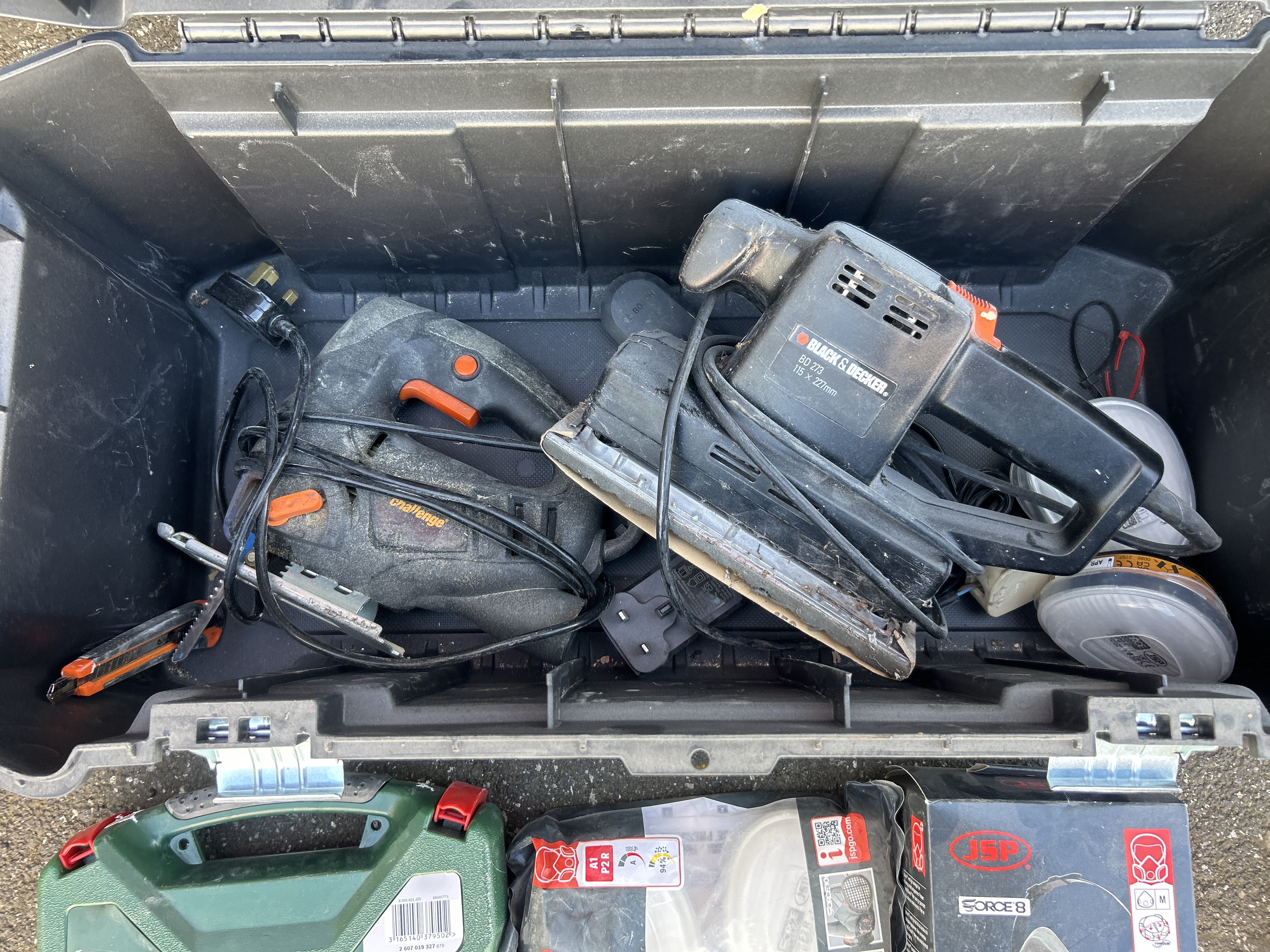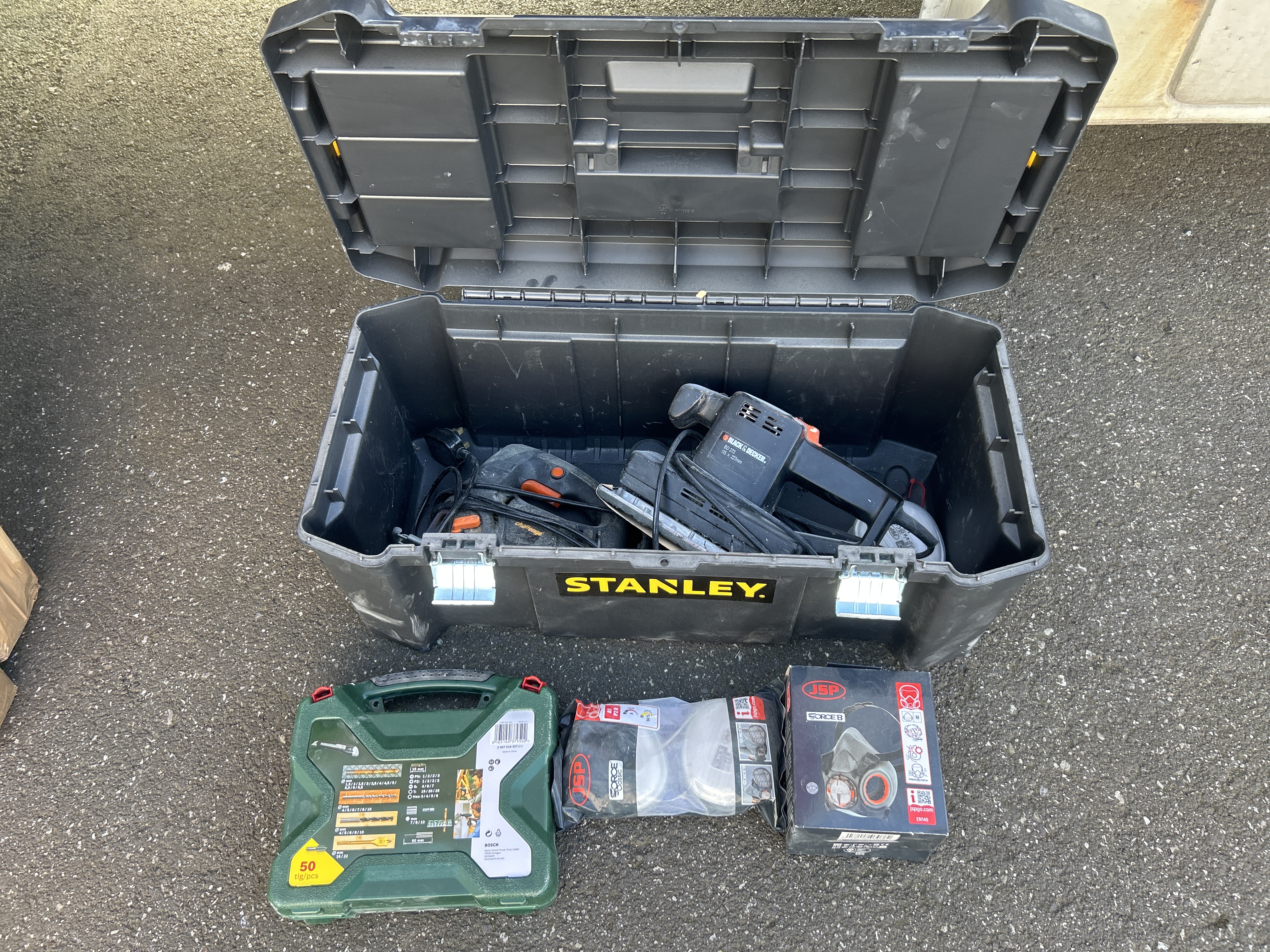 A collection of power tools and workshop accessories housed within a Stanley Essential black plastic toolbox featuring metal latches and yellow branding. The lot includes a Black & Decker corded orbital sander, model BD 273, specified for 115 x 227mm sheets, and a Challenge corded electric jigsaw with orange manufacturer markings. Also included is a Bosch 50-piece drill and screwdriver bit set, manufacturer code 2 607 019 327 879, contained in a green plastic carry case. Safety equipment consists of a JSP Force 8 half-mask respirator, comprising one unit in its original box and a separate pair of sealed filters. A retractable utility knife is included as an accessory. Power tools are equipped with standard UK 3-pin plugs.