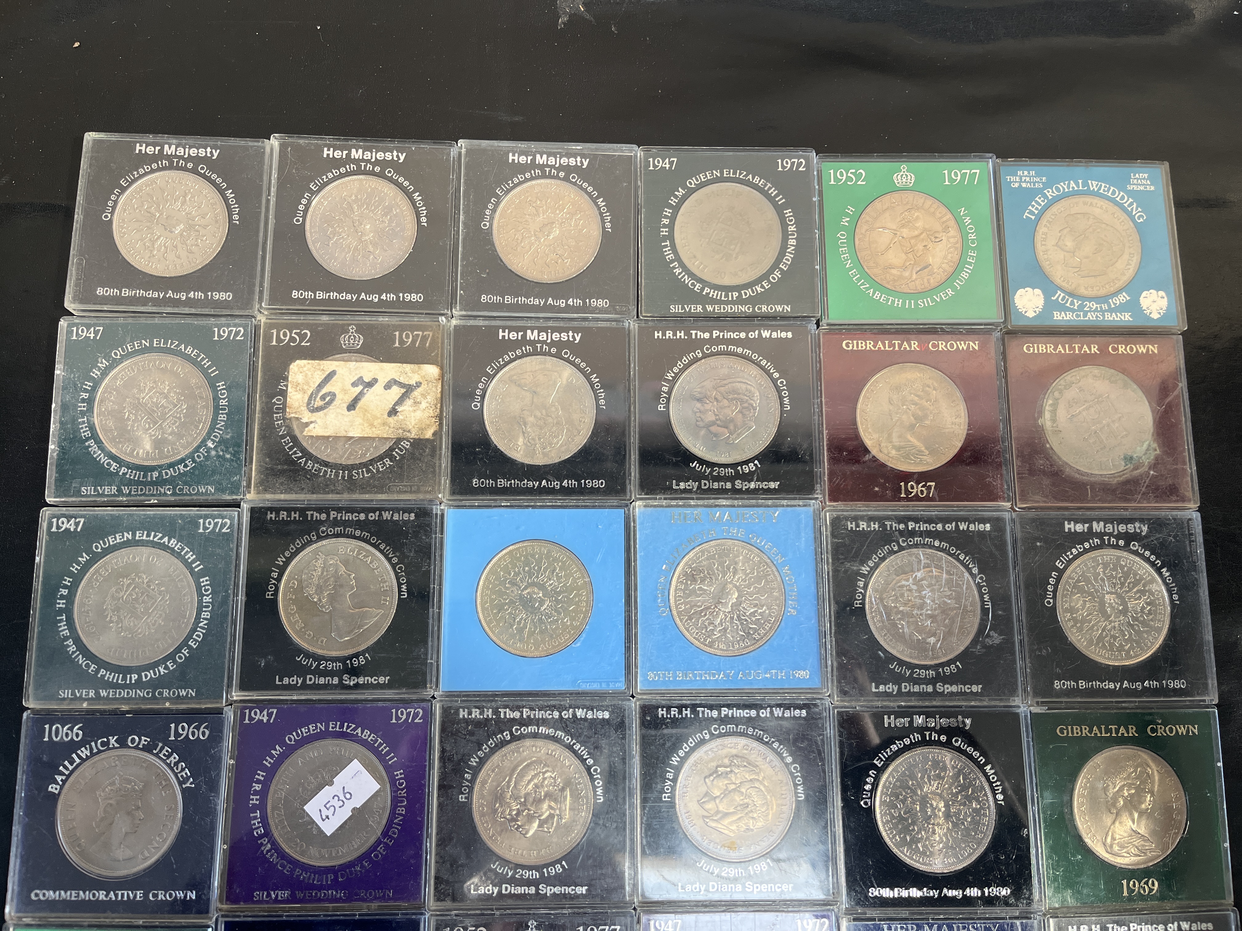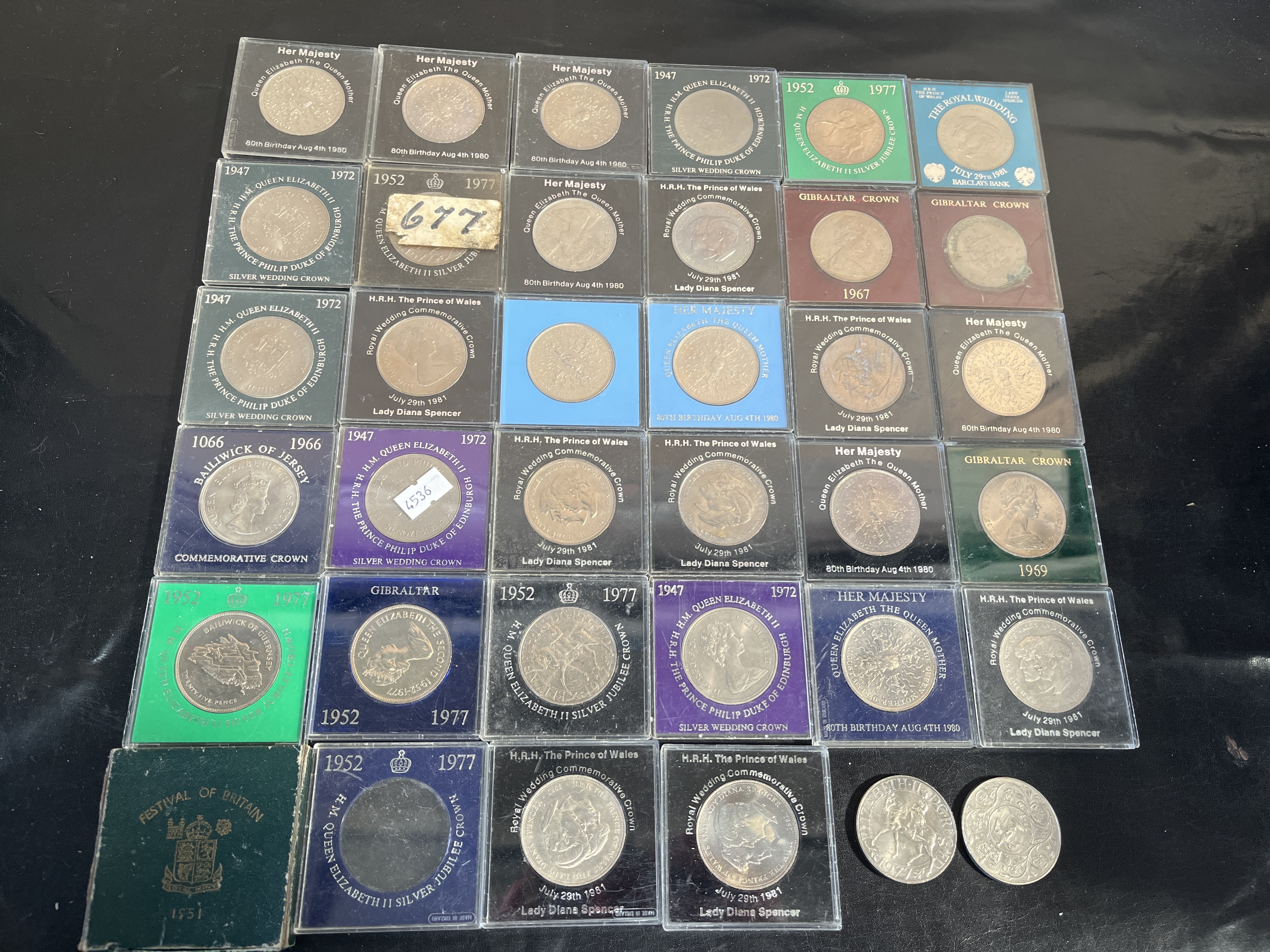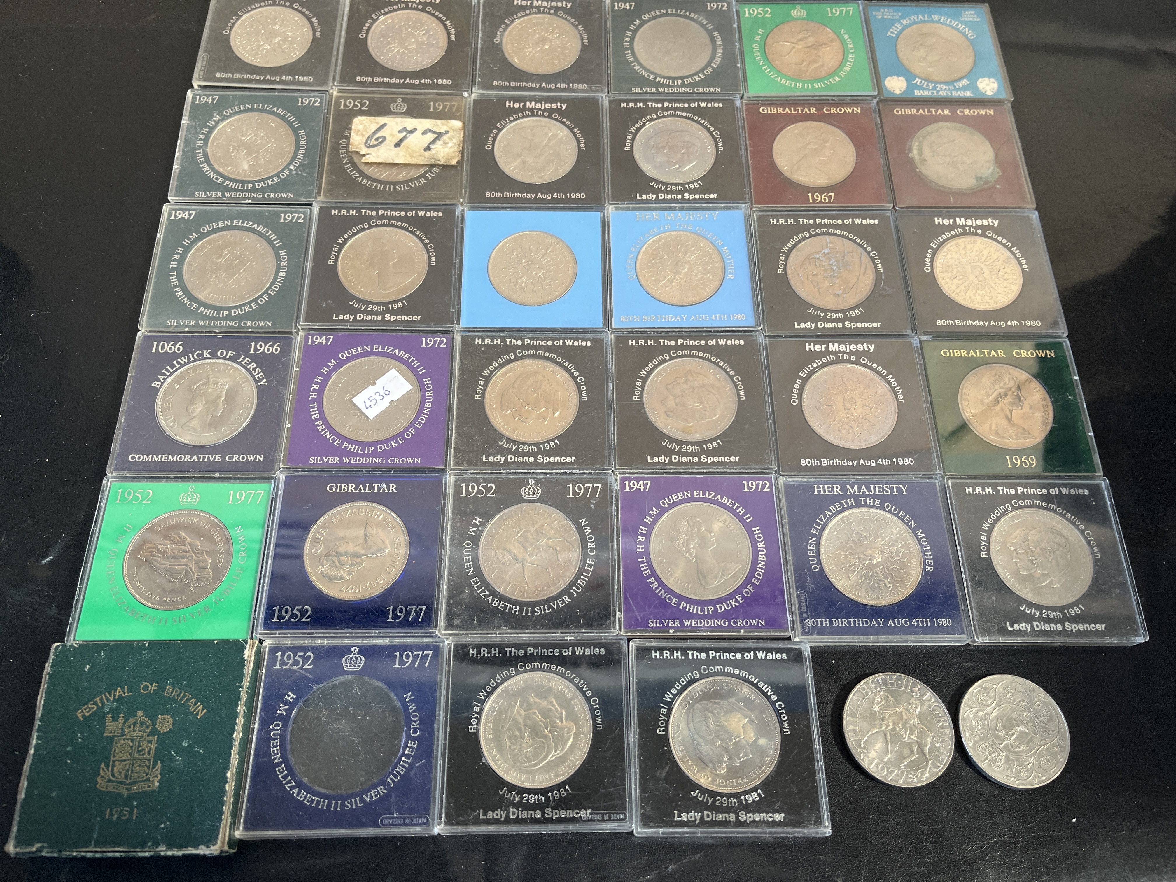 A collection of commemorative crowns and twenty-five pence coins from the UK and various British territories including Gibraltar, Jersey, and Guernsey. The group features multiple commemorative issues including the 1972 Silver Wedding, the 1977 Silver Jubilee, the 1980 80th Birthday of Queen Elizabeth the Queen Mother, and the 1981 Royal Wedding of Prince Charles and Lady Diana Spencer. Specific regional issues include a 1966 Bailiwick of Jersey commemorative crown, Gibraltar crowns dated 1967 and 1969, and a 1977 Bailiwick of Guernsey twenty-five pence coin. Also included is a 1951 Festival of Britain crown in its original green presentation box and two loose 1977 Silver Jubilee crowns. The coins are struck in cupro-nickel with a silver-coloured finish. Most items are presented in individual square plastic capsules with descriptive paper inserts, some featuring handwritten labels.