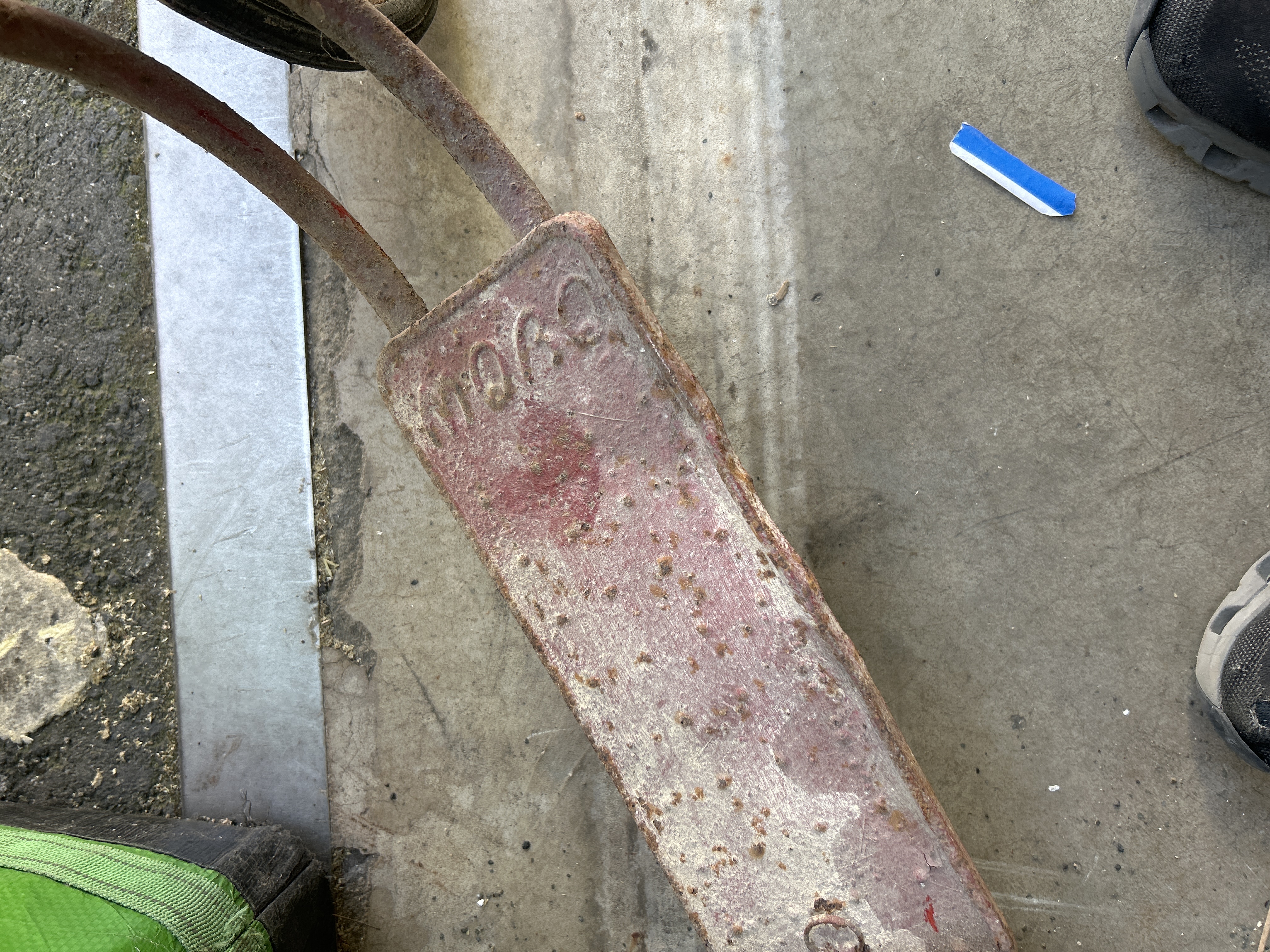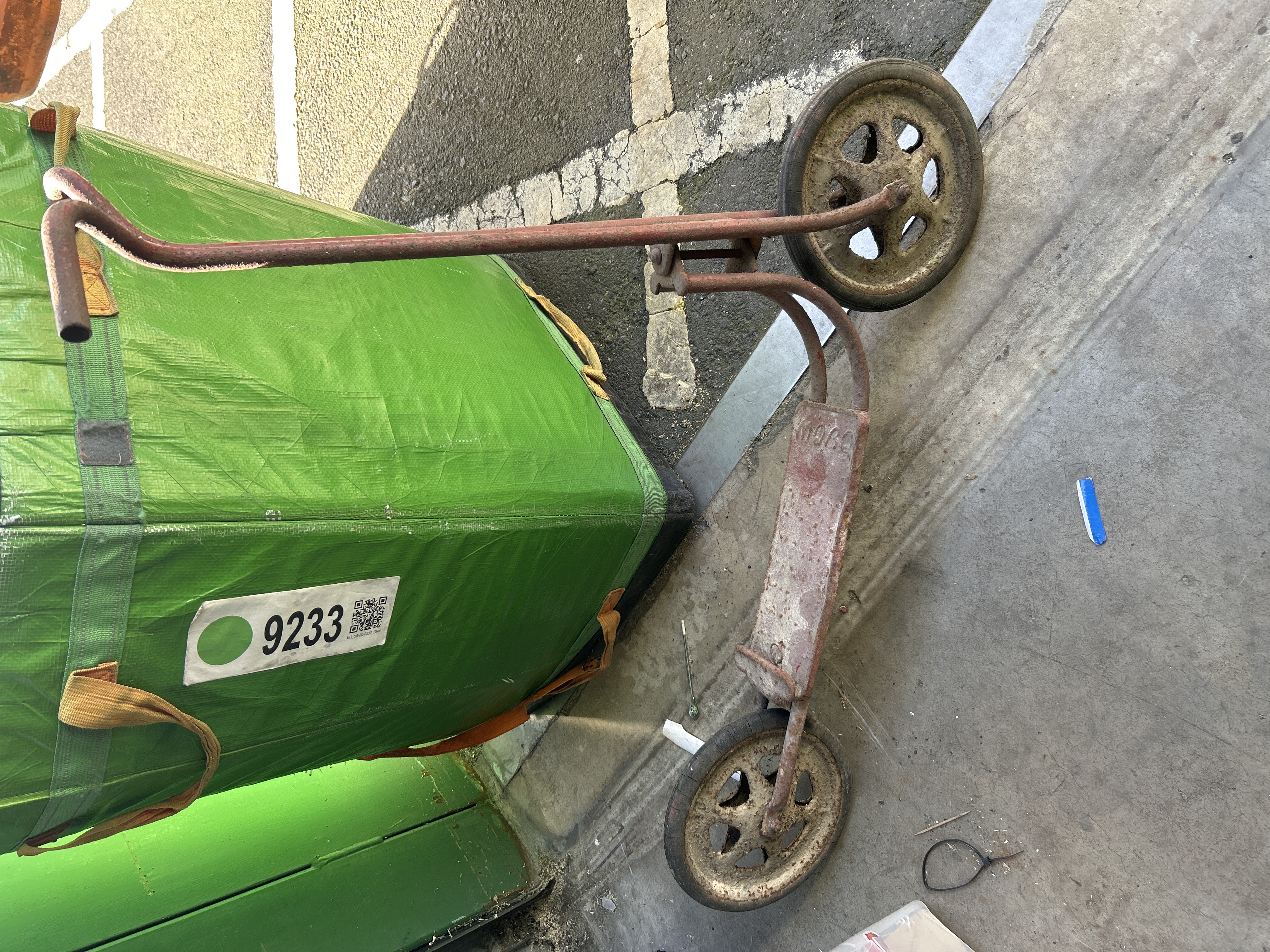 A vintage child’s kick-propulsion scooter manufactured by D. Sebel & Co. Ltd. under the Mobo brand. The item is constructed with a tubular steel frame and a textured cast metal footplate. The footplate features embossed raised lettering reading MOBO. The scooter is fitted with two metal wheels with spoked rims and solid rubber tyres. Traces of the original red paint finish remain visible.